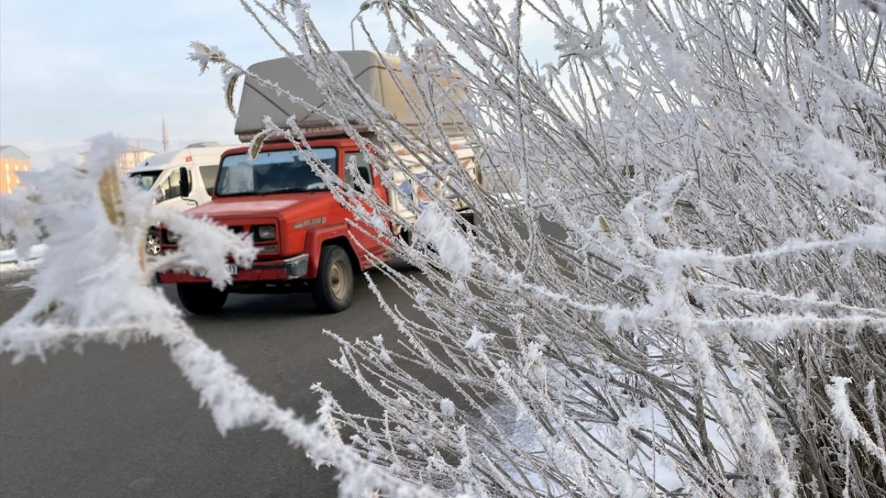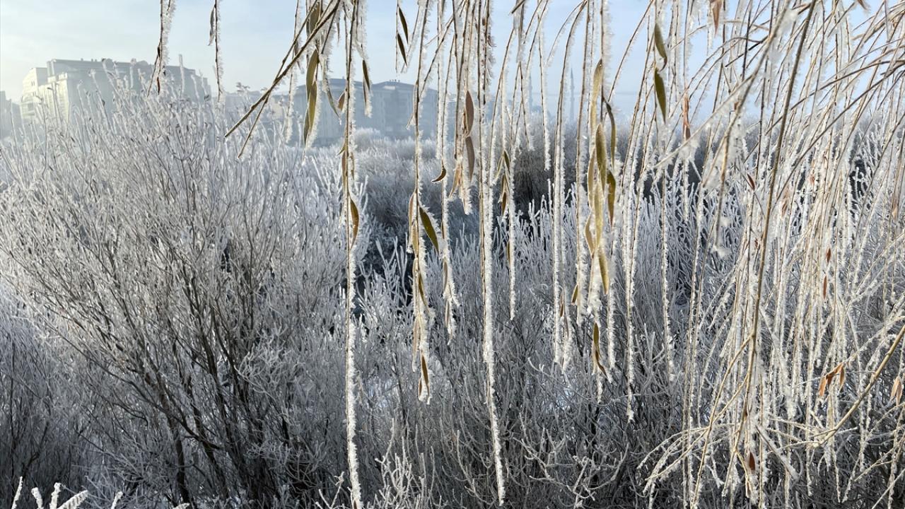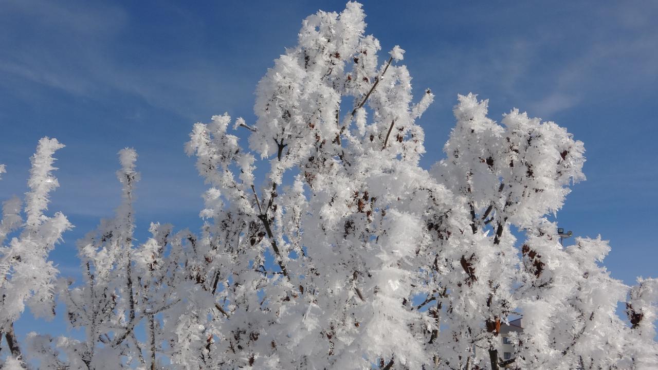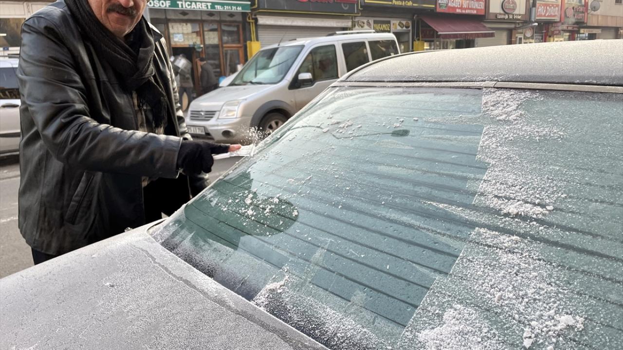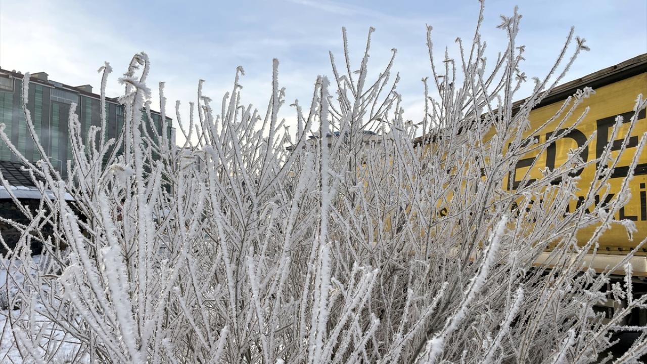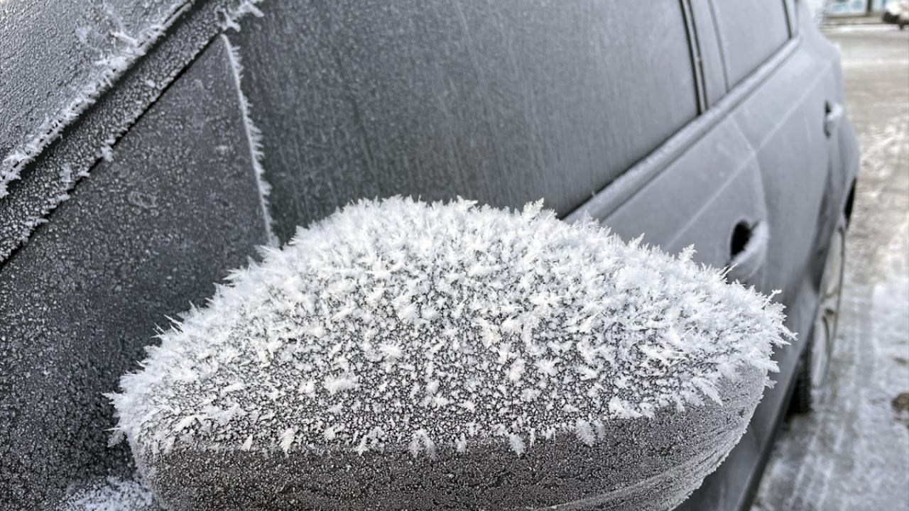 Kentte park halindeki araçların camları buzla kaplandı, bitkiler kırağı tuttu.
