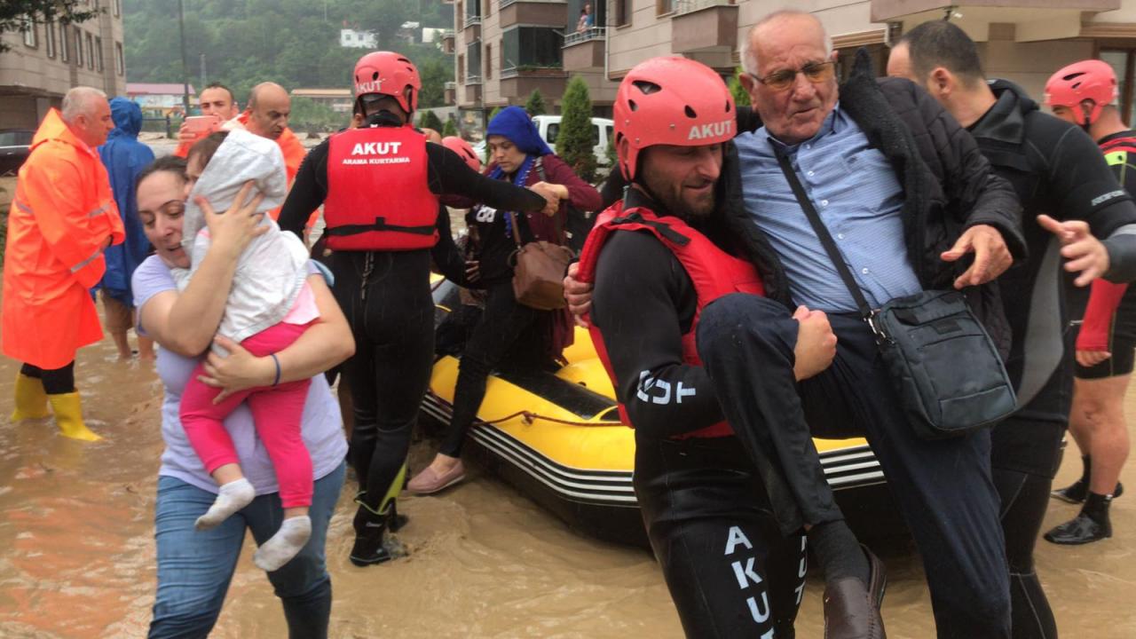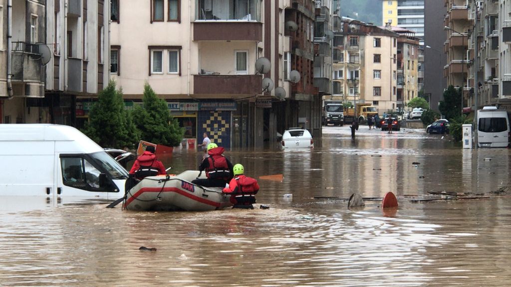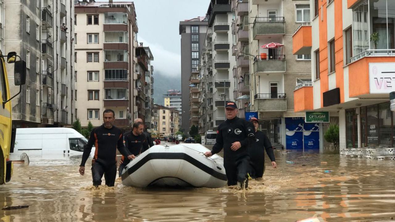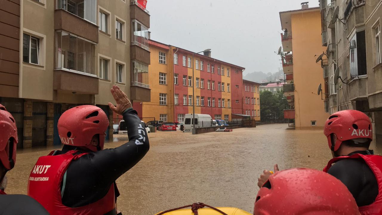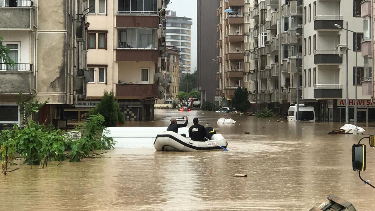 Artvin'in Arhavi ilçesinde derenin taşması sonucu ev, iş yeri ve araçlarında mahsur kalanlar botlarla kurtarıldı.