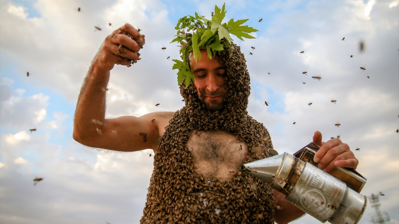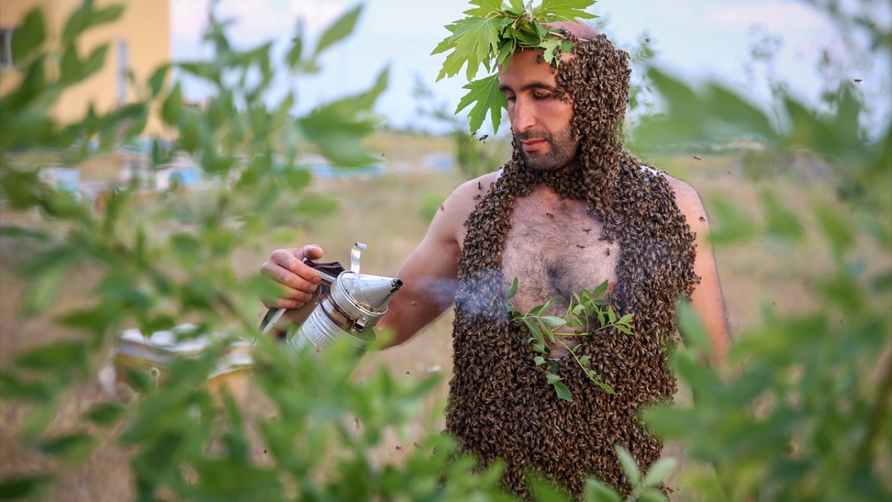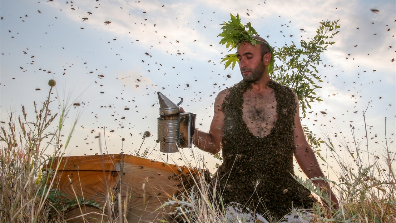 İlk olarak hazırladığı dumanla arıları sakinleştiren Semo, ardından da kovandan eliyle aldığı binlerce arıyı vücudunun üzerine bıraktı.