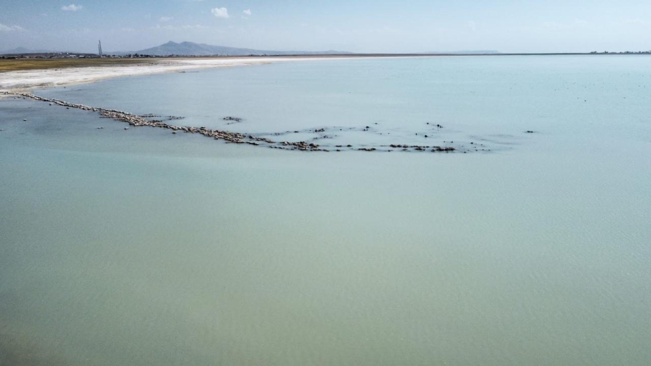 Kuş cenneti olarak bilinen Arin Gölü`nün suyu çekilince binlerce yıllık duvar kalıntıları ve mikrobiyalitler gün yüzüne çıktı.