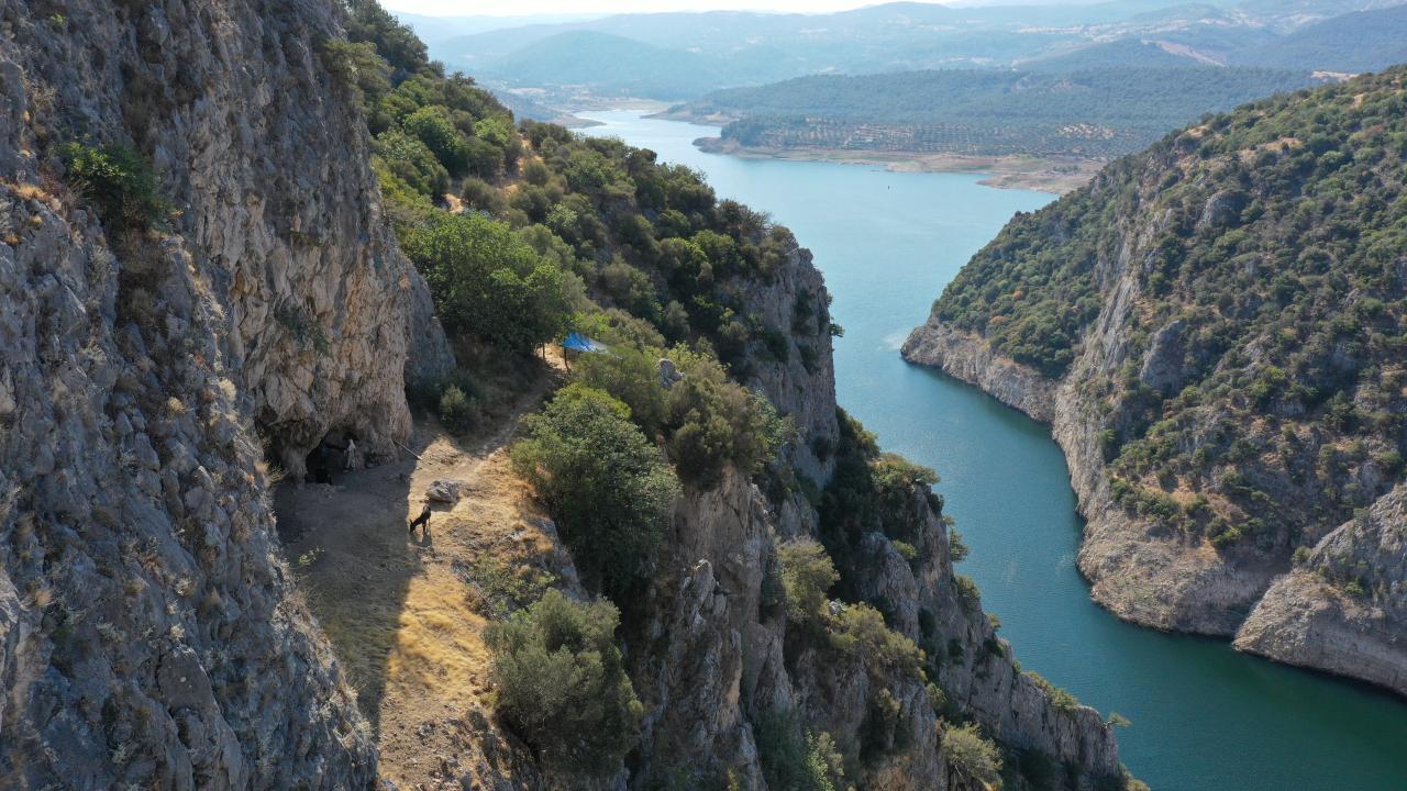 Yolun bittiği noktada araçtan inen ekip, sularını eşeğe yükleyip yaklaşık 500 metre uzaklıktaki mağaraya yürümeye başlıyor.