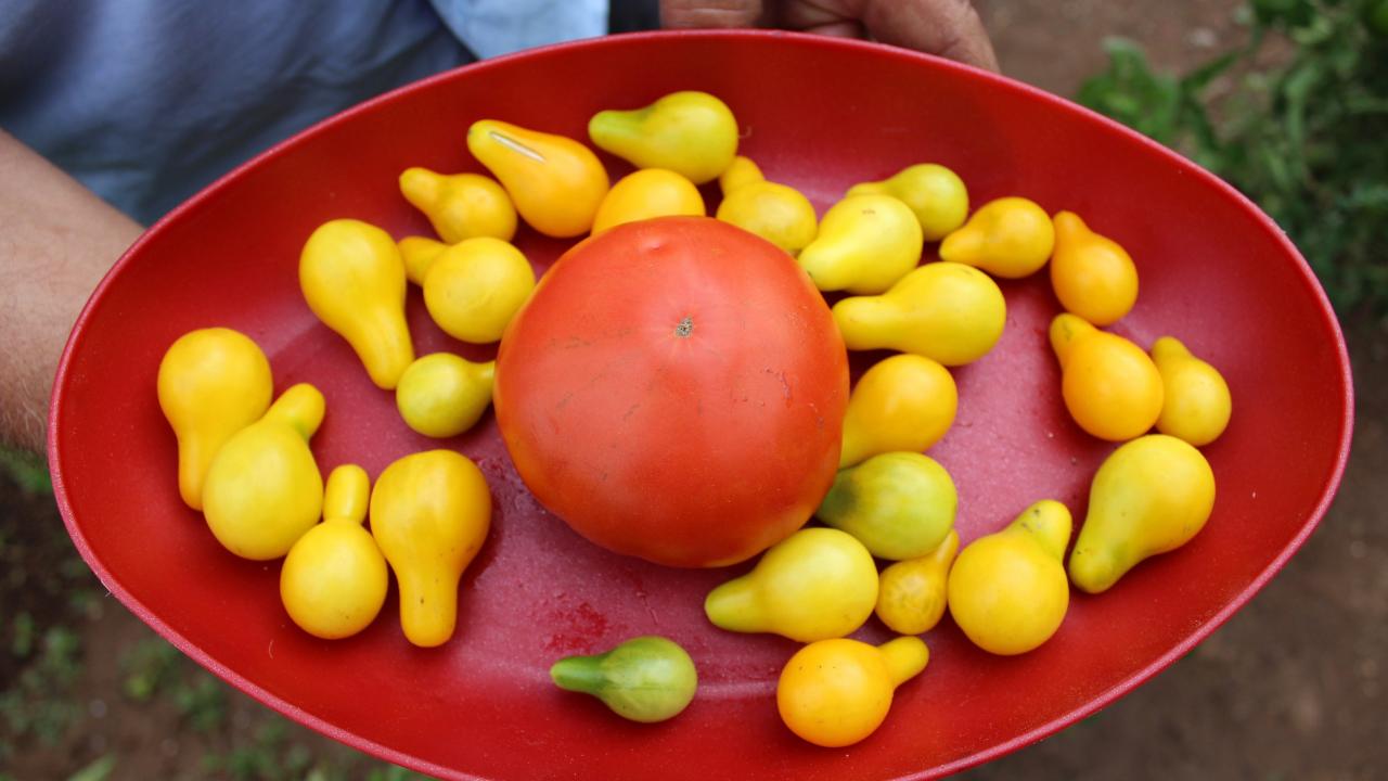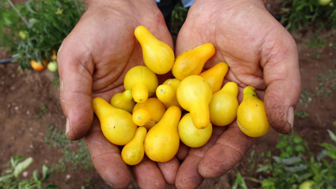 Adeta bir armudu andıran sarı domatesi ilk kez görenler ne olduğuna anlam veremiyor.