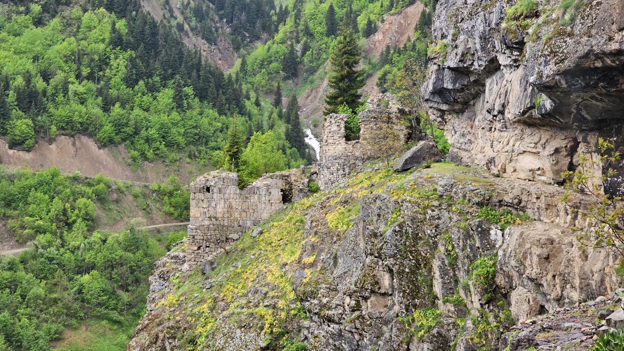 Artvin merkeze bağlı Ortaköy köyünde dağların sarp yamaçlarına kazılmış Orta Çağ`dan kalma tarihi ticaret yolu drone ile görüntülendi.
