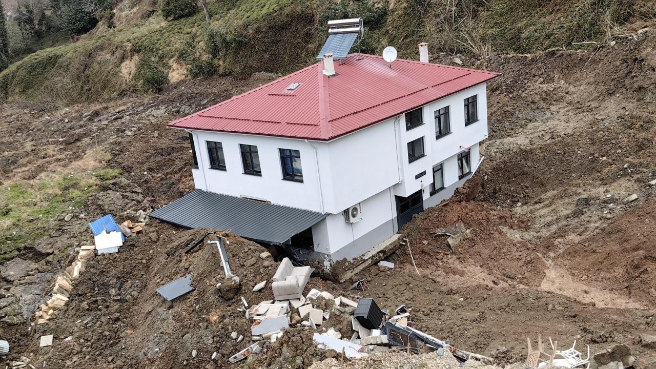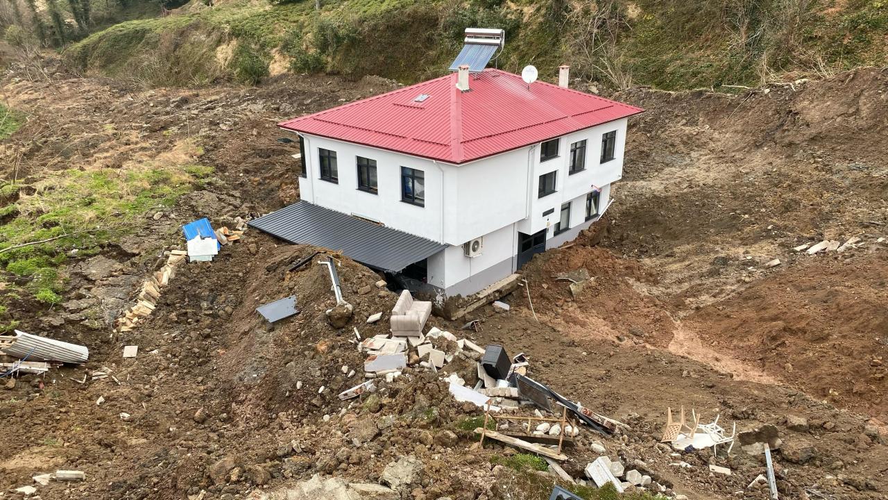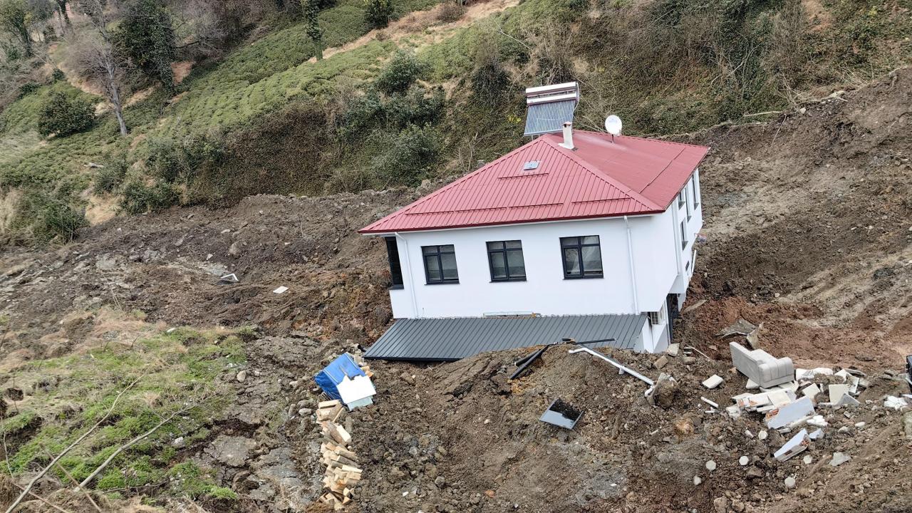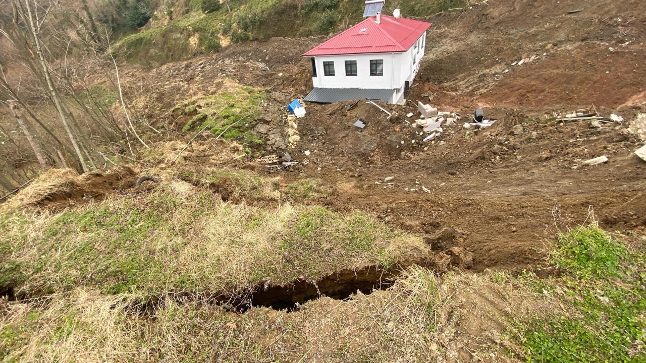 Heyelanın meydana geldiği alanın çevresinde derin çatlaklar oluştuğu, sürüklenen evin yapı bütünlüğünü koruduğu görüldü.