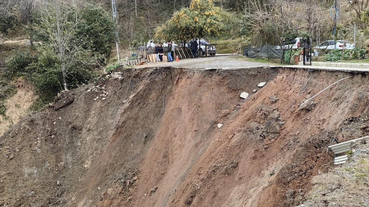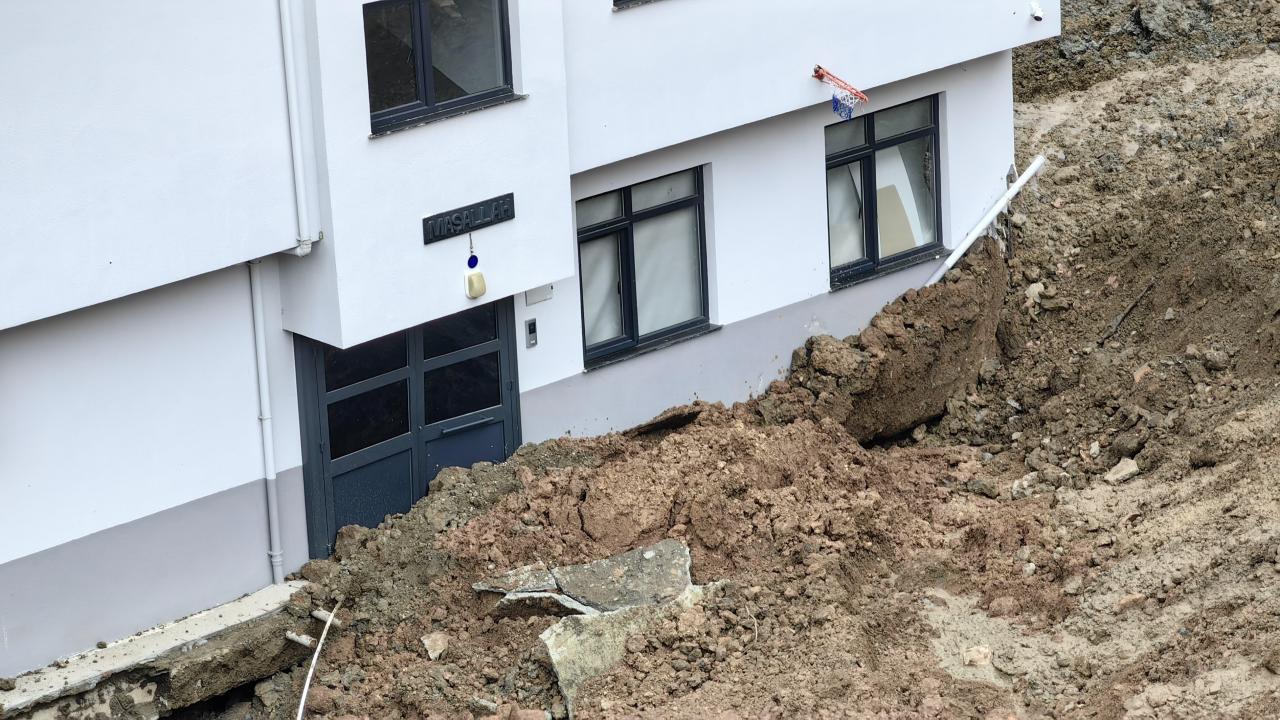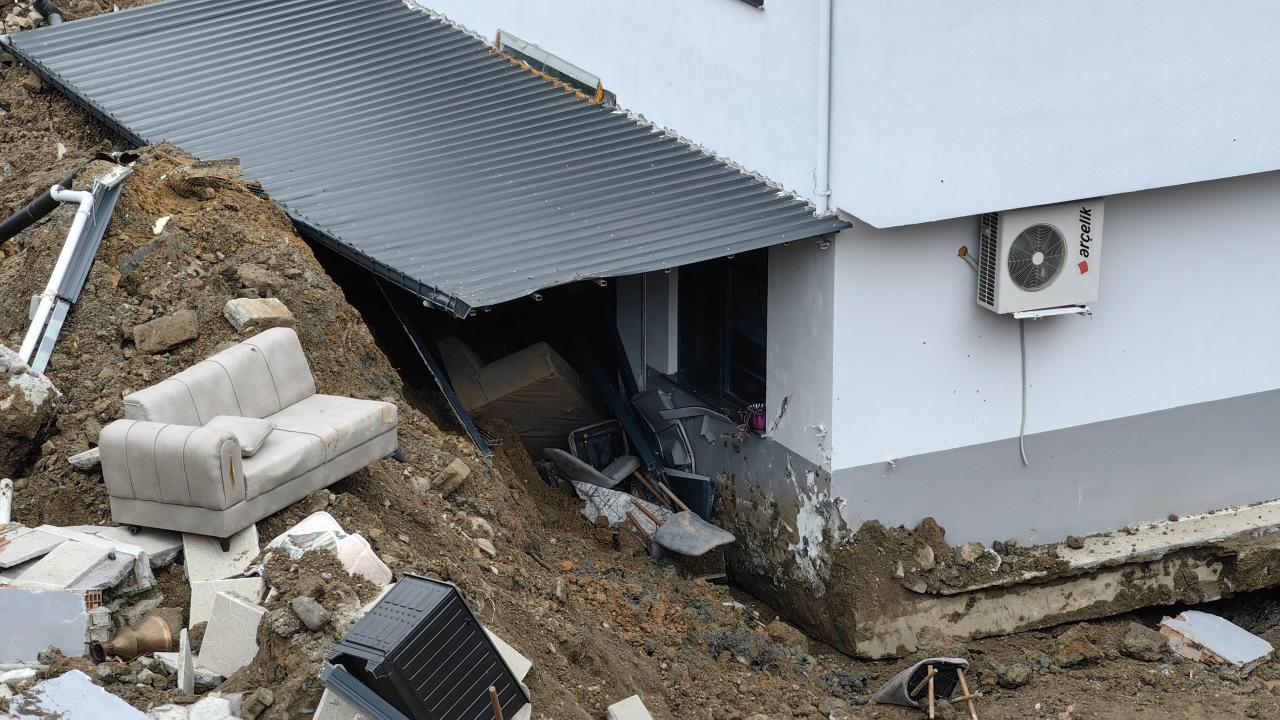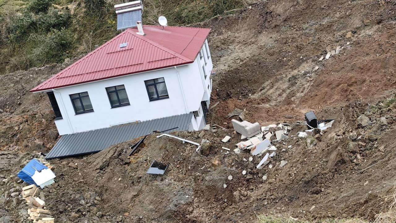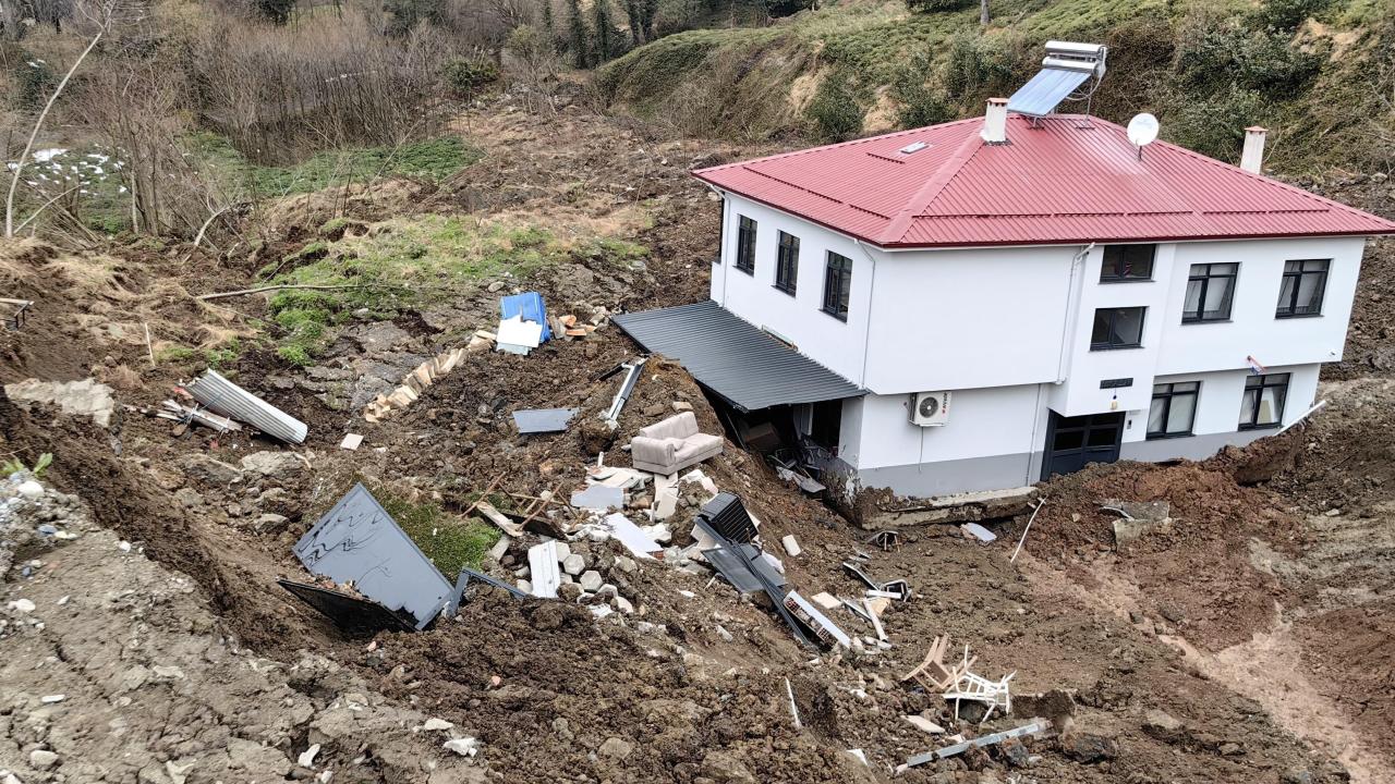 Heyelanın meydana geldiği alanın çevresinde derin çatlaklar oluştuğu, sürüklenen evin yapı bütünlüğünü koruduğu görüldü.