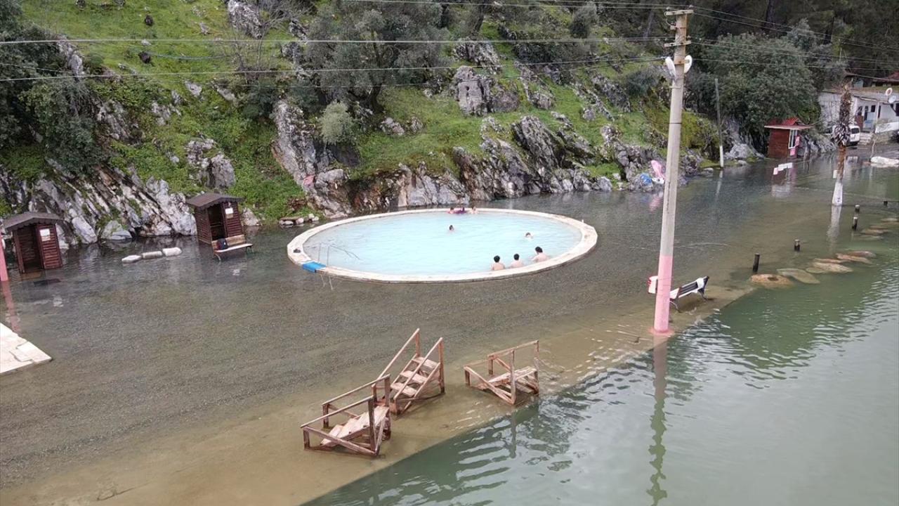 Bazı vatandaşlar, gölden taşan suların altında kalan kaplıcalarda suya girdi.