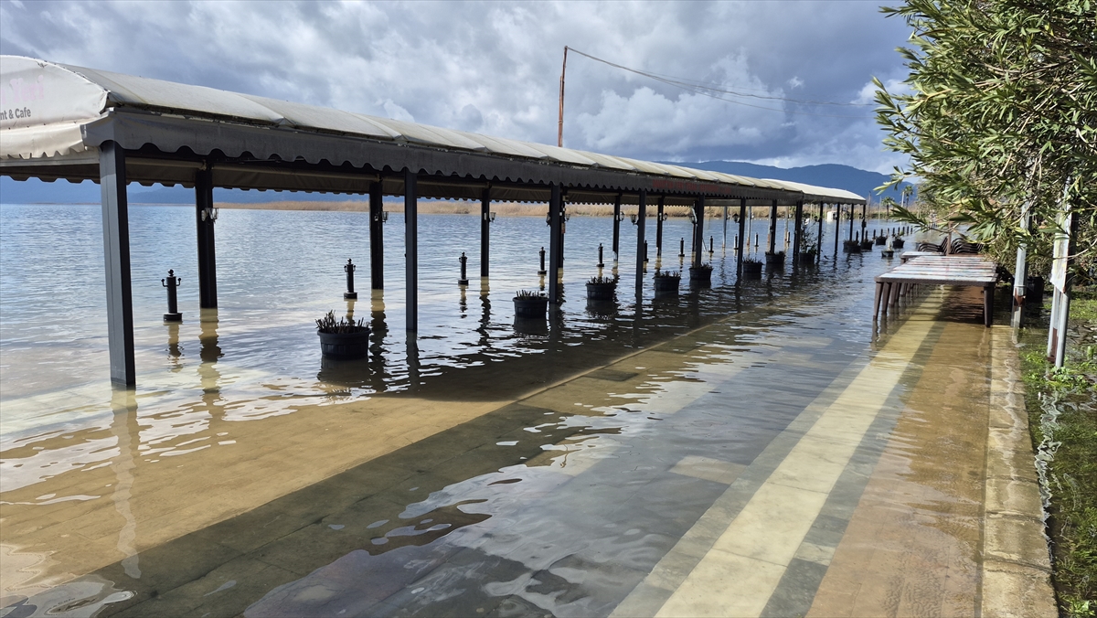 Göl kenarında bulunan yürüyüş yolu ve bazı işletmelere ait masa sandalyeler su altında kaldı.