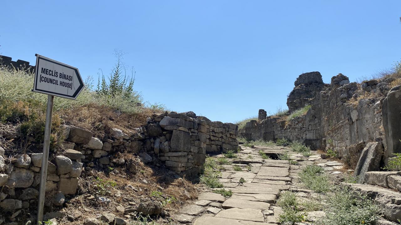 Tiyatronun yaslandığı, yer yer sur duvarları ile çevrili tepenin üzerinde ise kent merkezinin yapıları olan agora, bazilika, anıtsal çeşme, meclis binası ile anıtsal tak, cadde ve Helenistik tapınak bulunuyor.
