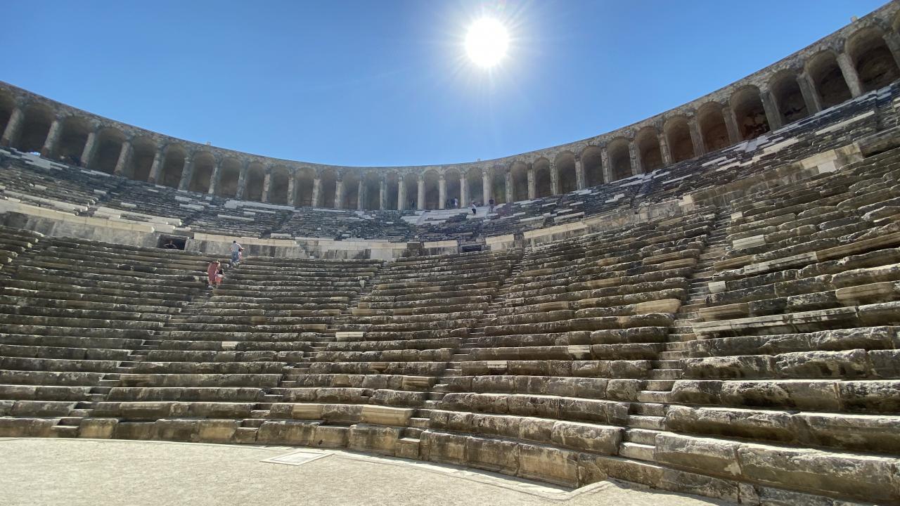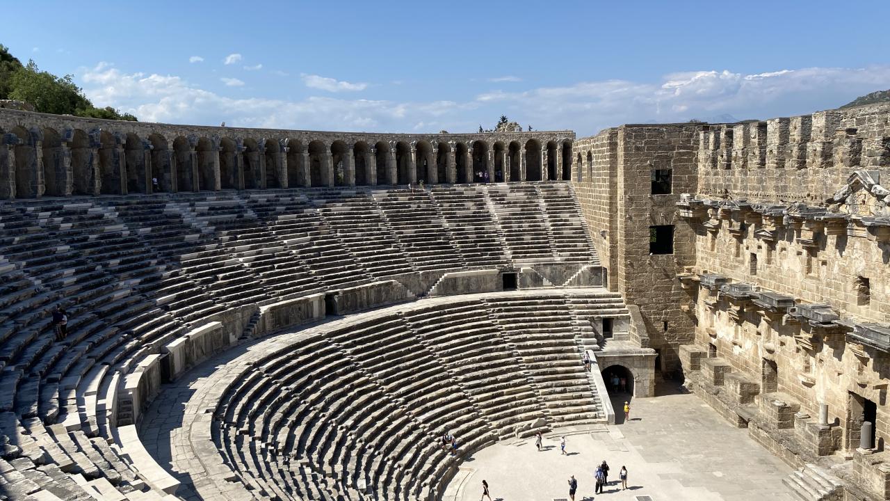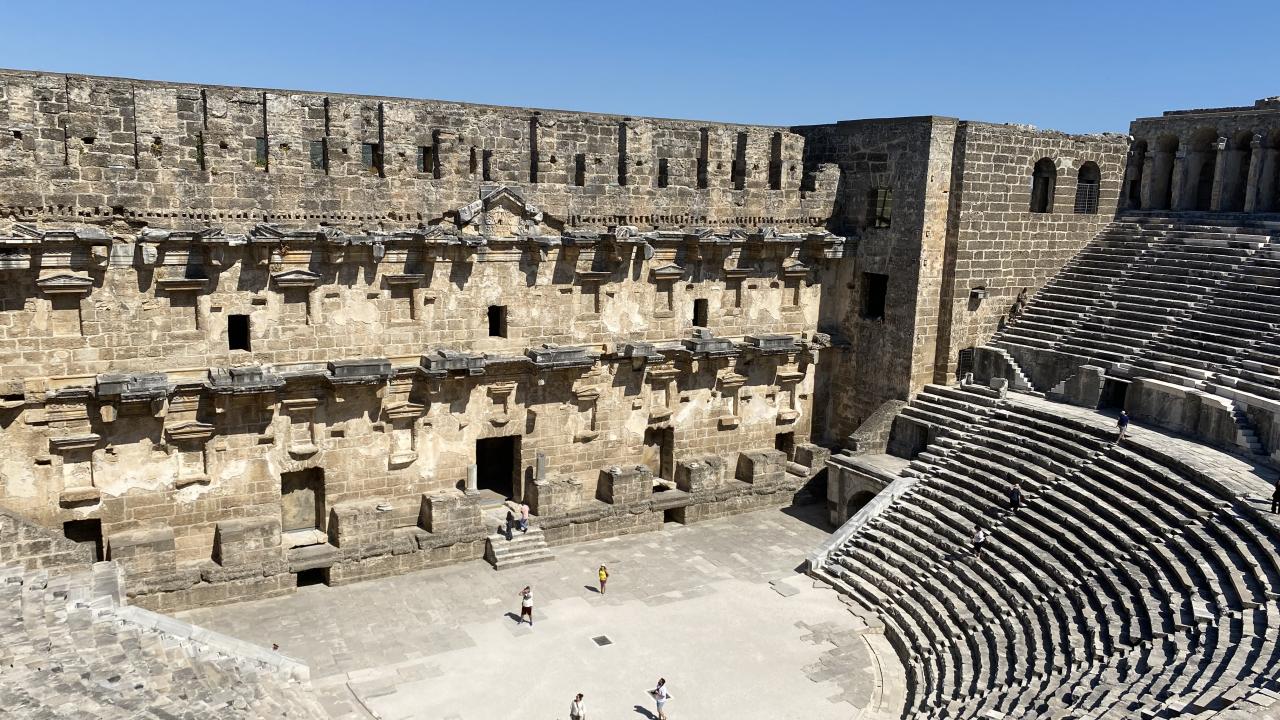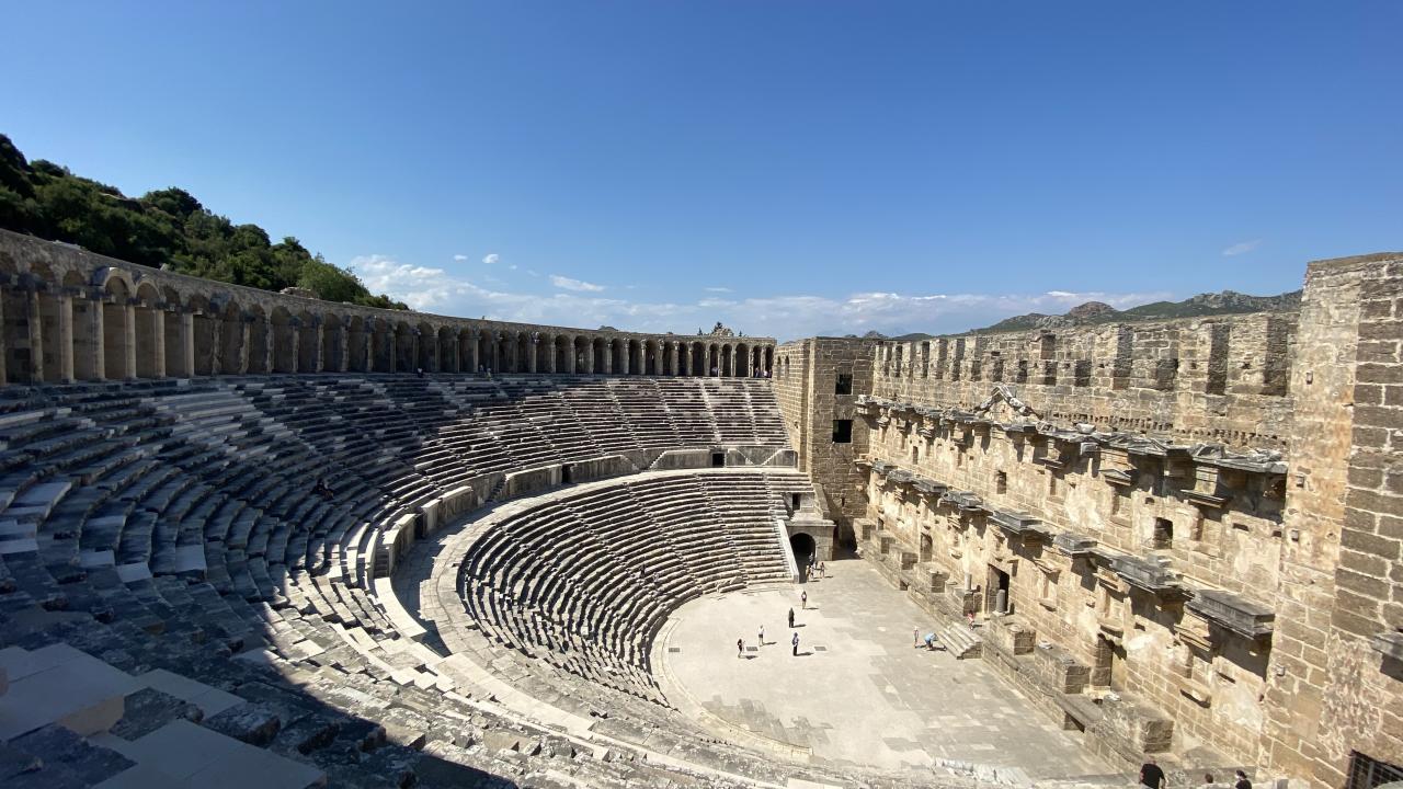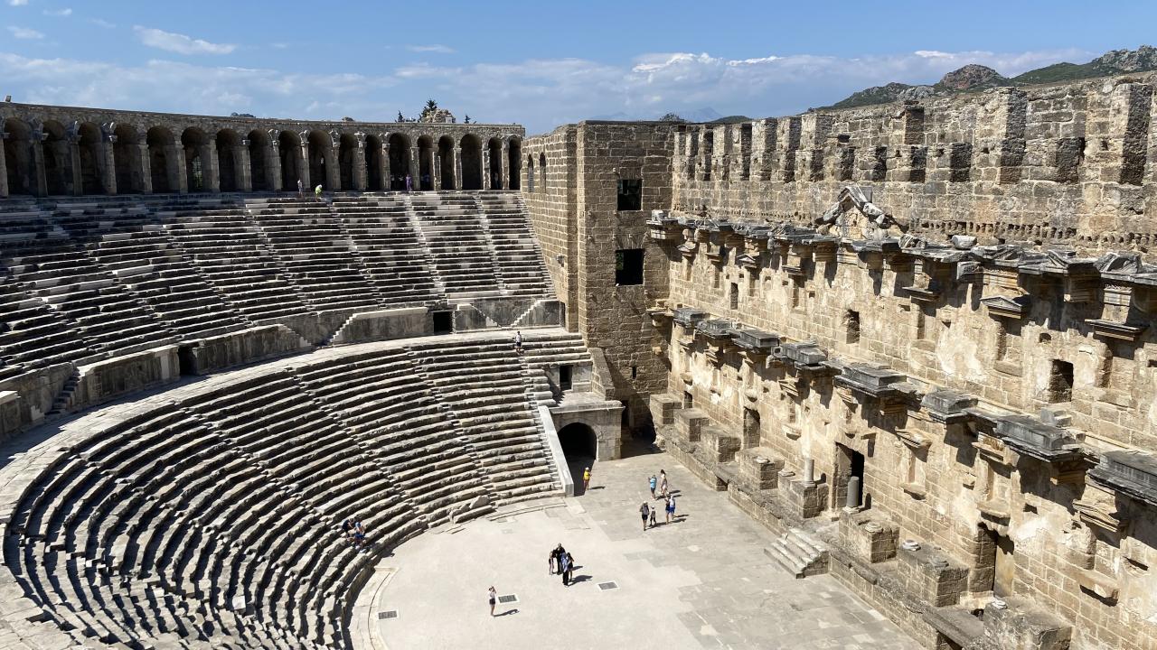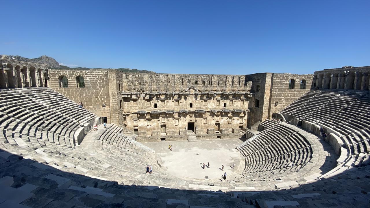Aspendos’ta göze en çok çarpan yapı ise 12.000 kişilik amfitiyatro. Aspendos Tiyatrosu, gerek mimari özellikleri gerekse iyi korunagelmişliği ile Roma tiyatrolarının günümüzdeki en seçkin temsilcilerinden biri olarak ziyaretçilerini ağırlıyor.