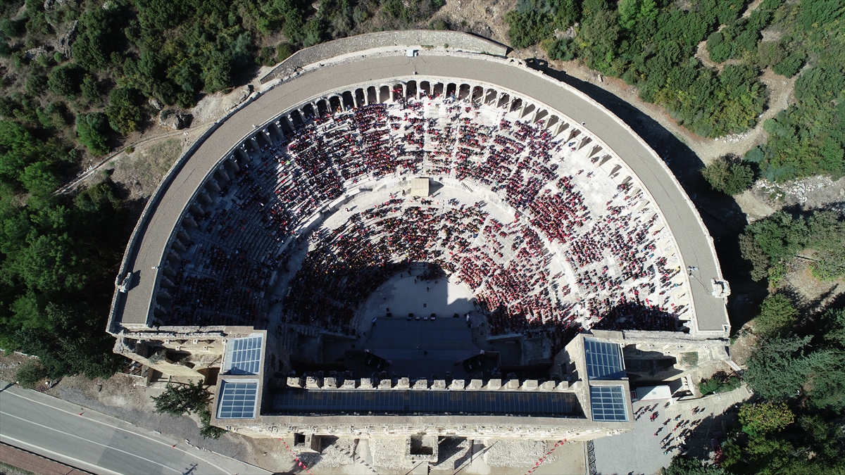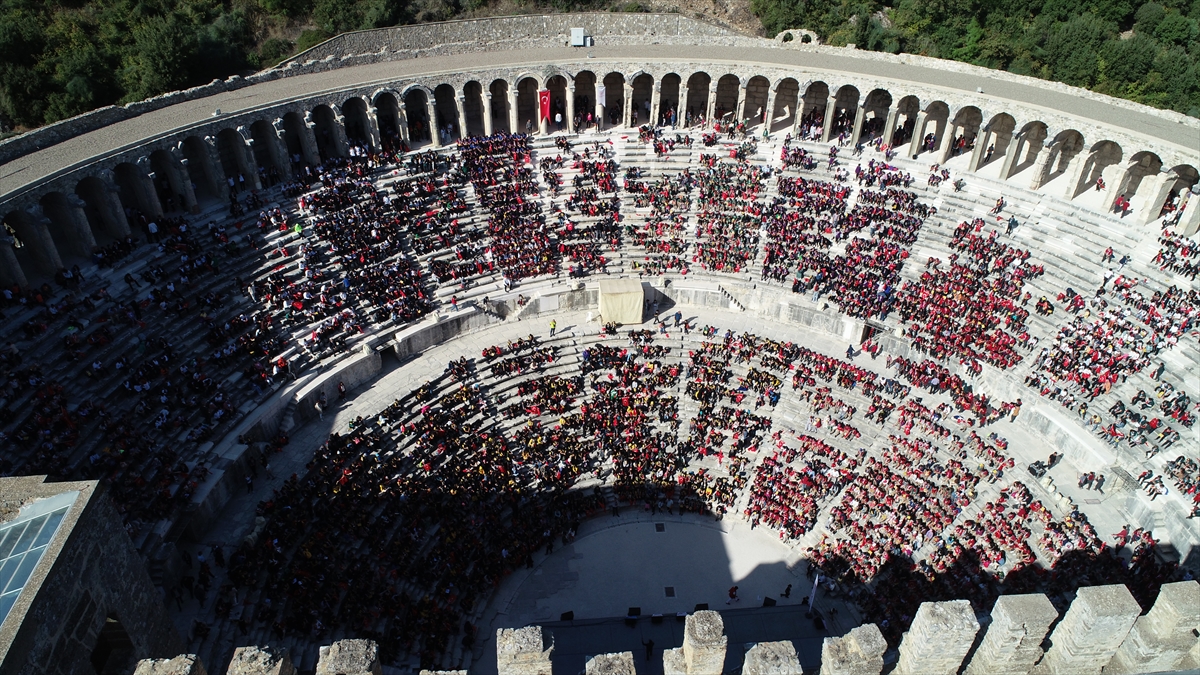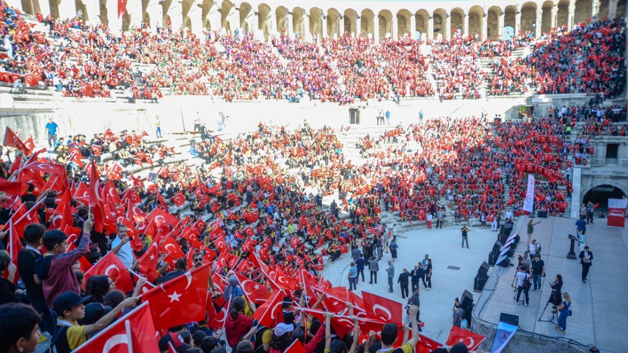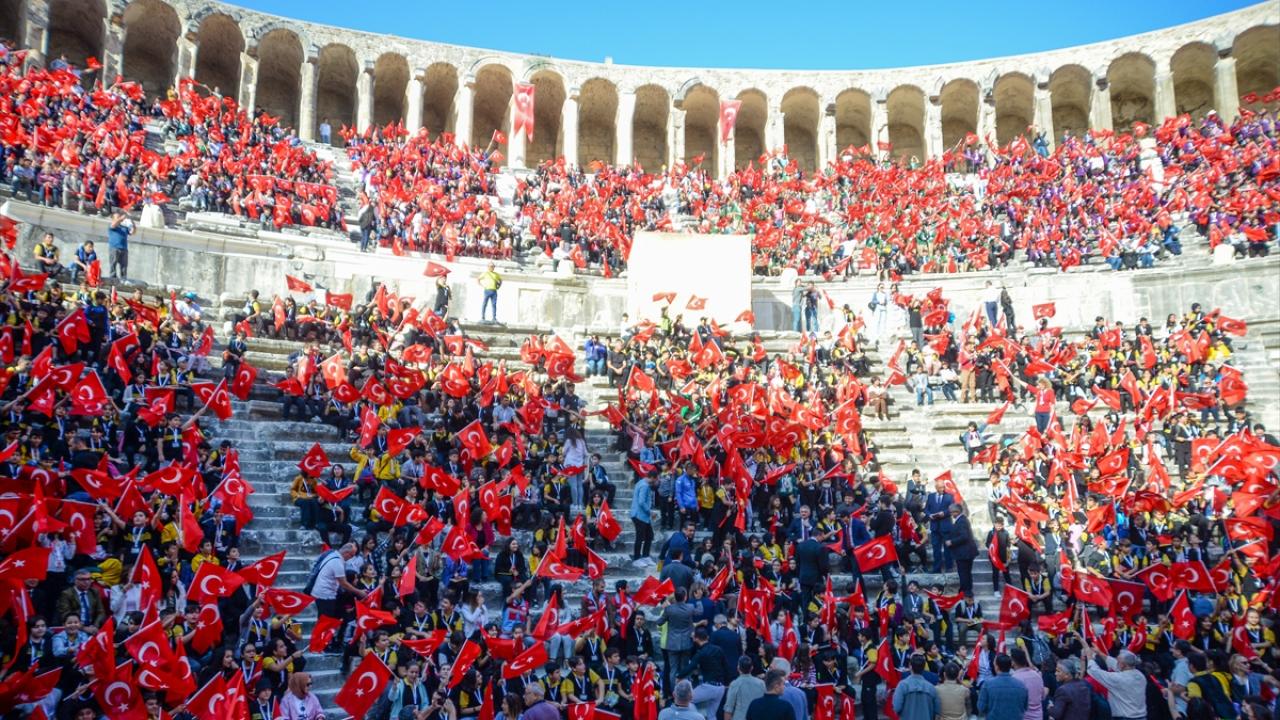 Öğrencilerin ellerindeki Türk bayraklarıyla görsel şölen oluşturduğu etkinlik, İstiklal Marşı`nın okunması ve saygı duruşunda bulunulmasıyla başladı.