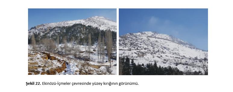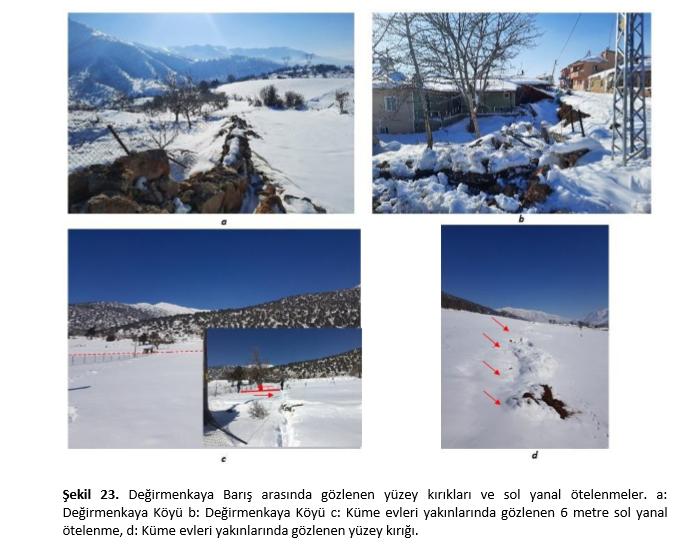 Değirmenkaya-Barış arasında gözlenen yüzey kırıkları ve sol yanal ötelenmeler. a: Değirmenkaya Köyü b: Değirmenkaya Köyü c: Küme evleri yakınlarında gözlenen 6 metre sol yanal ötelenme, d: Küme evleri yakınlarında gözlenen yüzey kırığı. Kırık izi Barış’ın 5 km doğusundan Karşıyaka Mahallesine kadar izlenemedi. Buradan sonra DB uzanımında 5 km daha takip edilebilen iz Kuz Tepe’nin doğusunda tamamen kayboldu. Yüzey kırığının izlendiği Nurhak’ın doğusunda yanal atımın yanında ters bileşenin de olduğu görüldü.