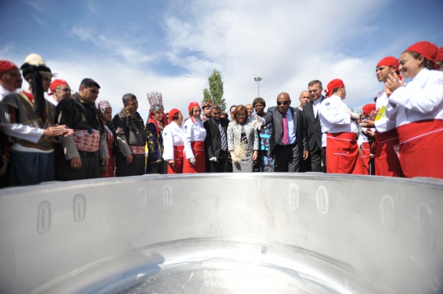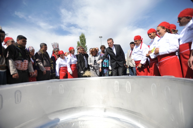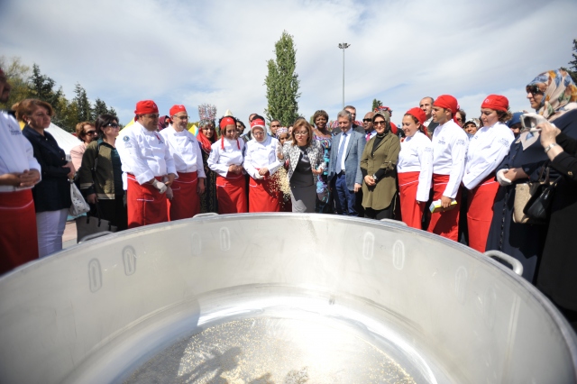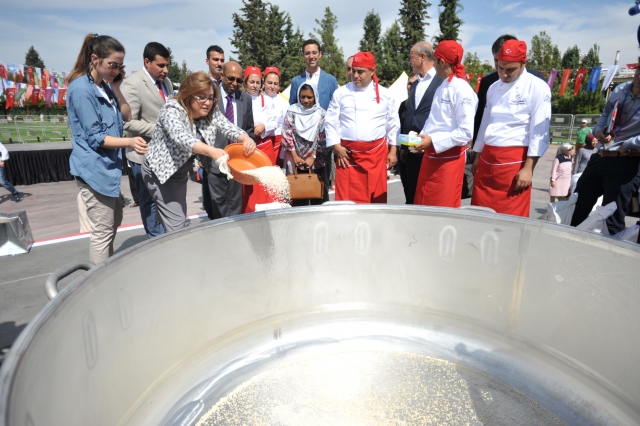 Gaziantep Büyükşehir Belediyesi ve Gaziantep Gastronomi ve Turizm Derneğinin (Gasturder) iş birliğiyle düzenlenen etkinlik kapsamında, Türkiye'nin farklı kentlerinden getirilen malzemelerde 3 ton aşure pişirilerek, Guinness Rekorlar Kitabı'na girilmesi amaçlanıyor.Konuşmaların ardından, malzemelerin ıslatılması için Büyükşehir Belediye Başkanı Fatma Şahin, Esmaül Hüsna okunmuş 99 pirinç, mercimek ve buğdayı tencereye döktü.