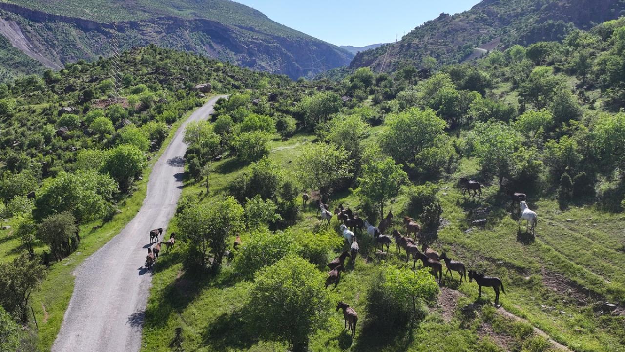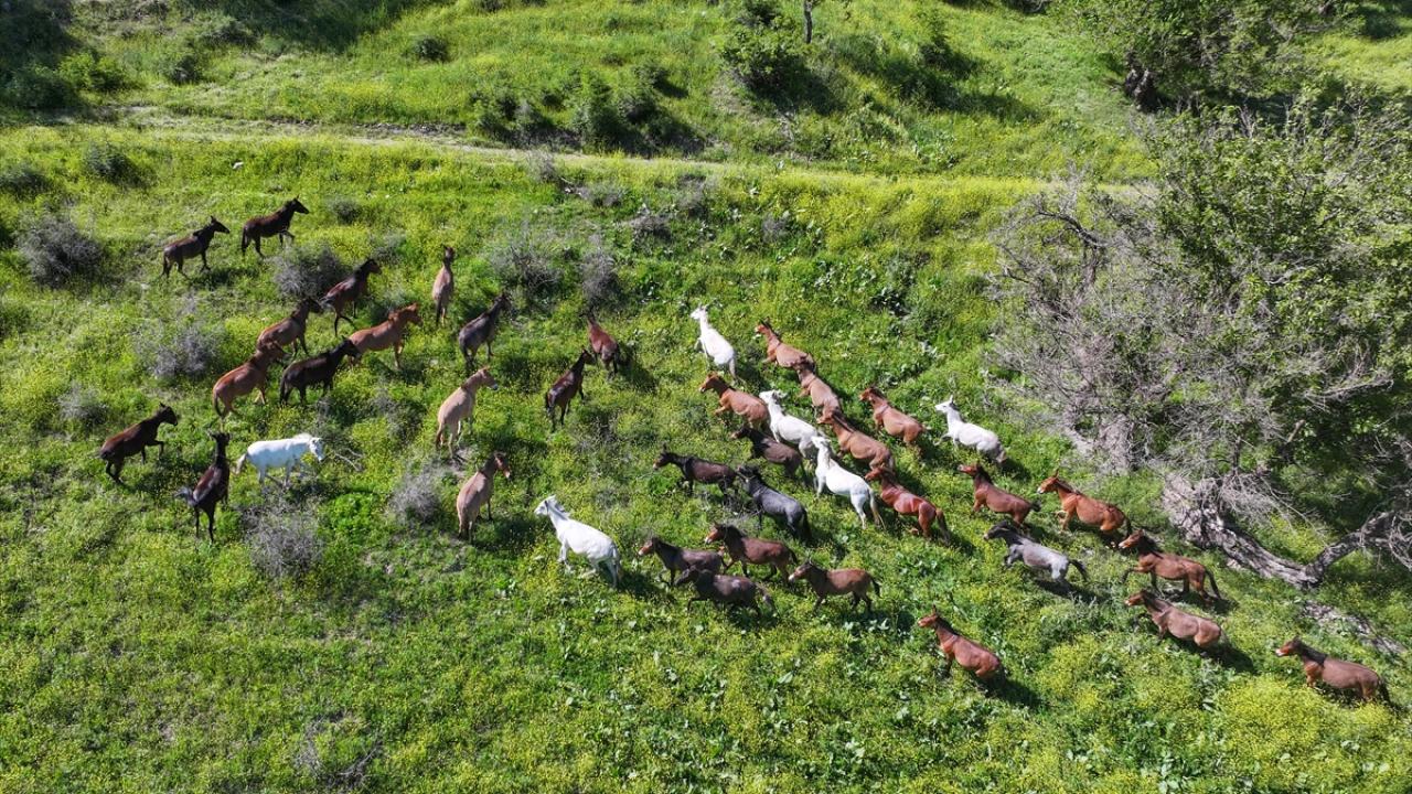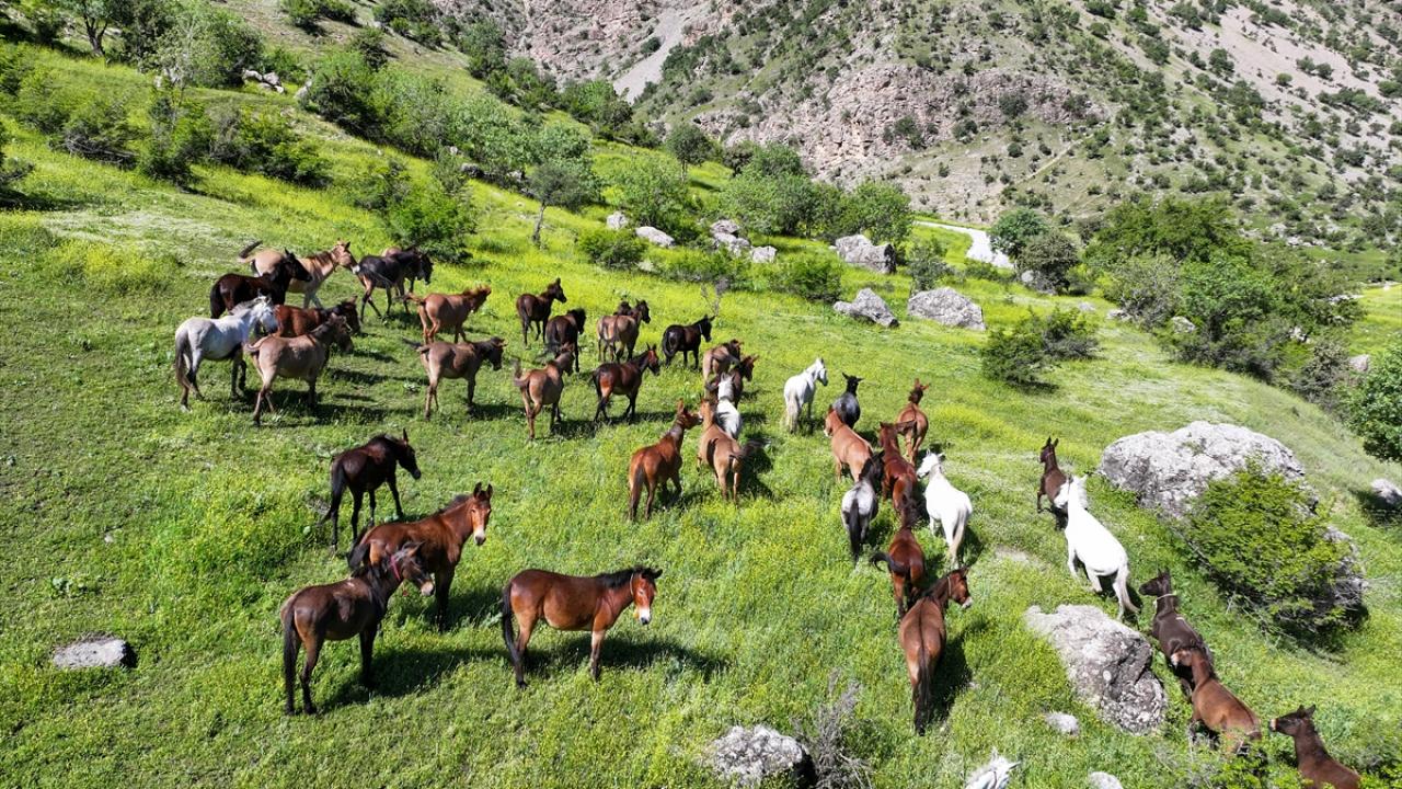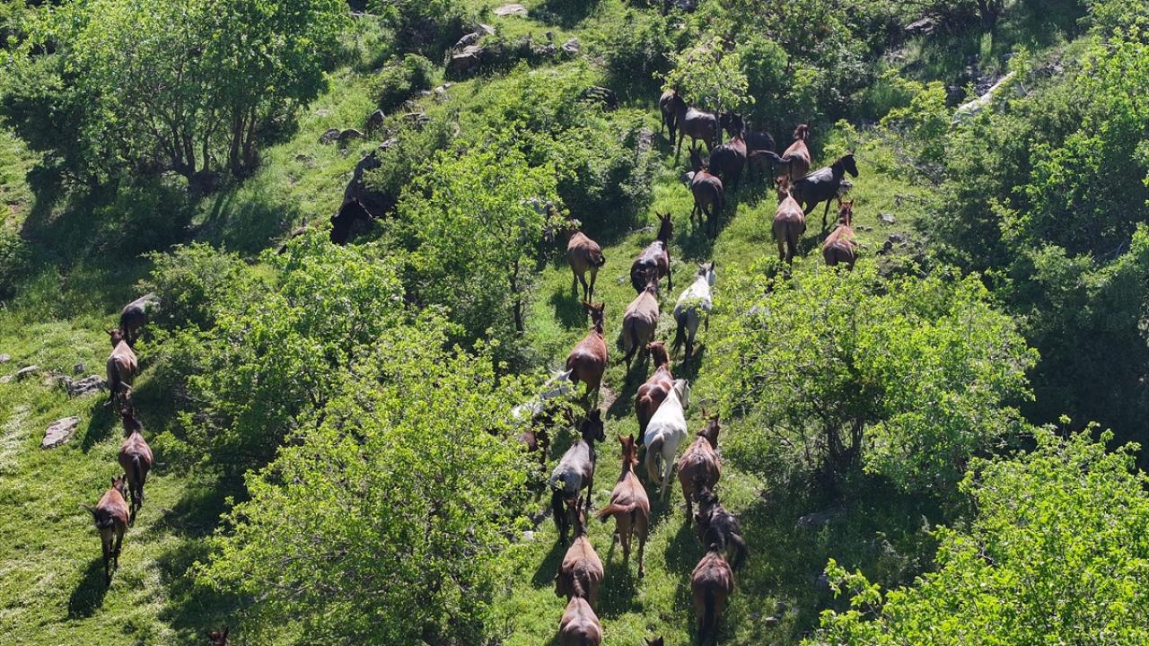 Van'ın Çatak ilçesi kırsalında at ve katırlardan oluşan sürü, doğada özgürce dolaşırken görüntülendi.