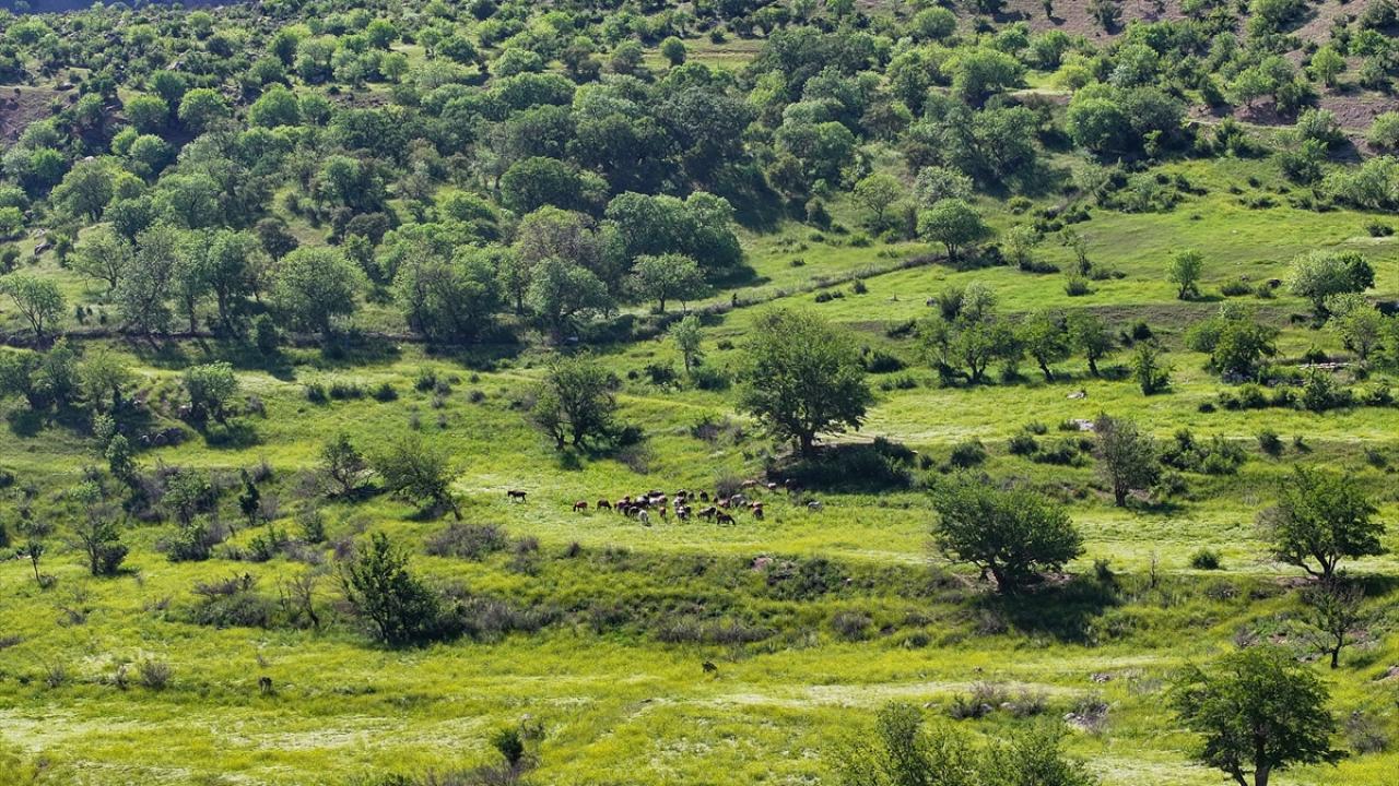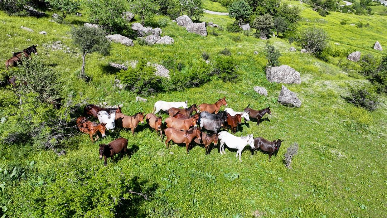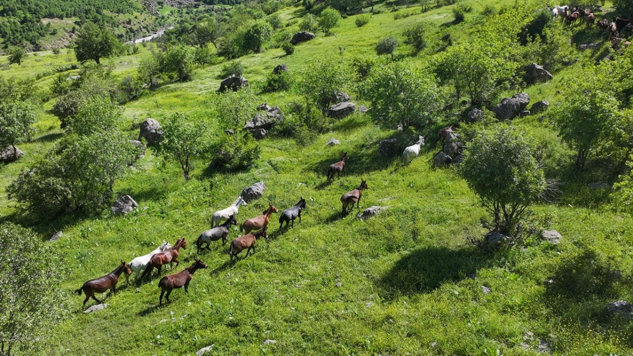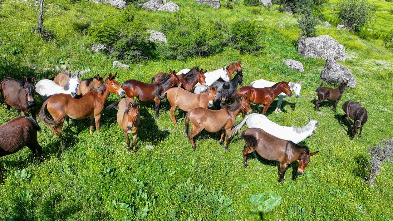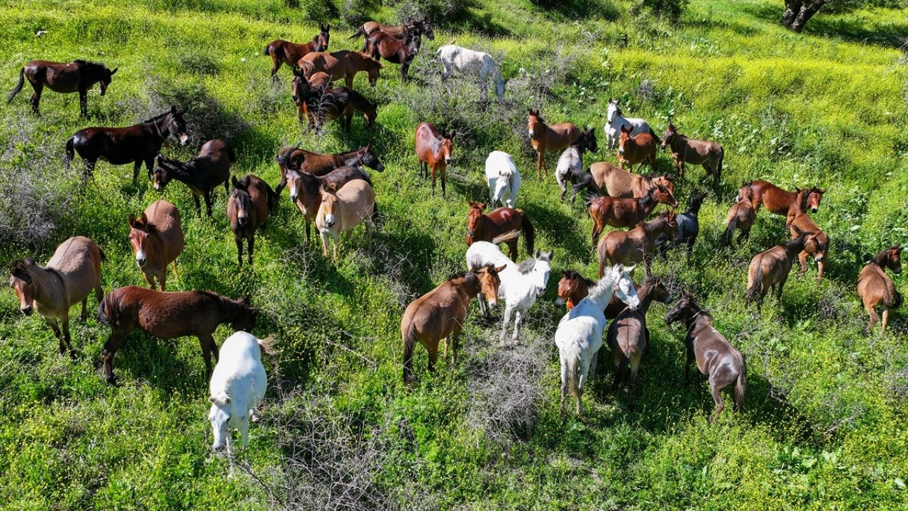 Van'ın Çatak ilçesi kırsalında at ve katırlardan oluşan sürü, doğada özgürce dolaşırken görüntülendi.
