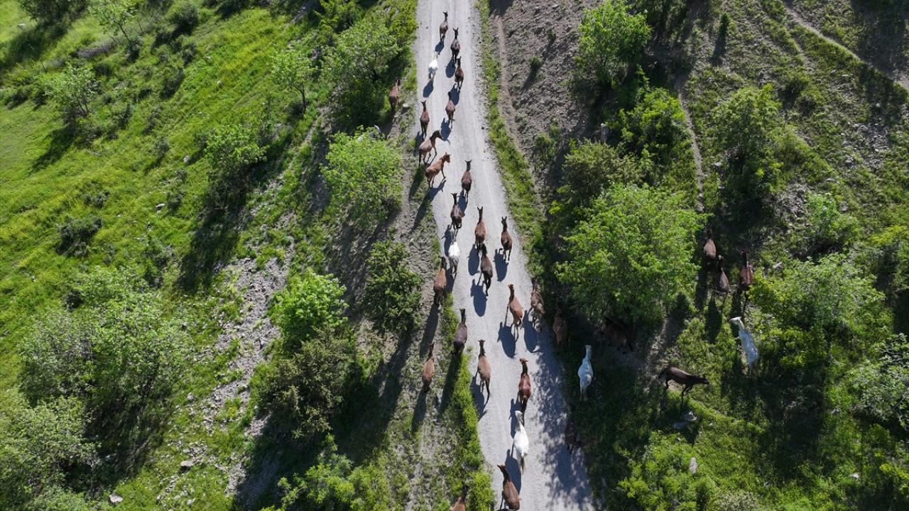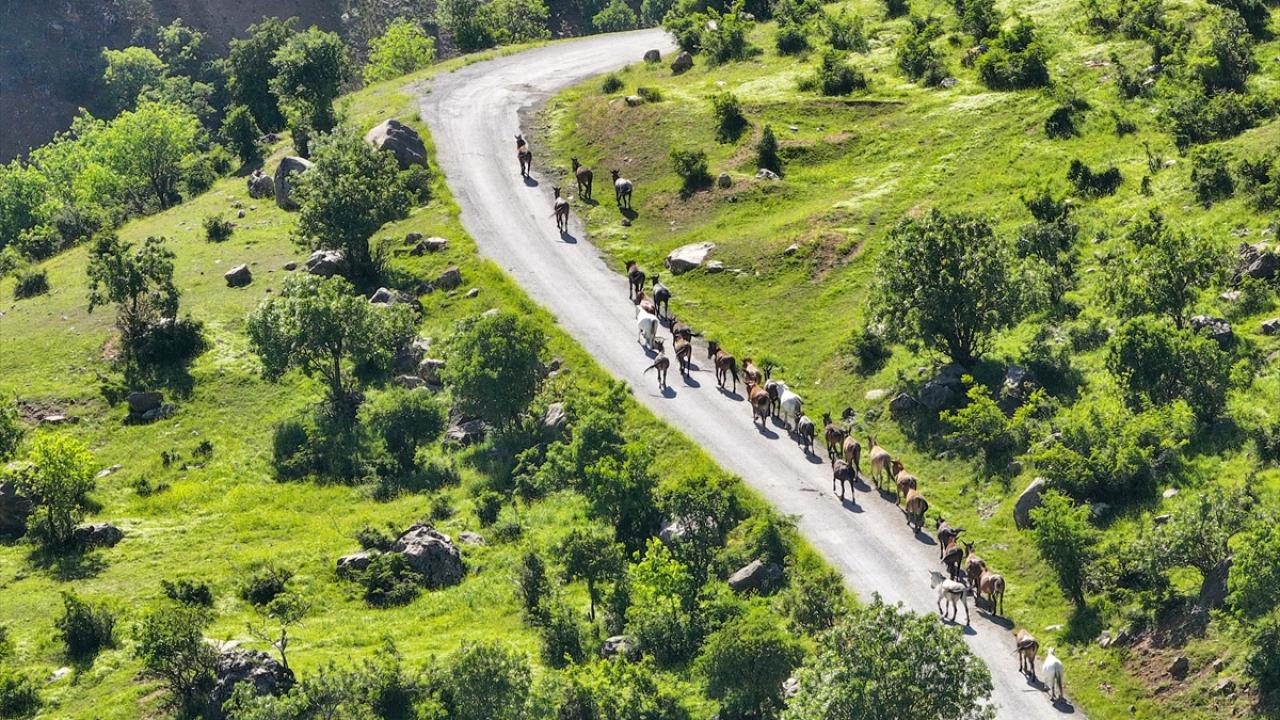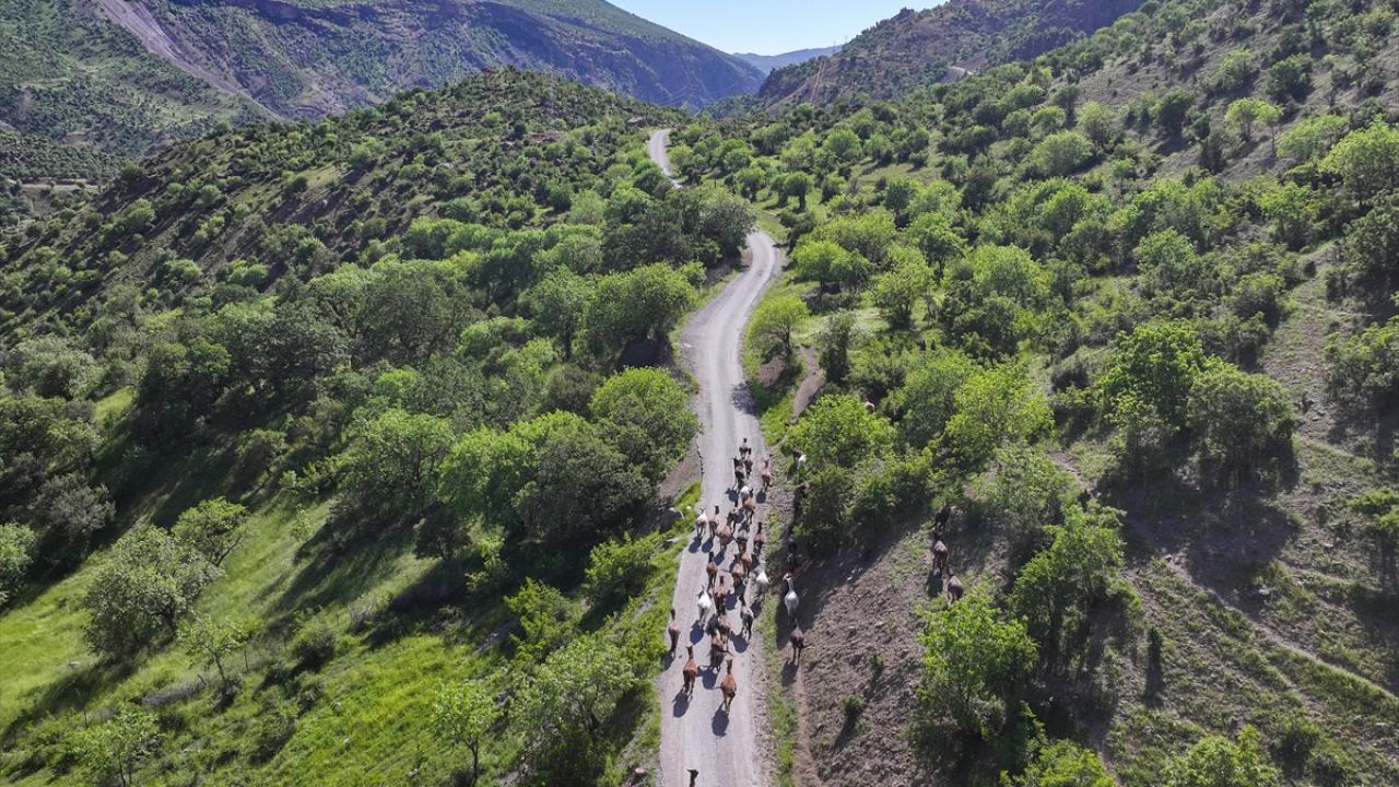 At ve katırlardan oluşan sürü, Van'ın Çatak ilçesinde görüntülendi