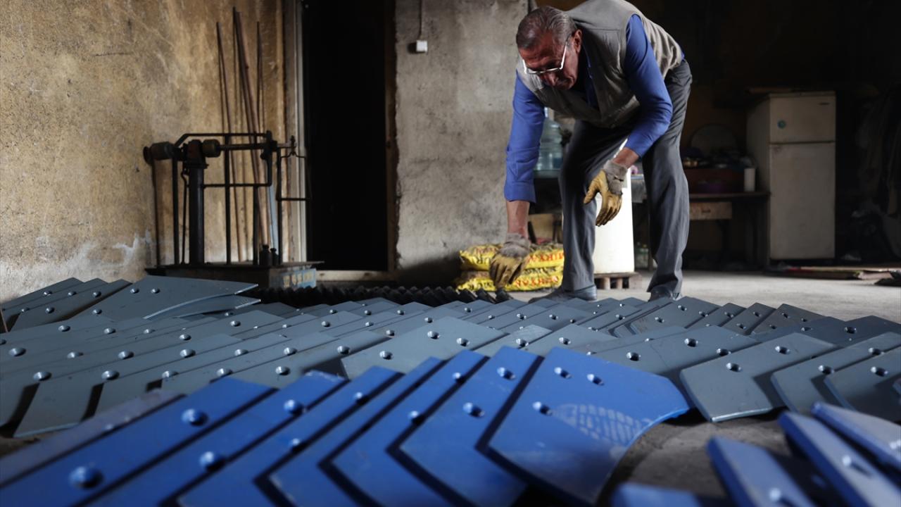İki kardeş, atölyede kömür ocağının ateşiyle yumuşattıkları demiri döverek çeşitli tarım aletleri üretiyor.