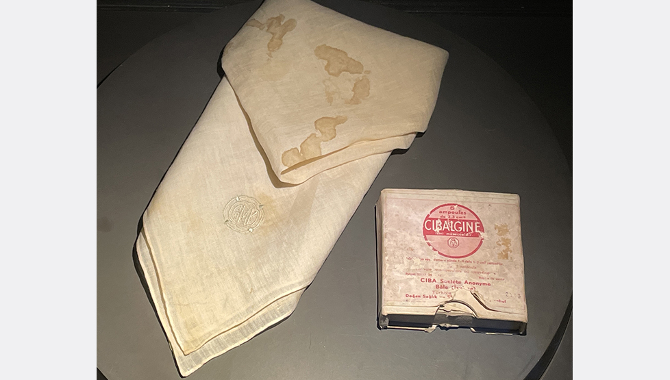 Eserler arasında yer alan ve Atatürk`ün hastalığının son dönemlerinde kullandığı kumaş mendilindeki kan izleri dikkat çekti.