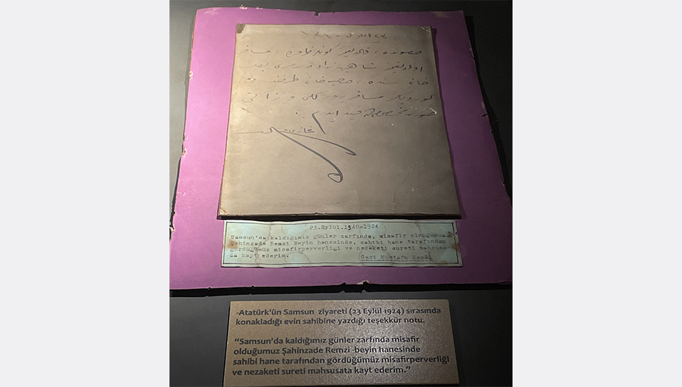 Ziyaretçilerin bugüne kadar beğenisine sunulmamış Atatürk`ün eşyalarından oluşan sergide, son dönemlerinde hastayken kullandığı mendili, sabahlığı, çantası, gözlüğü, pijaması, çay ve fincan takımı, 23 Eylül 1924`te Samsun ziyareti sırasında konakladığı evin sahibine yazdığı teşekkür notu, matarası, zarf açacağı, üzerinde Enfal Suresi 60. ayetinin yazılı olduğu Osmanlı dönemi merasim kemeri de bulunuyor.
