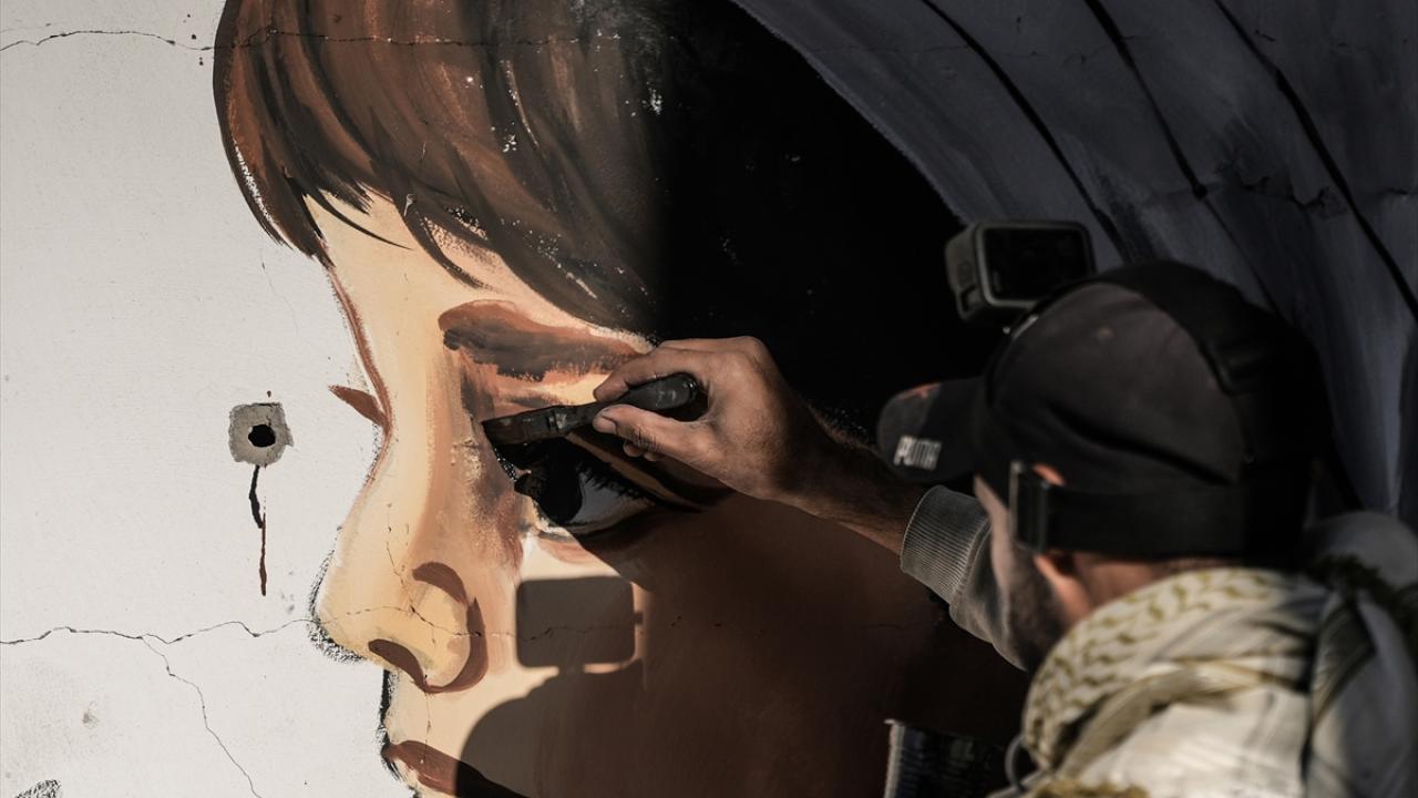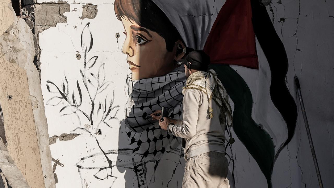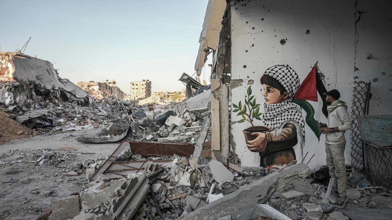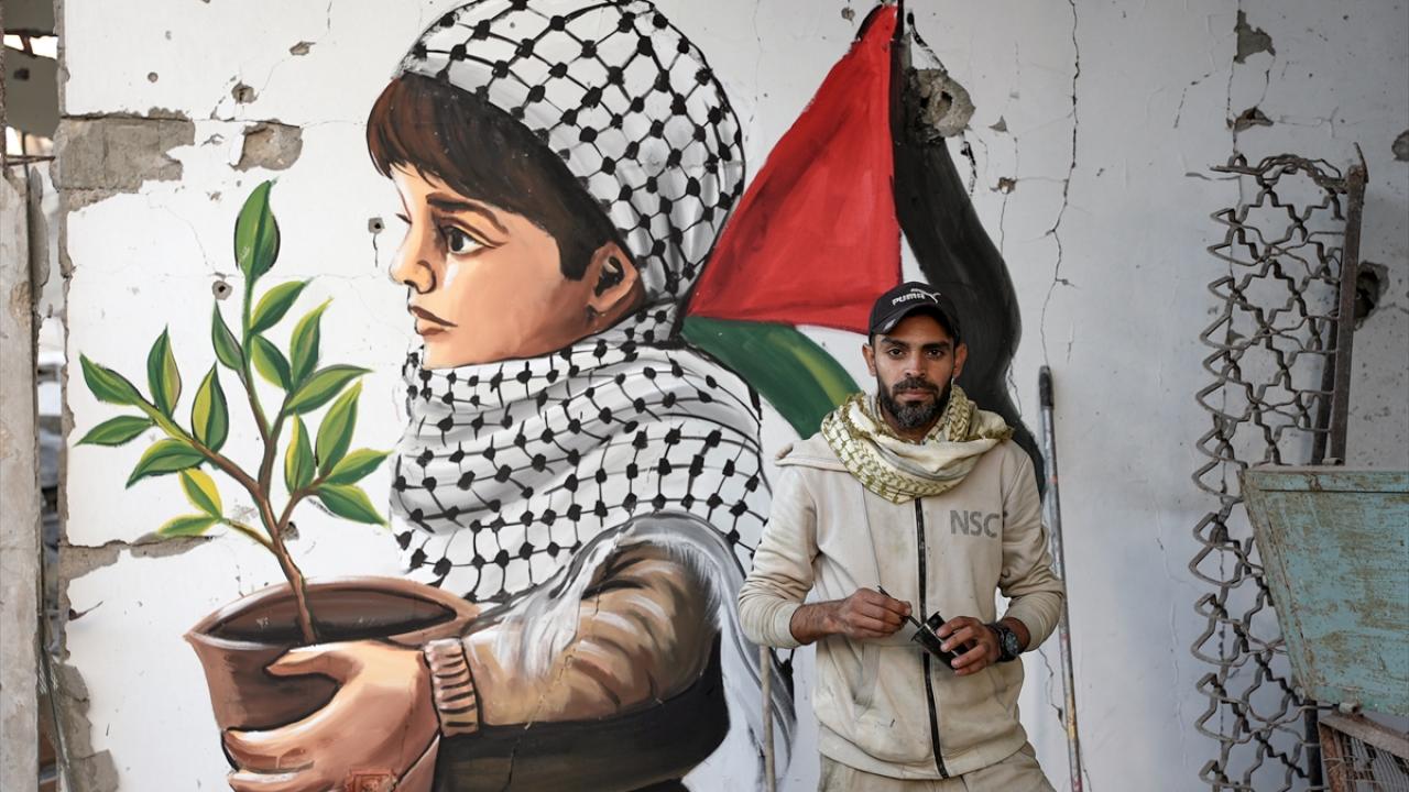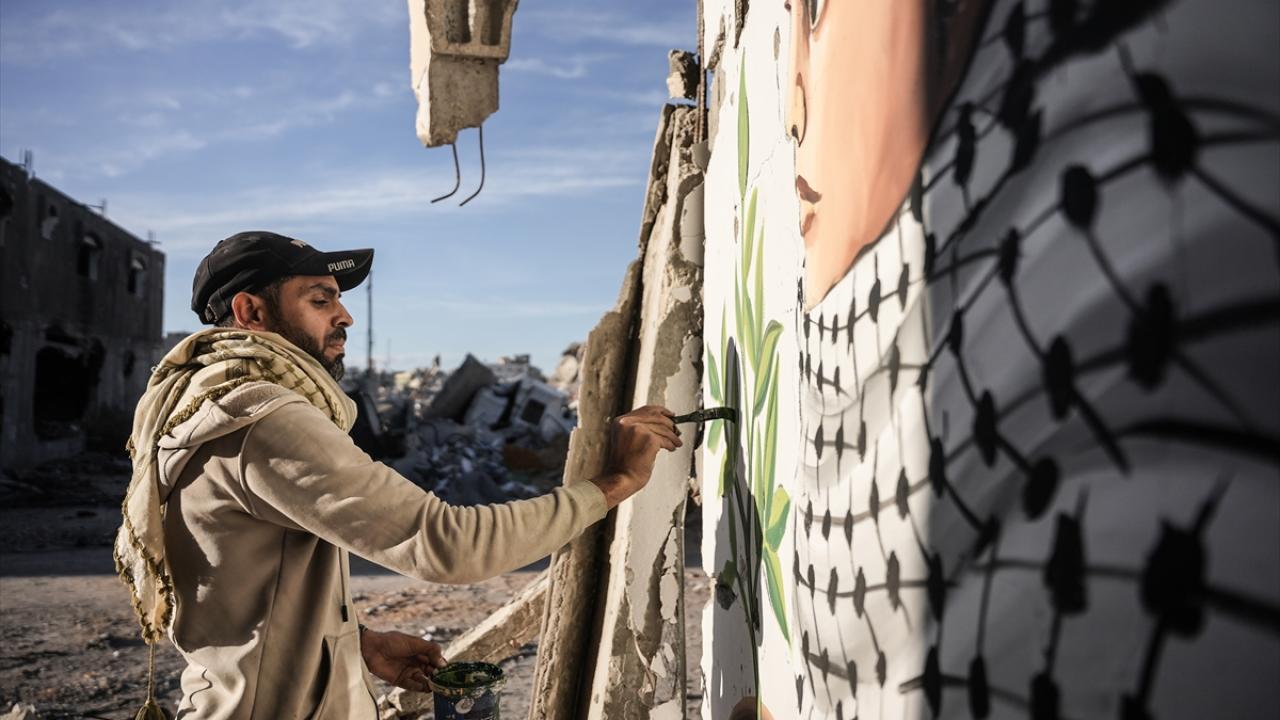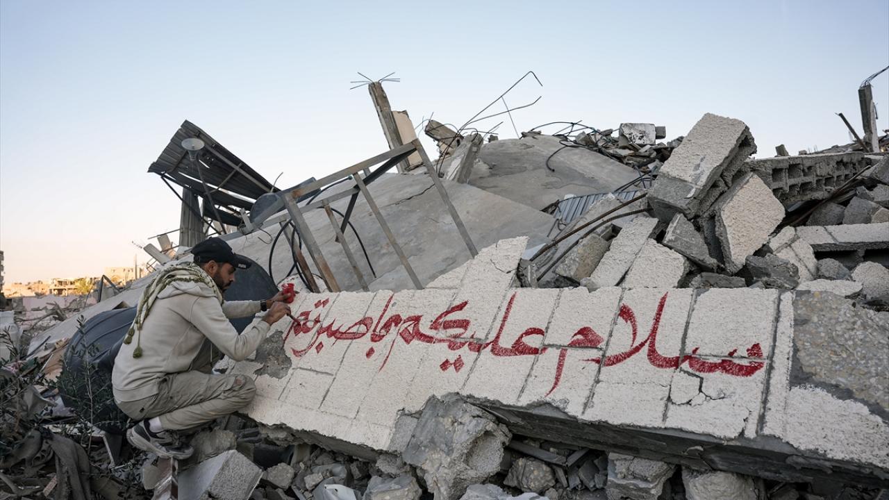 Hamas ve İsrail arasında mutabakata varılan Gazze'de ateşkes ve karşılıklı esir takası anlaşmasının yürürlüğe girmesinin ardından Filistinliler, Gazze'nin güneyinde yer alan Refah kentindeki evlerine dönmeye devam ediyor. Refah'taki evine dönen Filistinli bir sanatçı, evlerin enkazına azim, barış ve umudu ifade eden resimler çizerek sanatını icra ediyor.