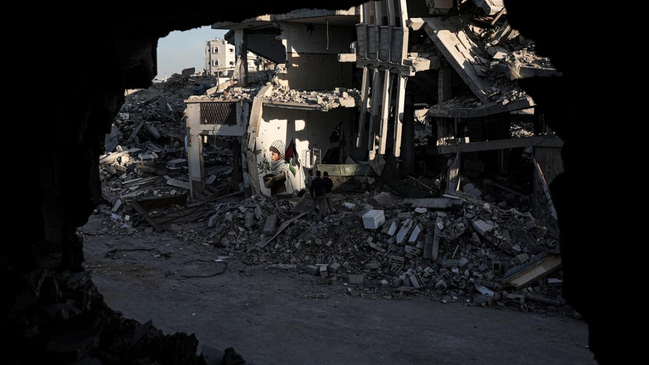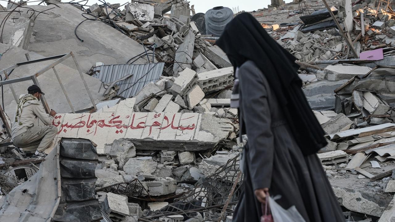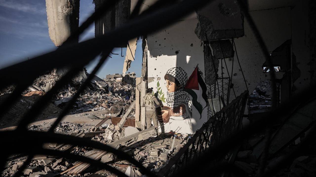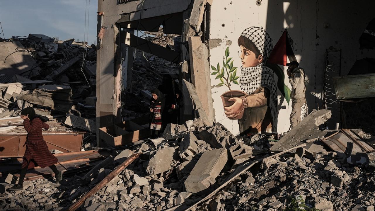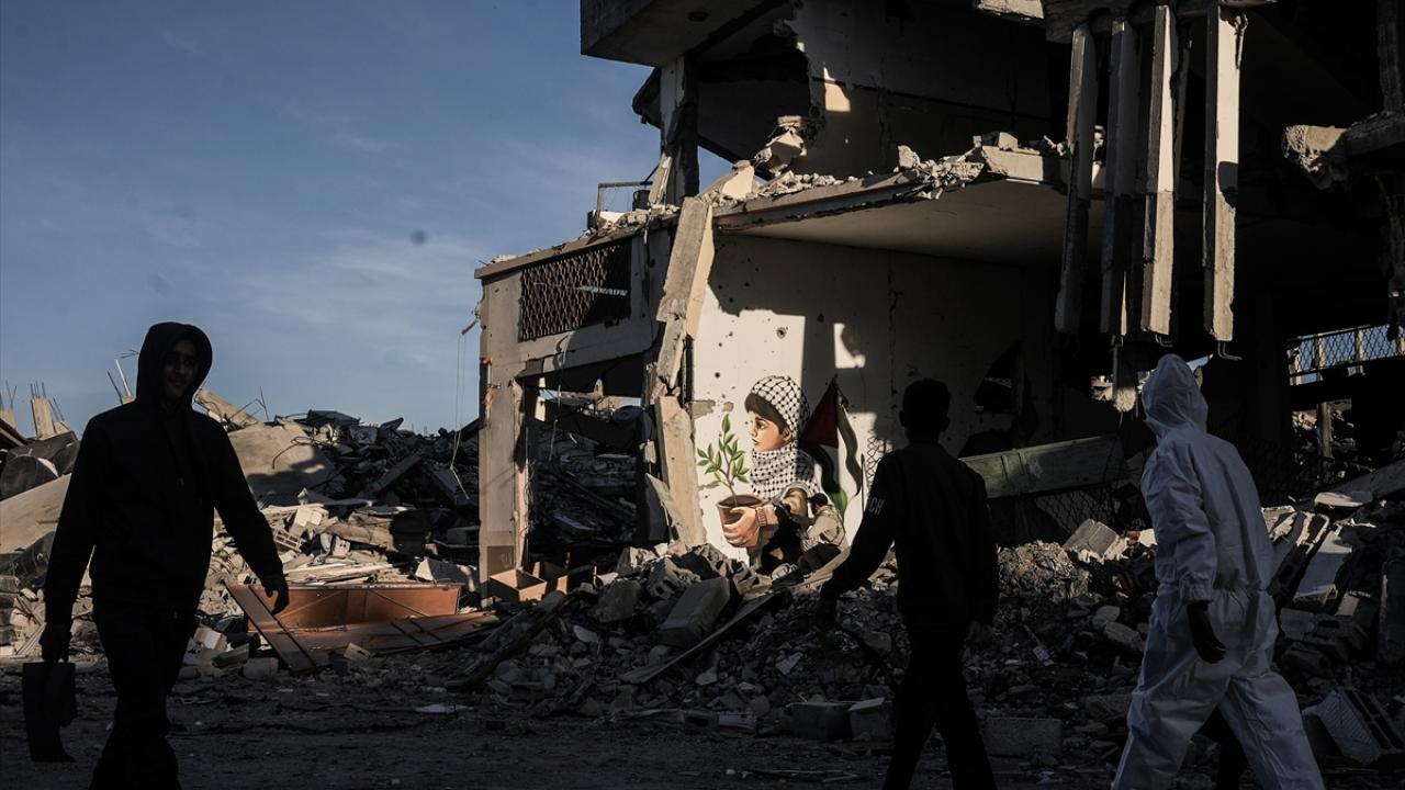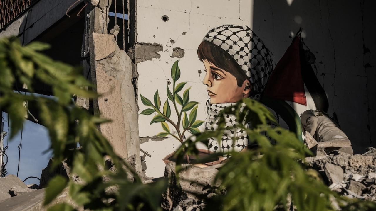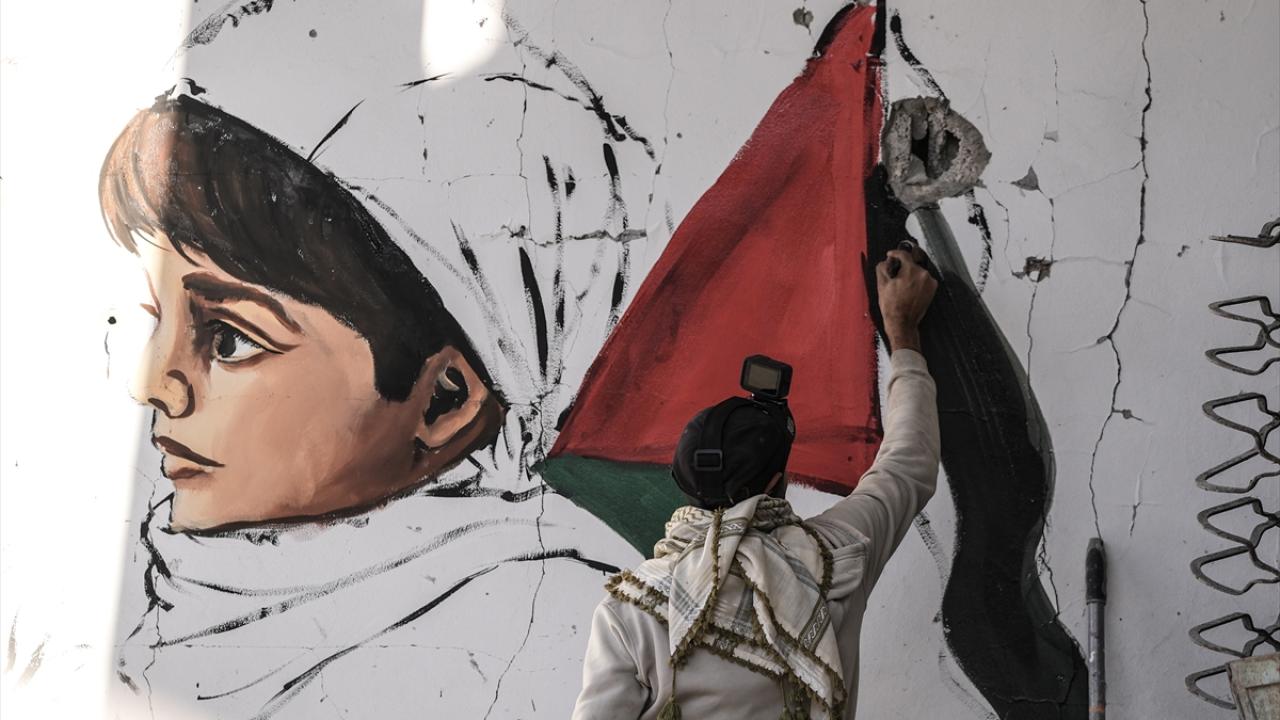 Hamas ve İsrail arasında mutabakata varılan Gazze'de ateşkes ve karşılıklı esir takası anlaşmasının yürürlüğe girmesinin ardından Filistinliler, Gazze'nin güneyinde yer alan Refah kentindeki evlerine dönmeye devam ediyor. Refah'taki evine dönen Filistinli bir sanatçı, evlerin enkazına azim, barış ve umudu ifade eden resimler çizerek sanatını icra ediyor.