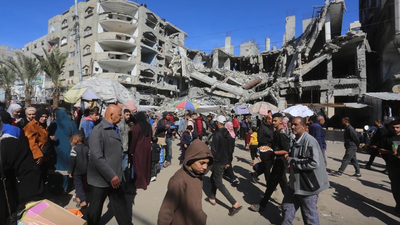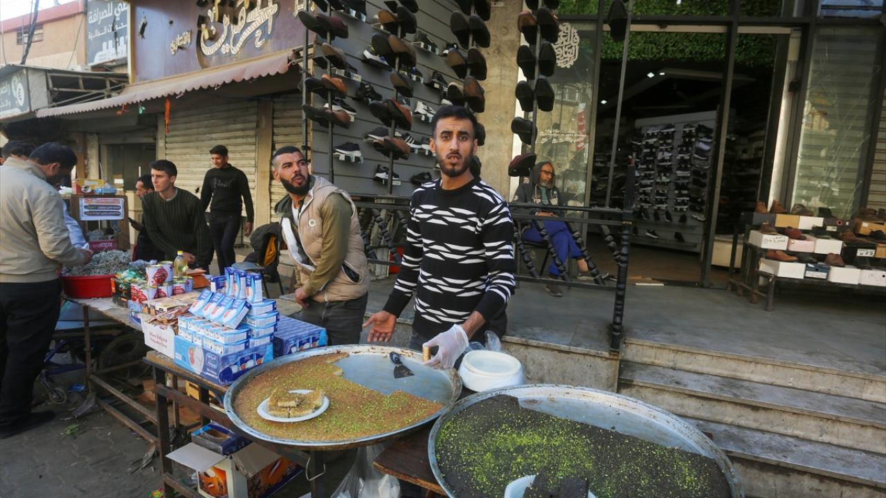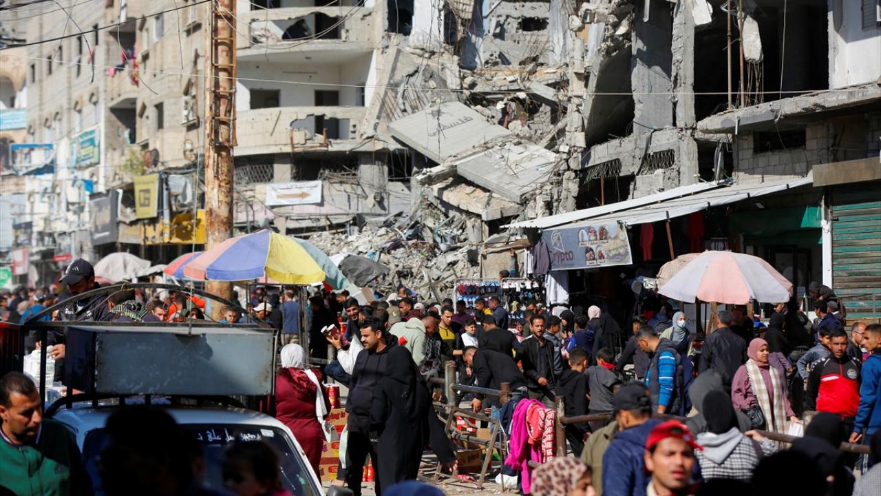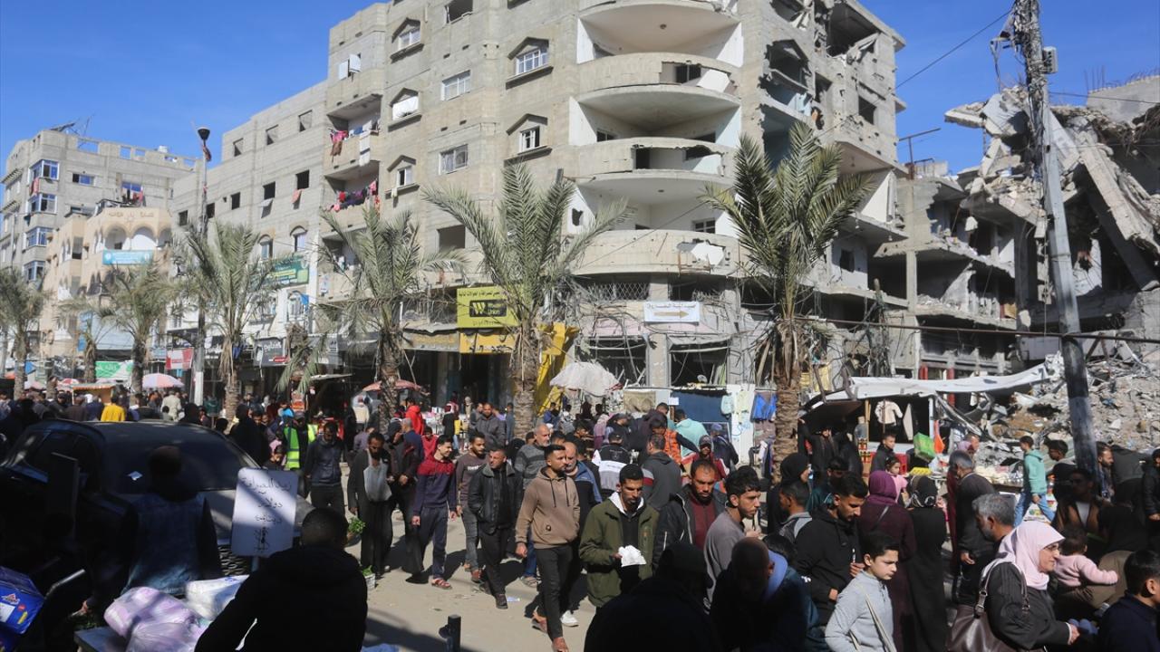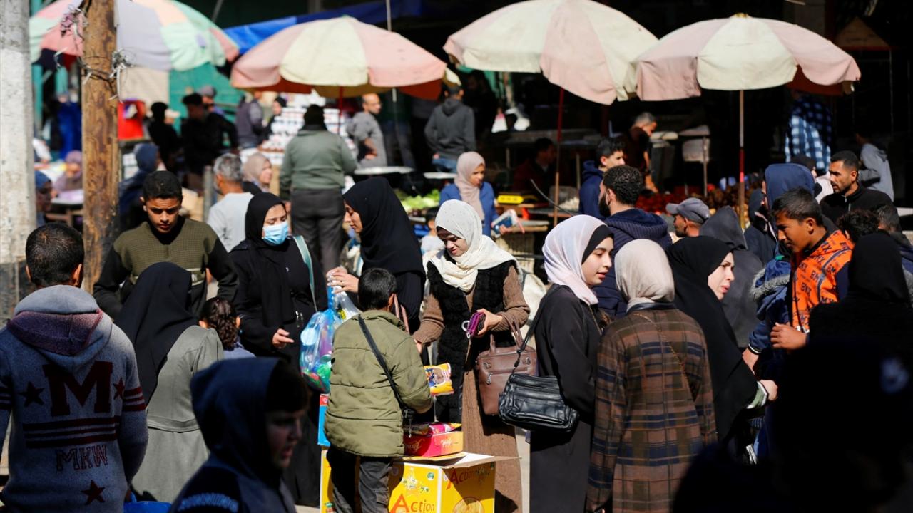Hamas ile İsrail arasında varılan mutabakatın ardından Gazze'de ateşkesin yürürlüğe girmesinin ardından Gazze Şeridi'nin orta kesiminde yer alan Nuseyrat Mülteci Kampı'ndaki Filistinliler, İsrail saldırıları sonucu ağır yıkıma uğrayan binalar arasında günlük yaşamlarını sürdürüyor.