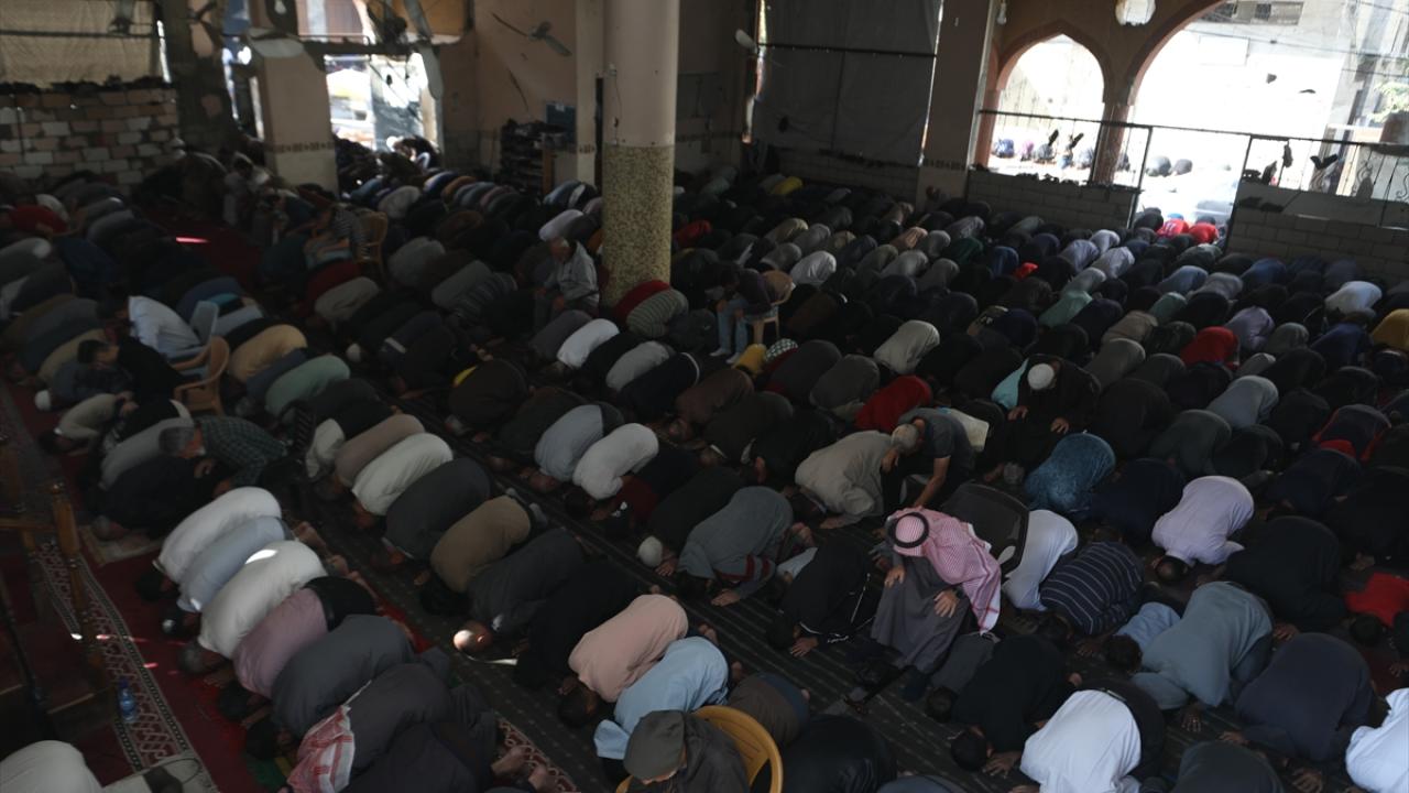 Filistinliler, İsrail saldırıları sonucu hasar gören Faruk Camii`nde ve çevresinde saf tuttu.