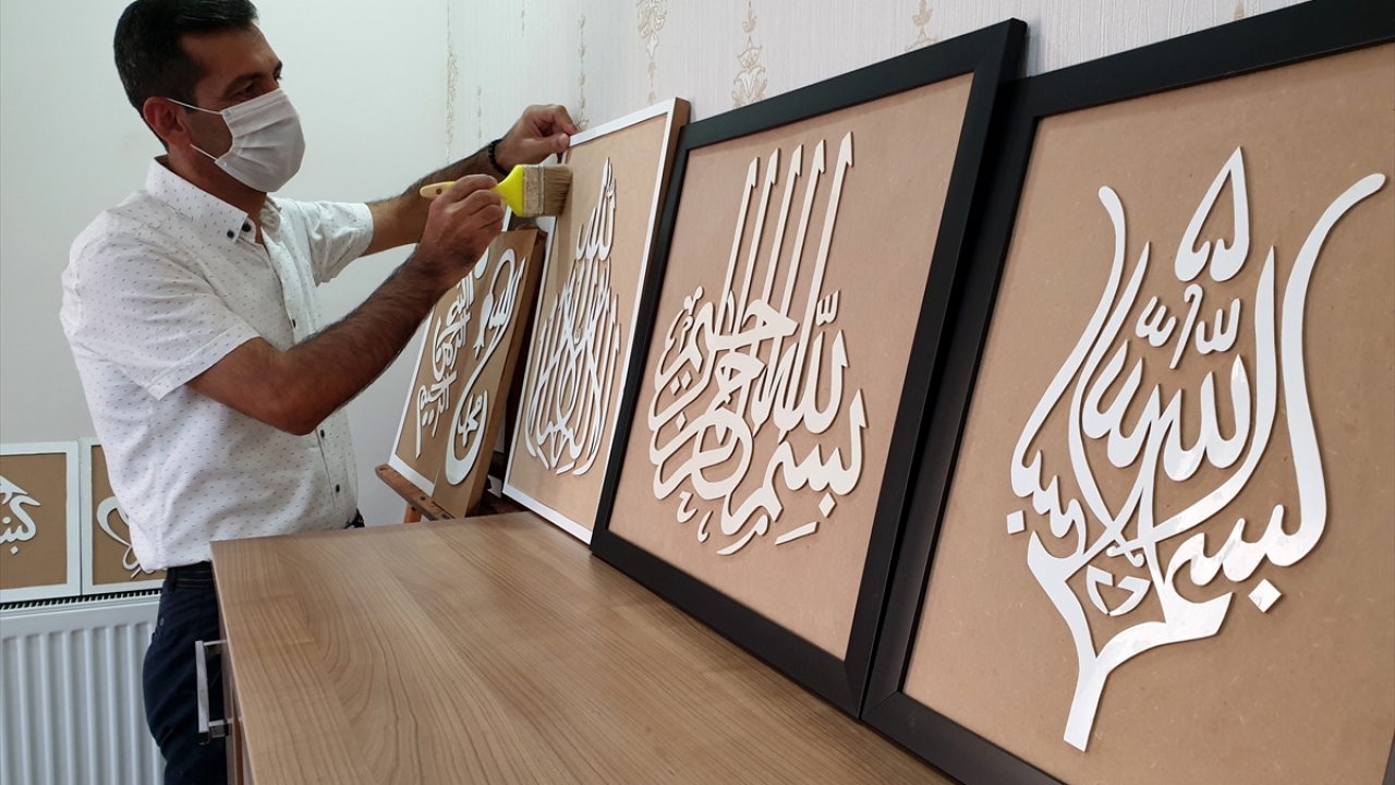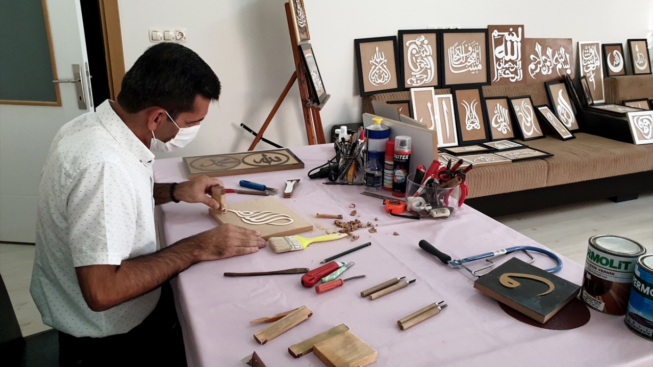 Osmaniye'nin Kadirli ilçesinde yaşayan coğrafya öğretmeni Ahmet Doğan, marangoz ve mobilyacılardan topladığı atık tahtaları ahşap oyma ve hat teknikleriyle işliyor.