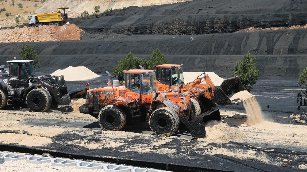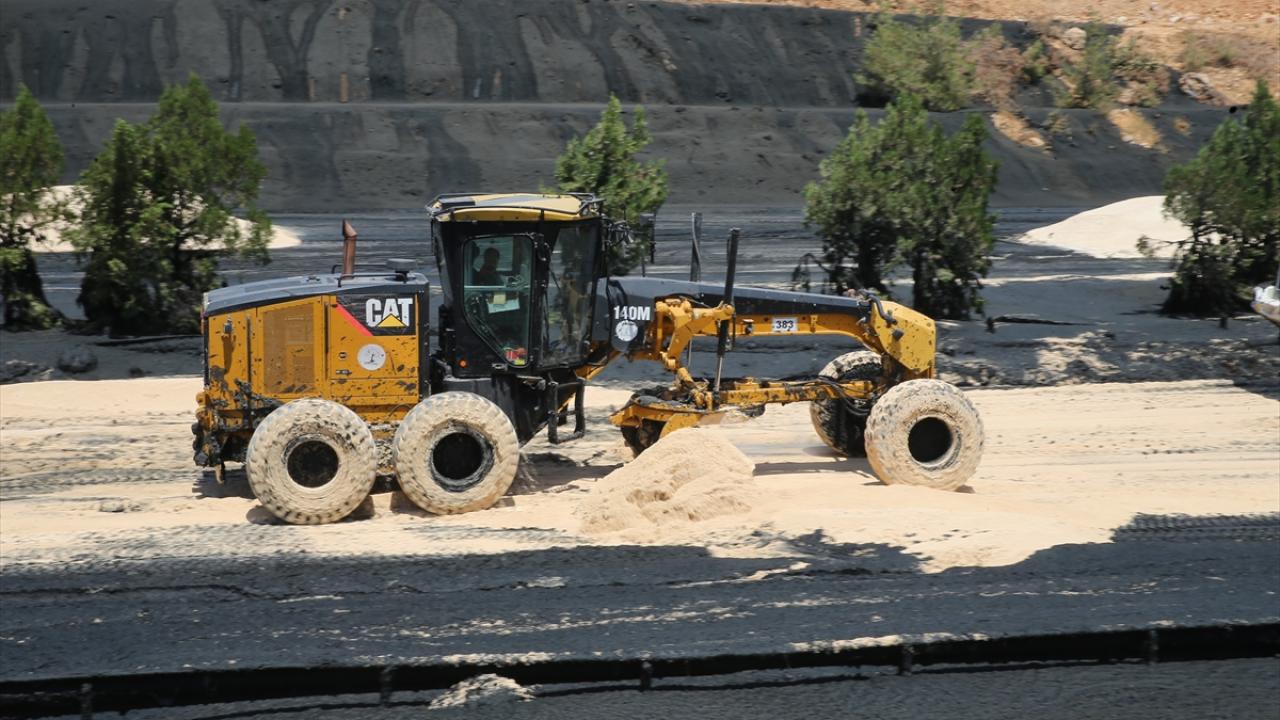 Tali yollardan atık su birikintisinin olduğu alana ulaşan onlarca iş makinesi, otoyolun çevresindeki dağlık yerlerden delikler açarak suyu tahliye ediyor.