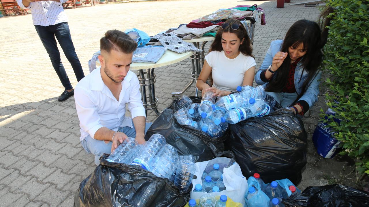"Burada 10 bin çanta olabilecek kumaş topladık. Diktiğimiz çantaları, plastik şişelerle değiştirmeye karar verdik. Üç yerde stant kurduk. Çantalarımızı 20 plastik şişe karşılığında veriyoruz. Bu projeyle yaklaşık 200 kilogramlık plastiğin çevreye atılmasını engellemiş olacağız."