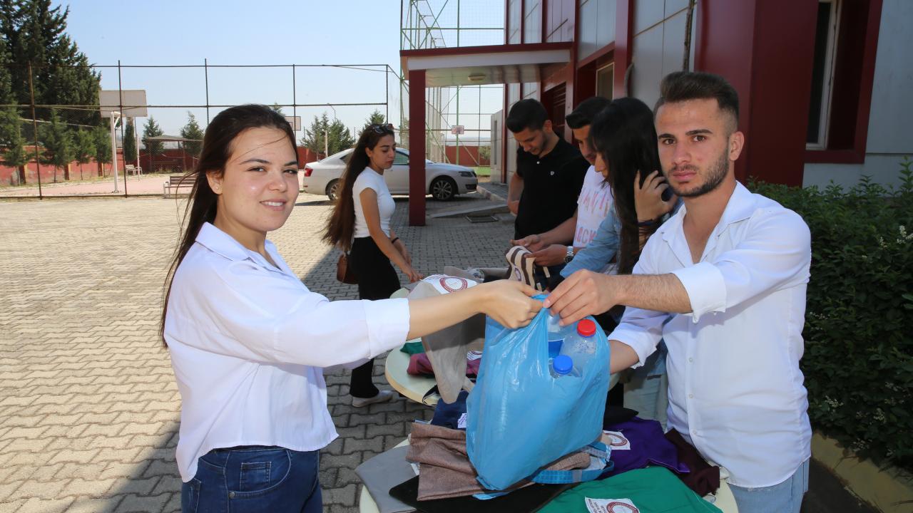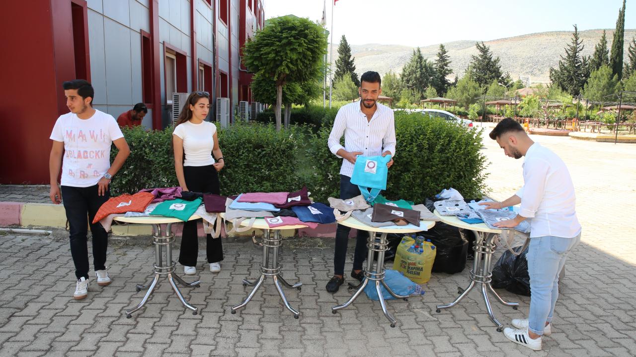 Farklı bölümlerdeki 20 öğrenci, "Toplumsal Hizmet Projesi" dersi kapsamında Öğretim Görevlisi Hamit Basık`ın koordinatörlüğünde hazırladıkları projeyle, bir ay boyunca ilçedeki tekstil atölyeleriyle terzileri dolaşarak atık kumaşlarla kıyafetleri topladı.
