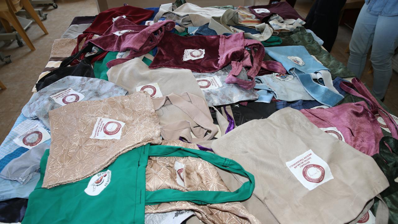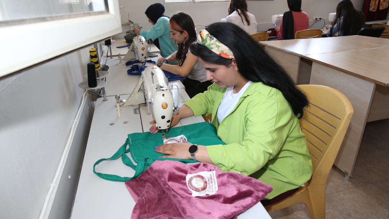 Reyhanlı Halk Eğitim Merkezi`nde usta öğreticilerden dikiş kursu alan öğrenciler, topladıkları atık kumaşları bez çantaya dönüştürdü.
