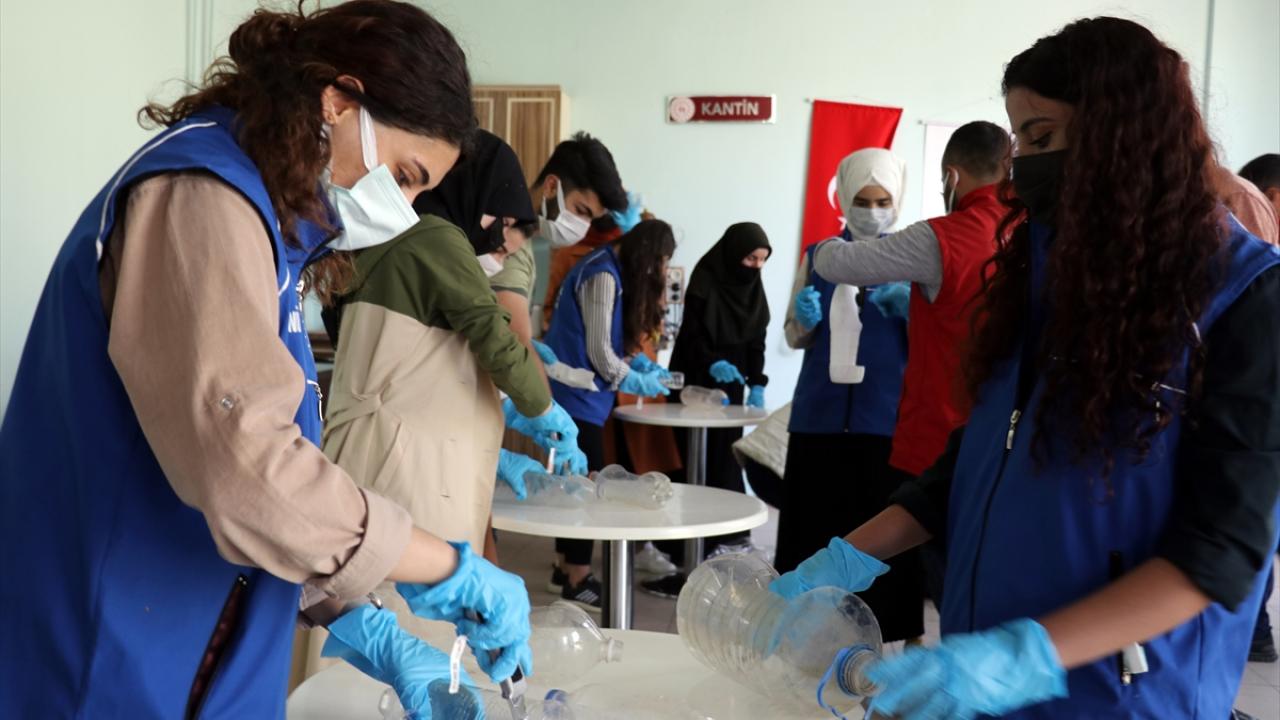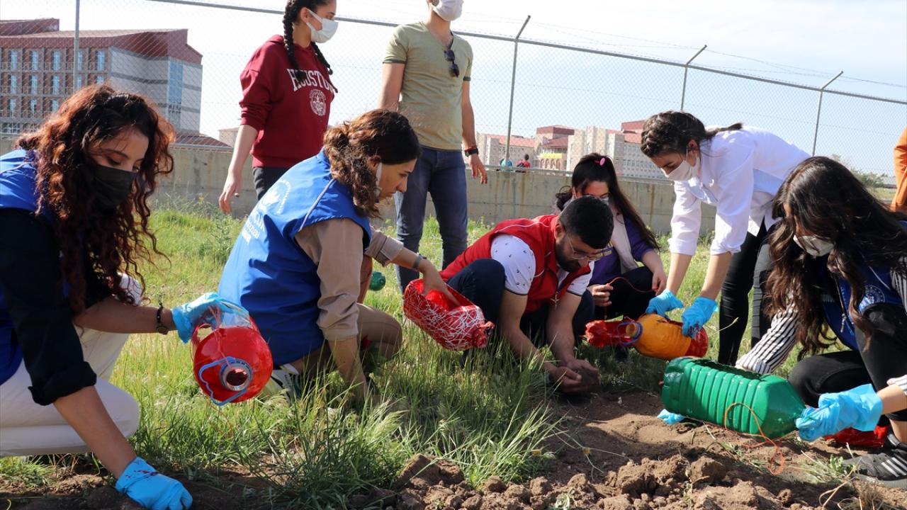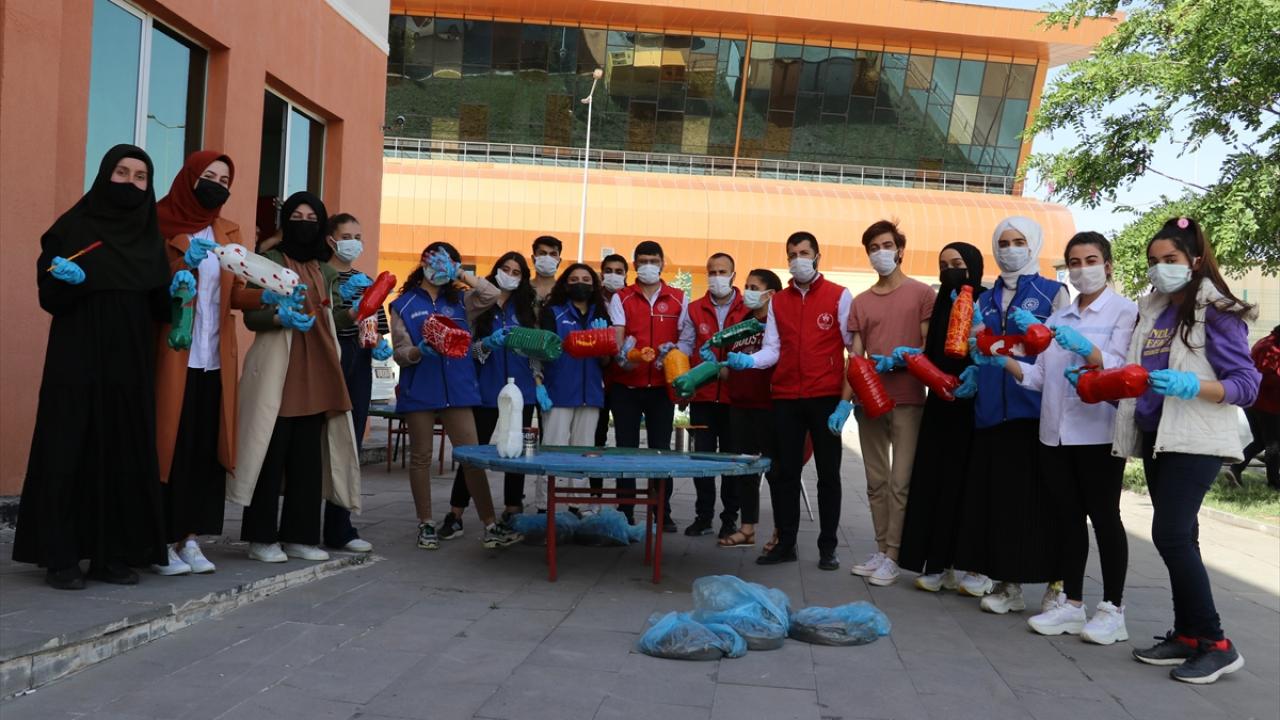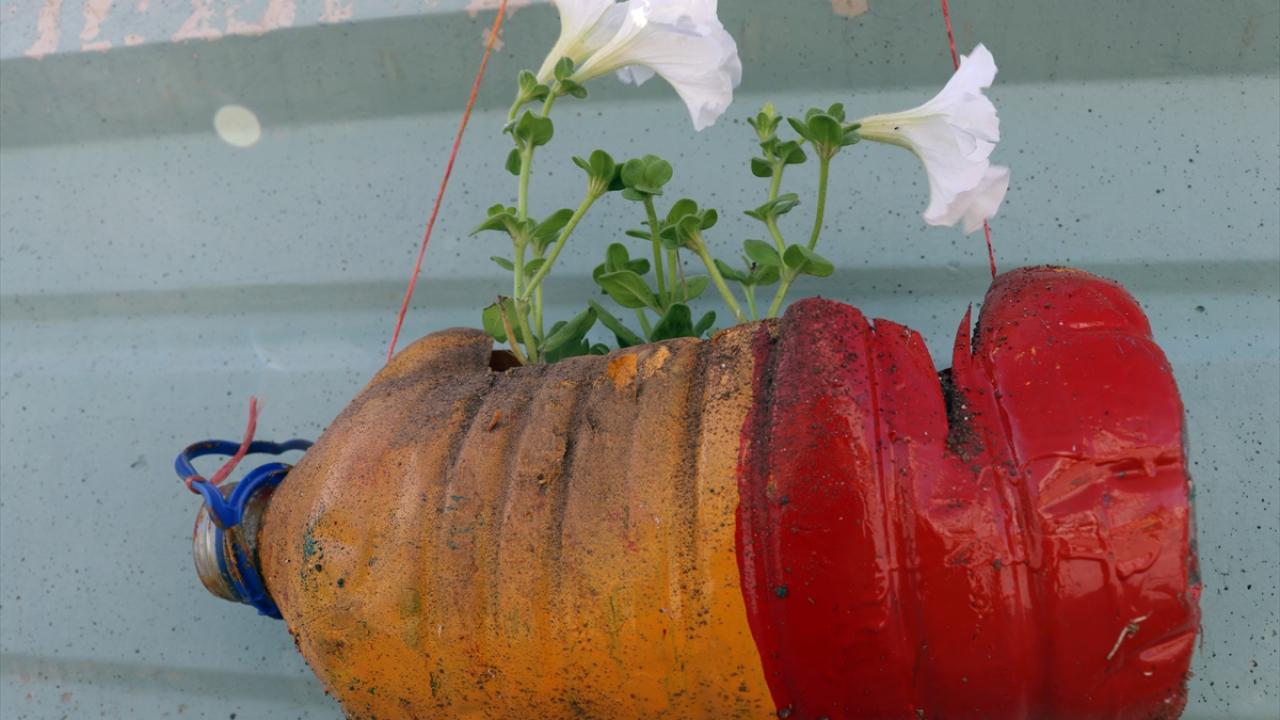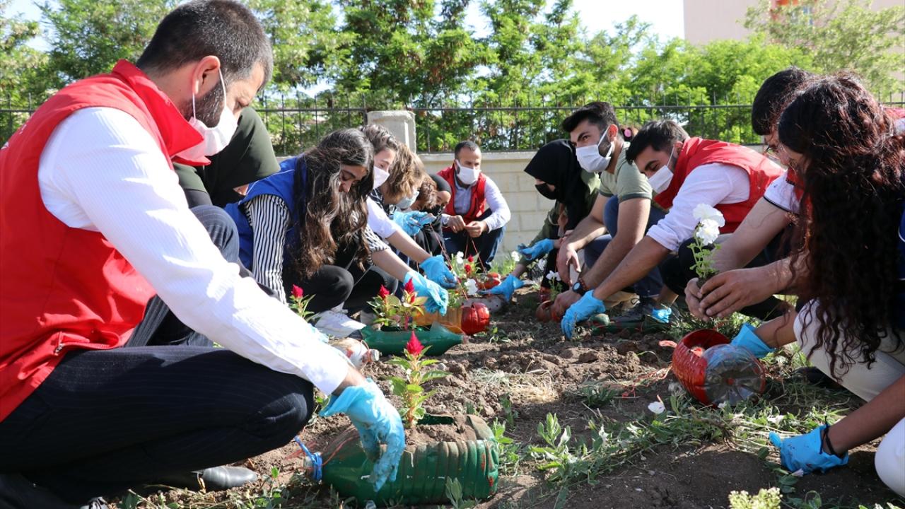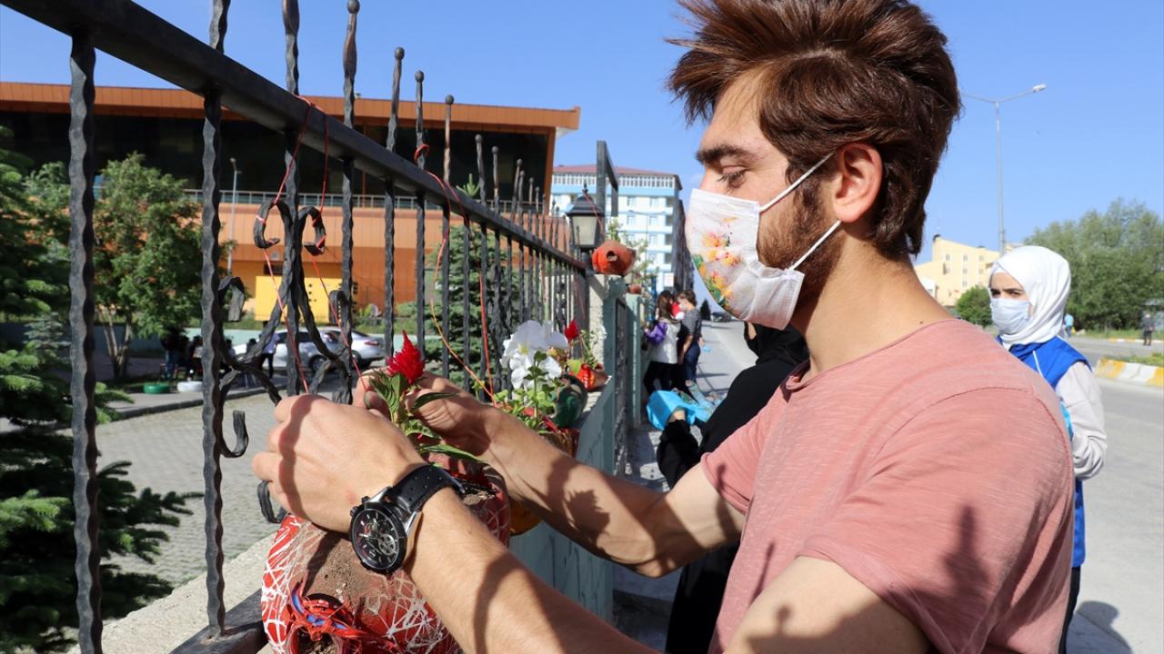 Ağrı'da bir araya gelen Gençlik Merkezi çevre timi gönüllüleri, çevre bilinci konusunda farkındalık oluşturmak amacıyla çöplerden topladıkları plastik pet şişeleri rengarenk boyayıp çiçek dikerek şehrin farklı noktalarına yerleştiriyor.