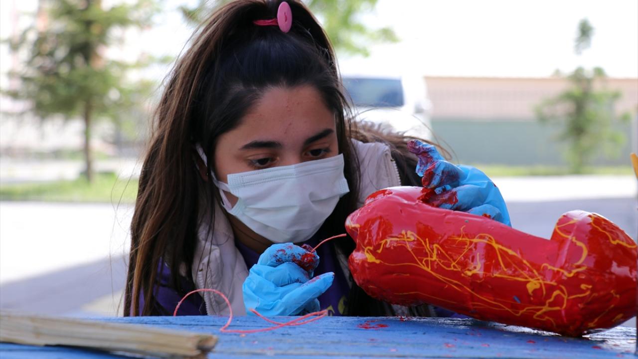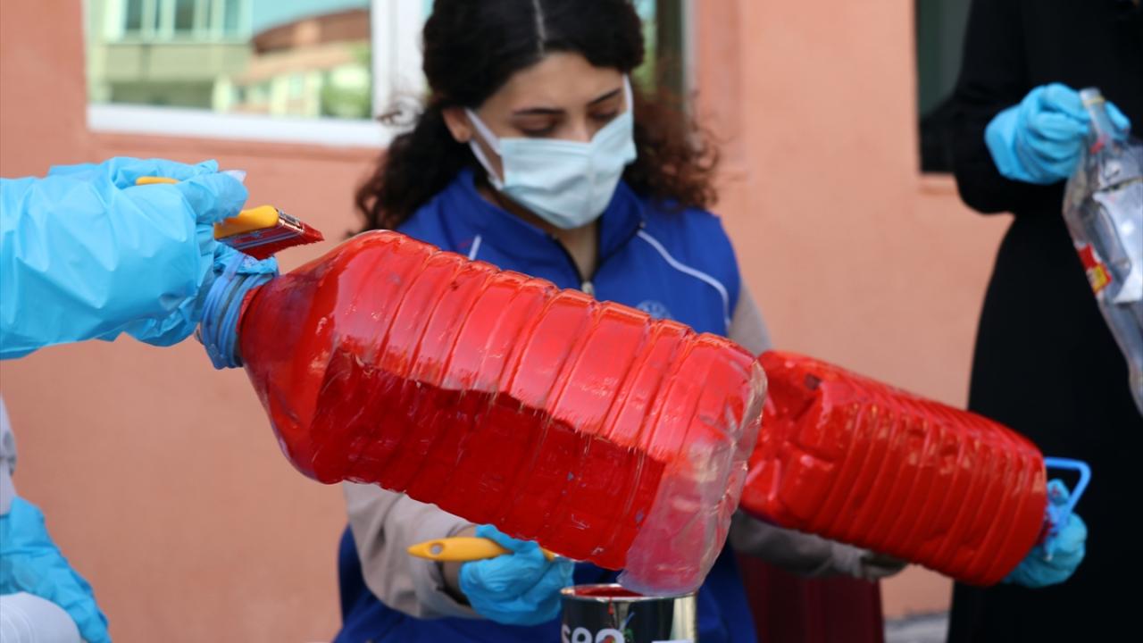 Söz konusu malzemeleri el birliğiyle yıkayıp temizleyen gönüllüler, maket bıçağıyla kesip saksı haline getirdikleri atık malzemeleri sarı, yeşil ve mavi renklere boyayıp saksıya dönüştürüyor.