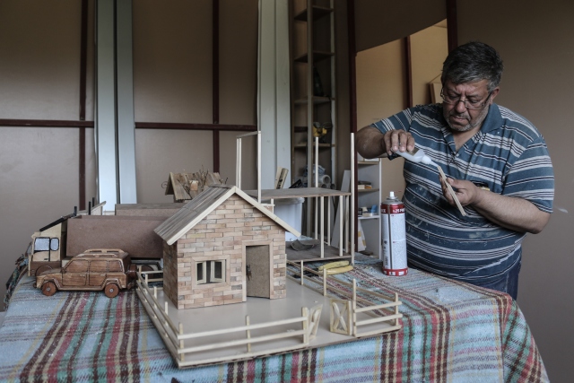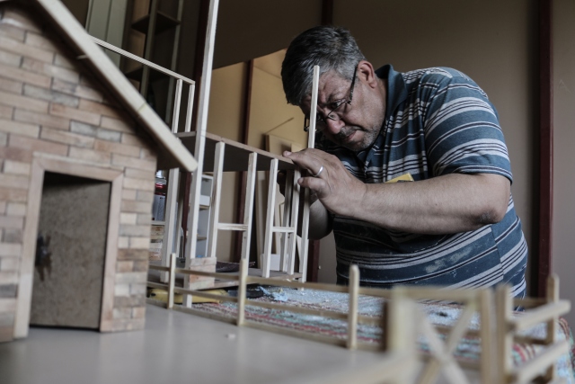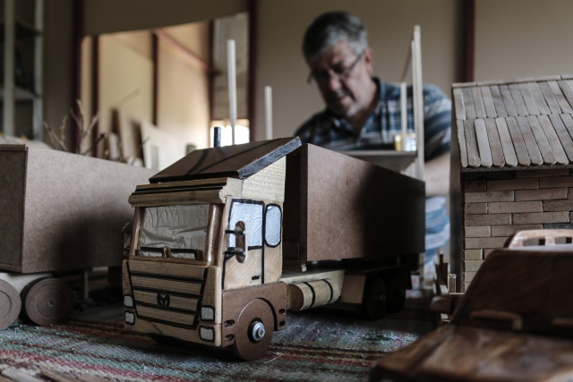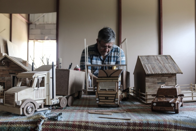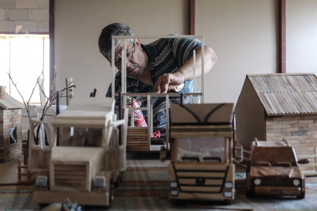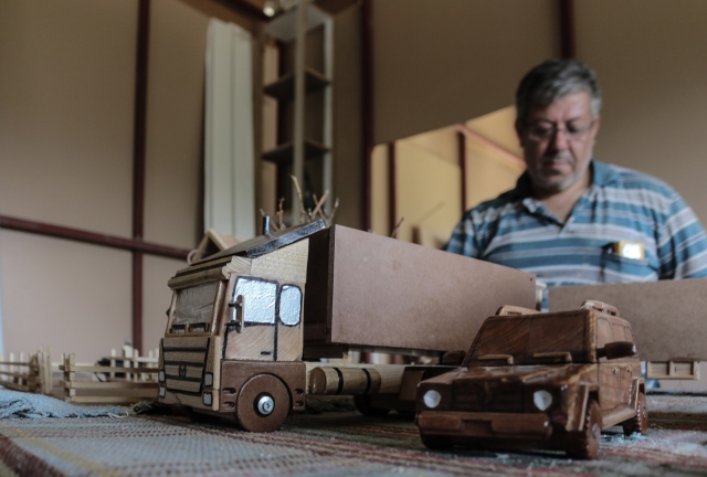 Ülkesindeki iç savaştan kaçarak Hatay'ın Arsuz ilçesine yerleşen Suriyeli marangoz Abdulfatah Sıhhıda, çalıştığı iş yerindeki atık ahşap parçalar ve sokaktan topladığı dondurma çubuklarıyla birbirinden ilginç maketler yapıyor.