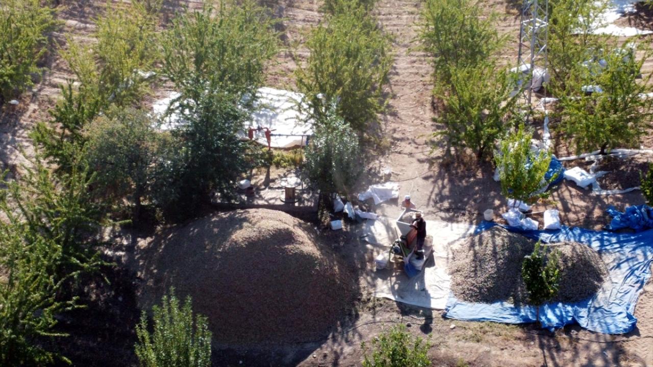 Üreticilerin bu yıl bademde beklediği rekolte yaklaşık 400 ton. Ağaçlardan silkeleme yöntemiyle yere serilen brandalara dökülen bademler, daha sonra dal, yaprak ve yeşil kabuklarından ayıklanması için patoza atılıyor.