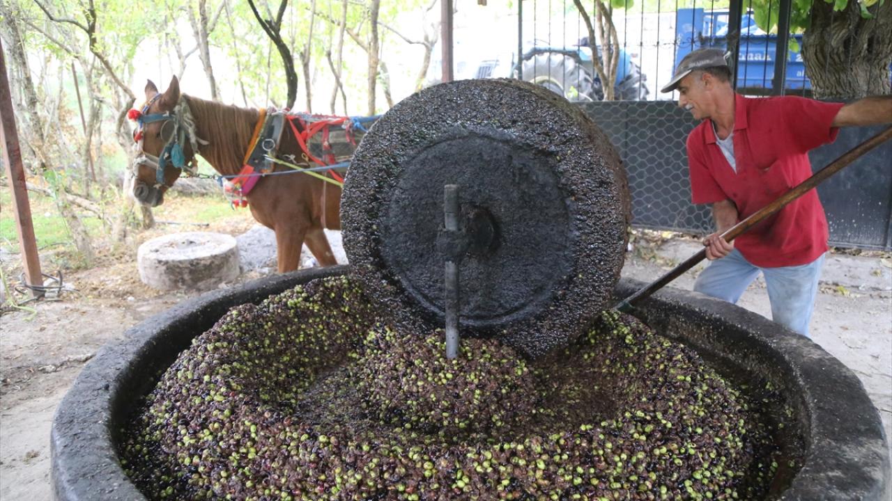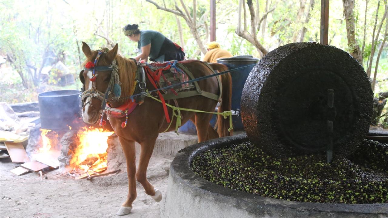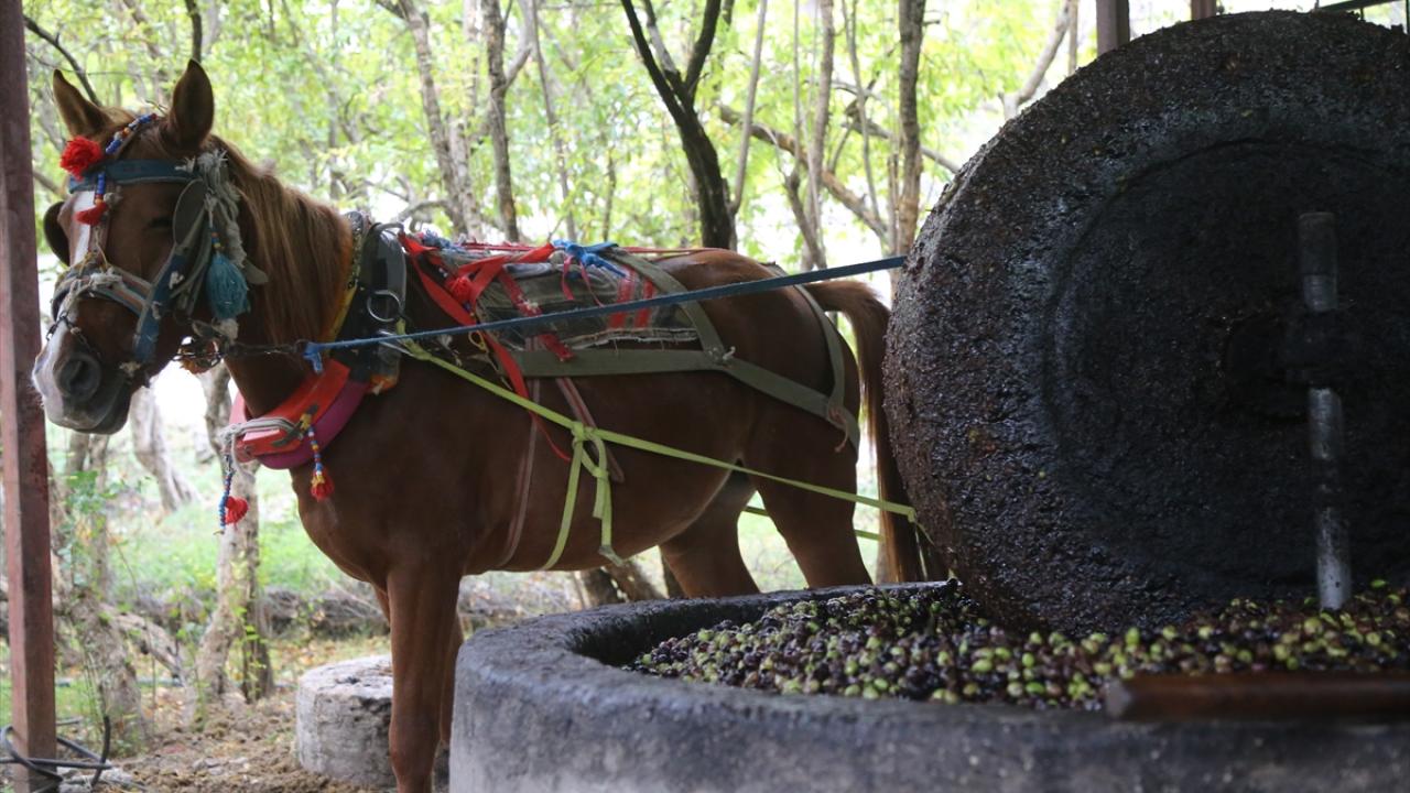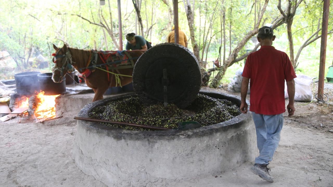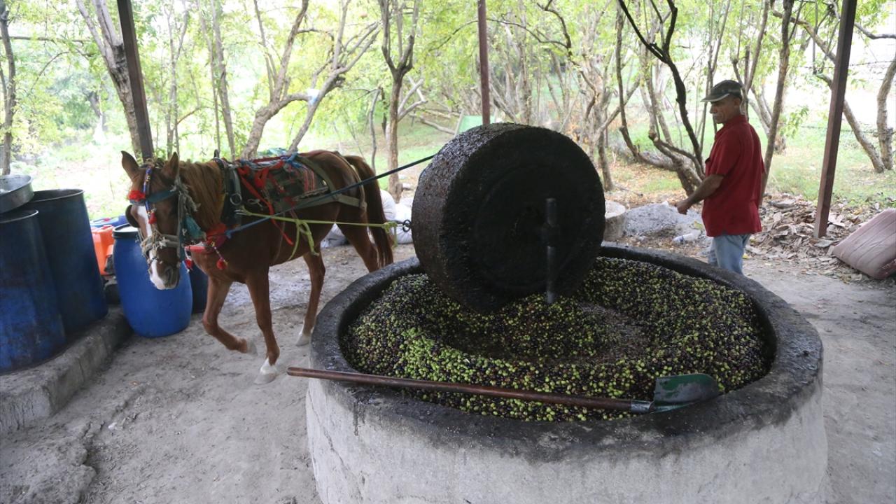 Dalından toplanan zeytinler, asırlık taş değirmenin altına yerleştiriliyor. At gücüyle çevrilen değirmende ezilen zeytinler, bir süre fıçılarda bekletiliyor. Sonrasında ılık suda yıkanan tanelerin yüzeye çıkan yağı süzülüp şişeleniyor.