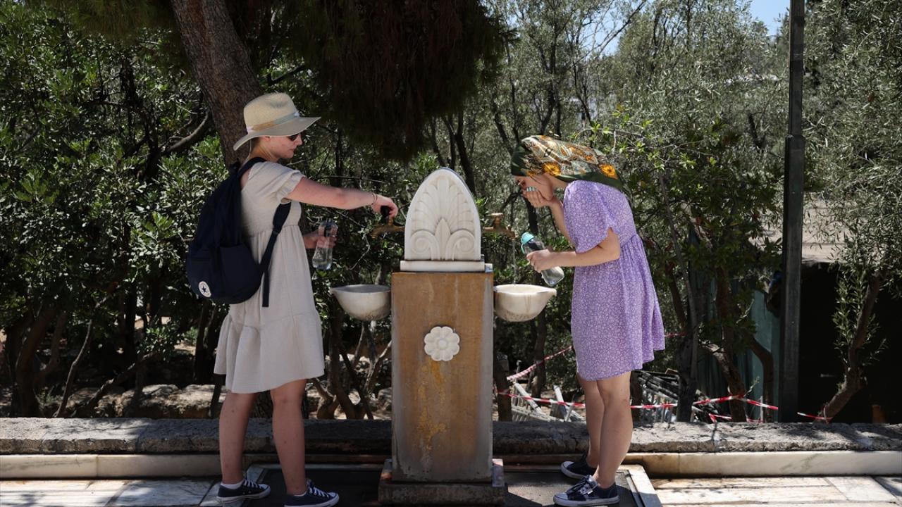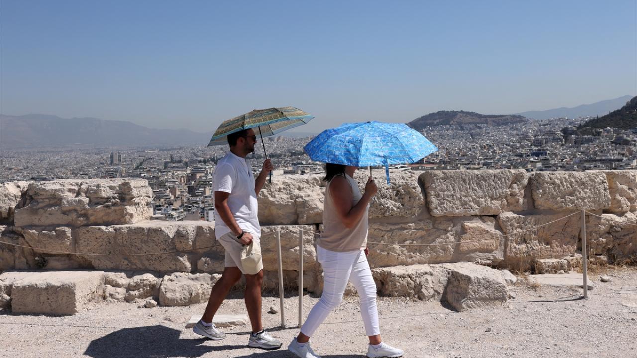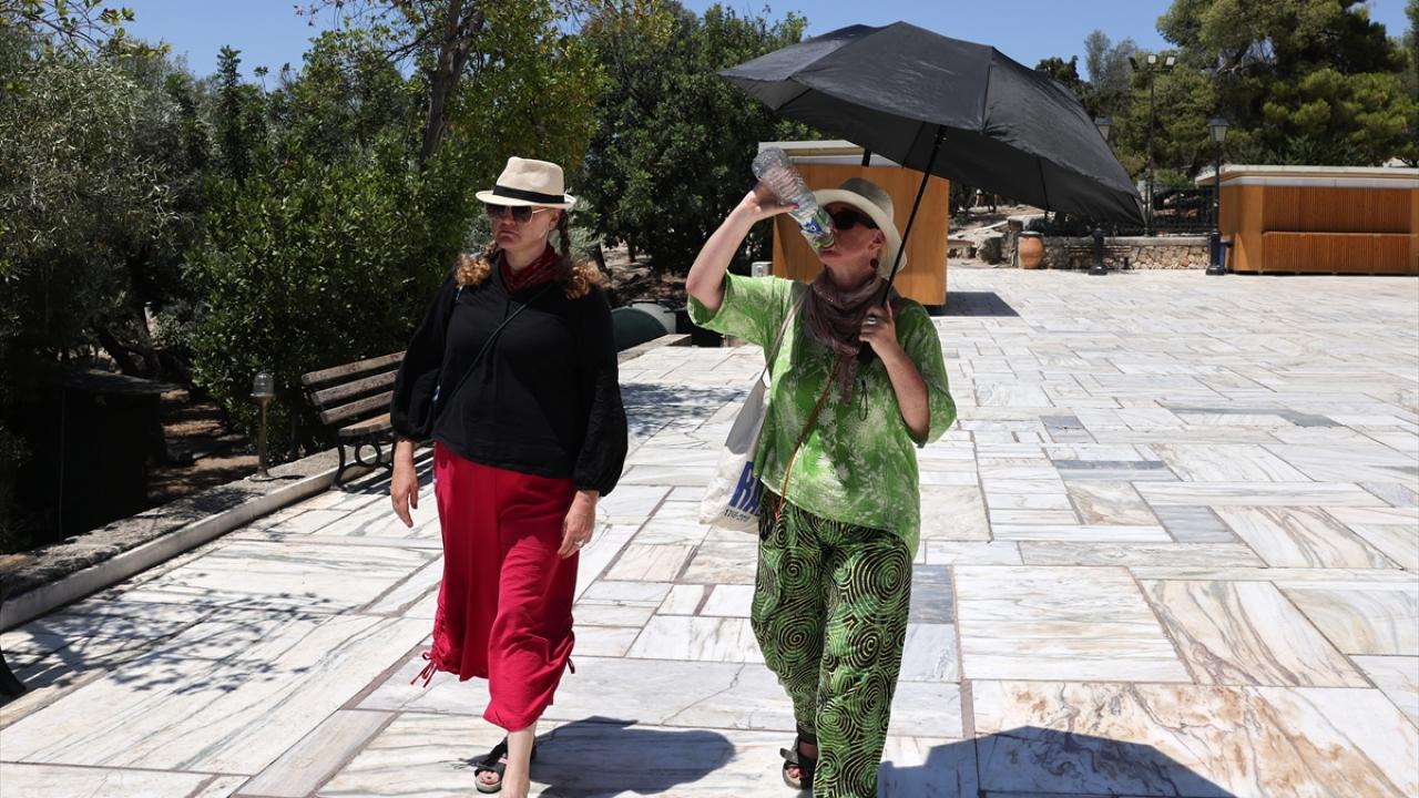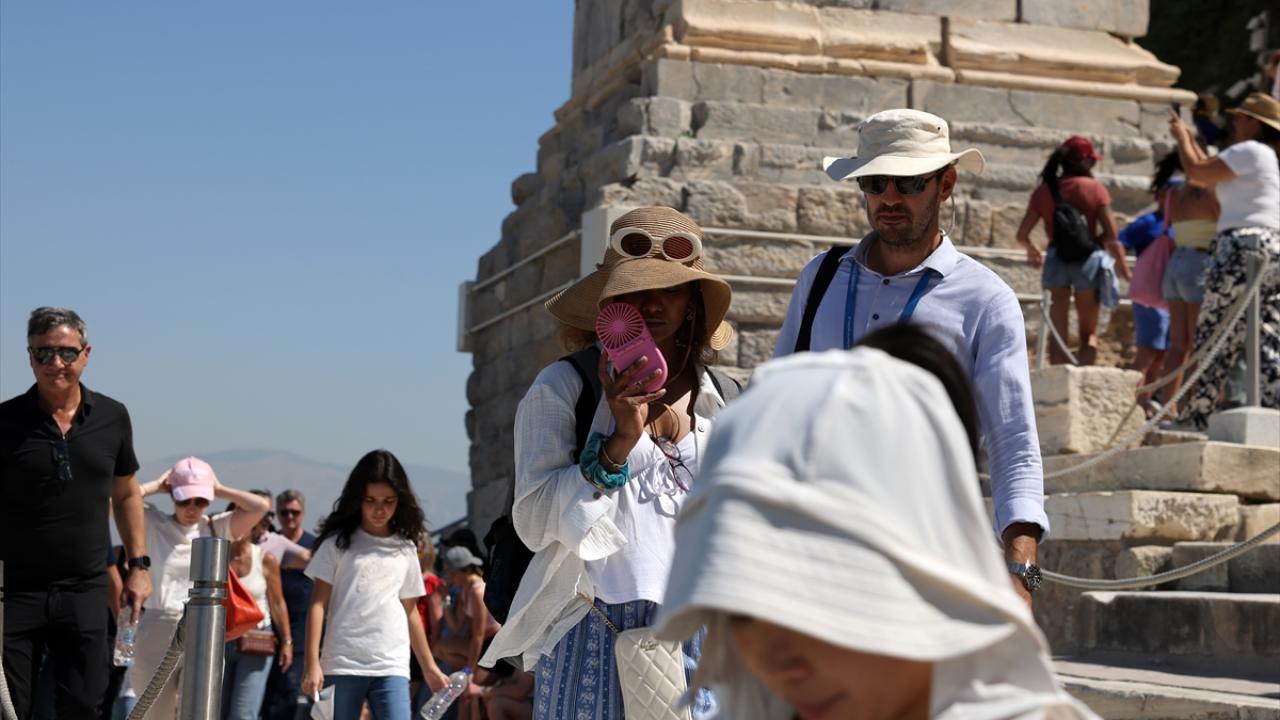 Yunanistan'ın başkenti Atina'da Akropolis'i ziyaret eden turistler, kent genelinde etkili olan sıcak hava dalgasından korunmak için şapka, el vantilatörü ve şemsiye kullandı.