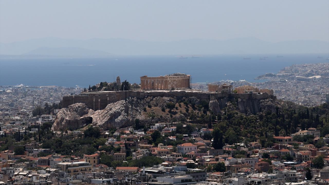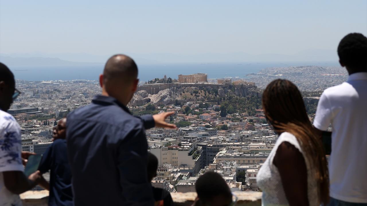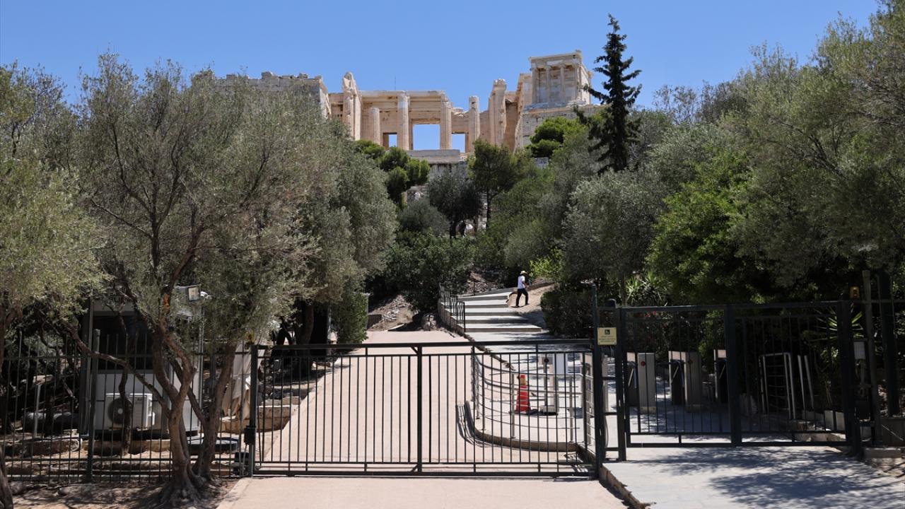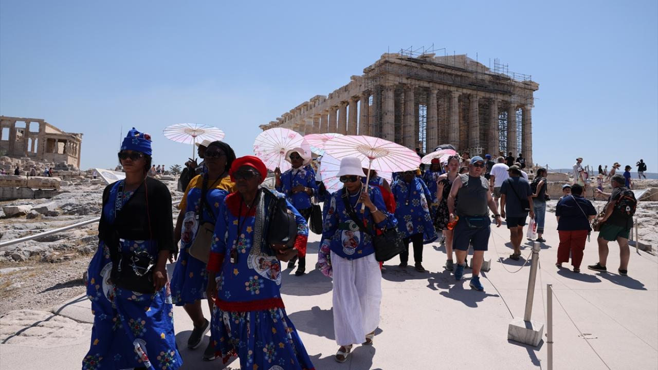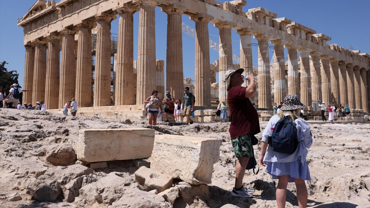 Yunanistan'ın başkenti Atina'da Akropolis'i ziyaret eden turistler, kent genelinde etkili olan sıcak hava dalgasından korunmak için şapka, el vantilatörü ve şemsiye kullandı.