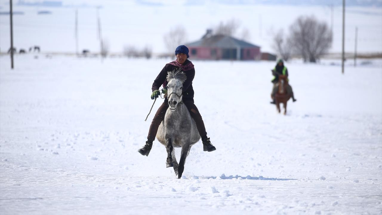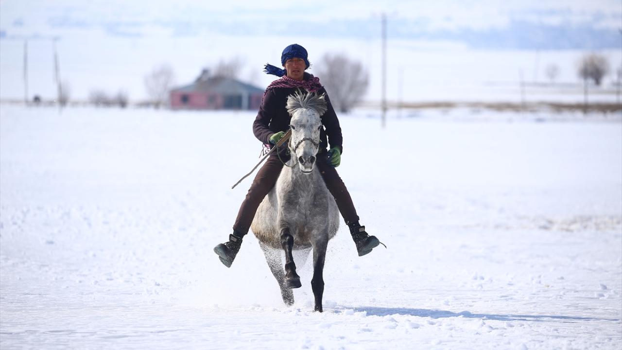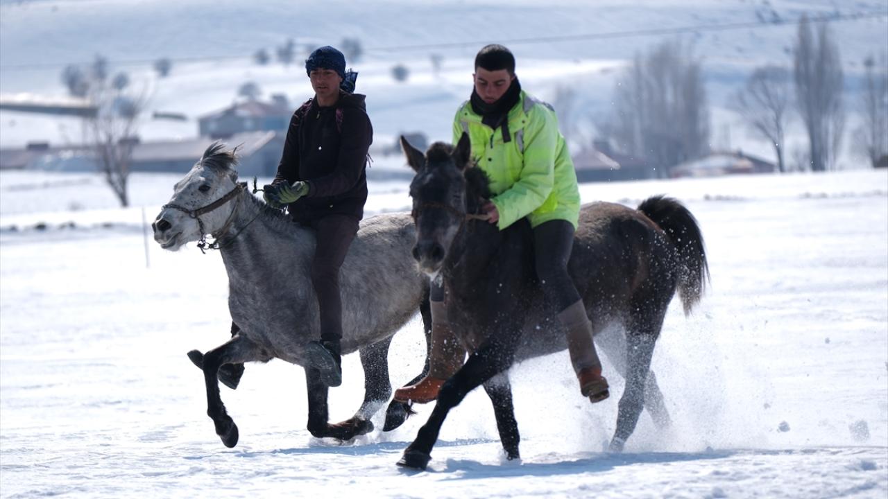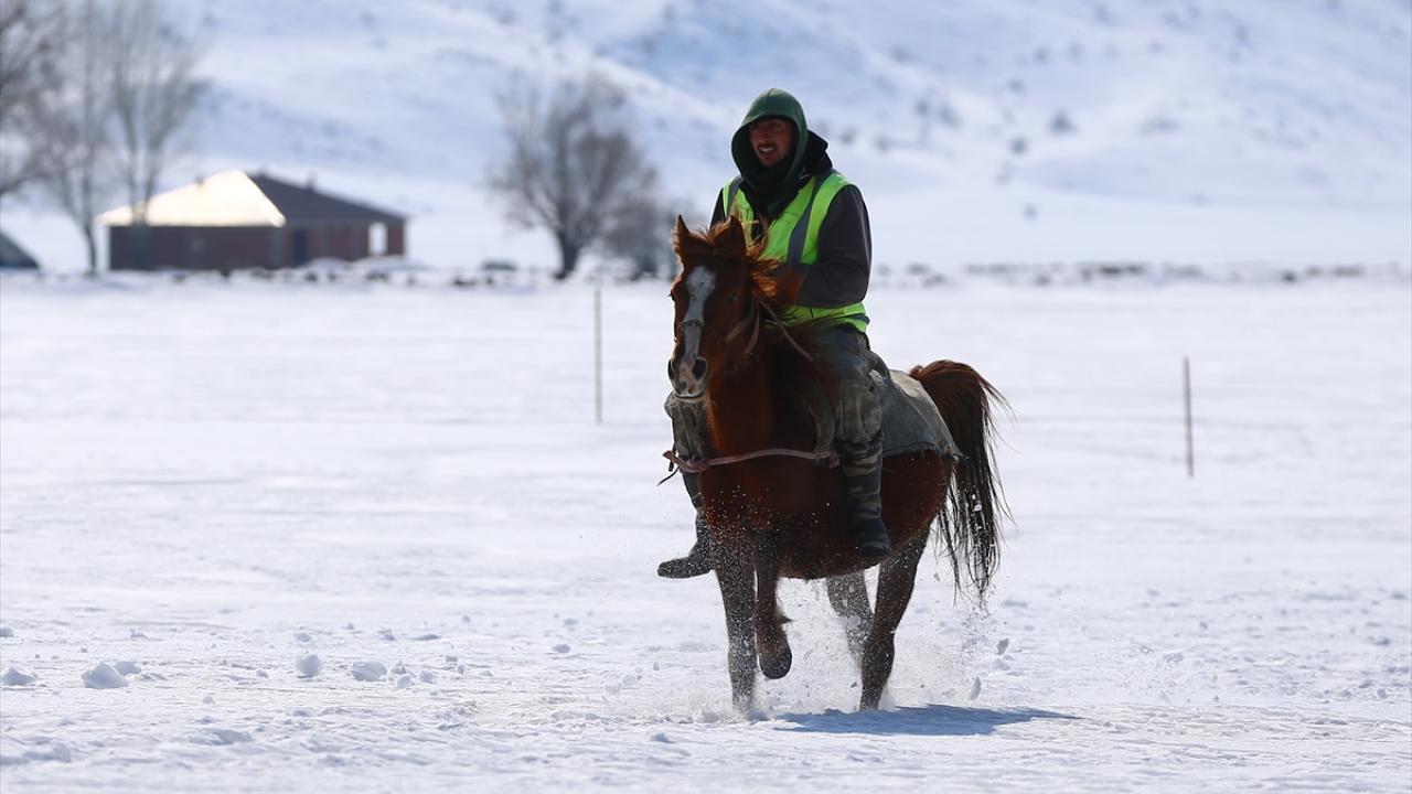Beyaz örtüyle kaplı arazide at binen ve dört nala ilerleyen gençler, sert ve karlı zeminde hayvanlarının sakatlanmamasına da özen gösteriyor.