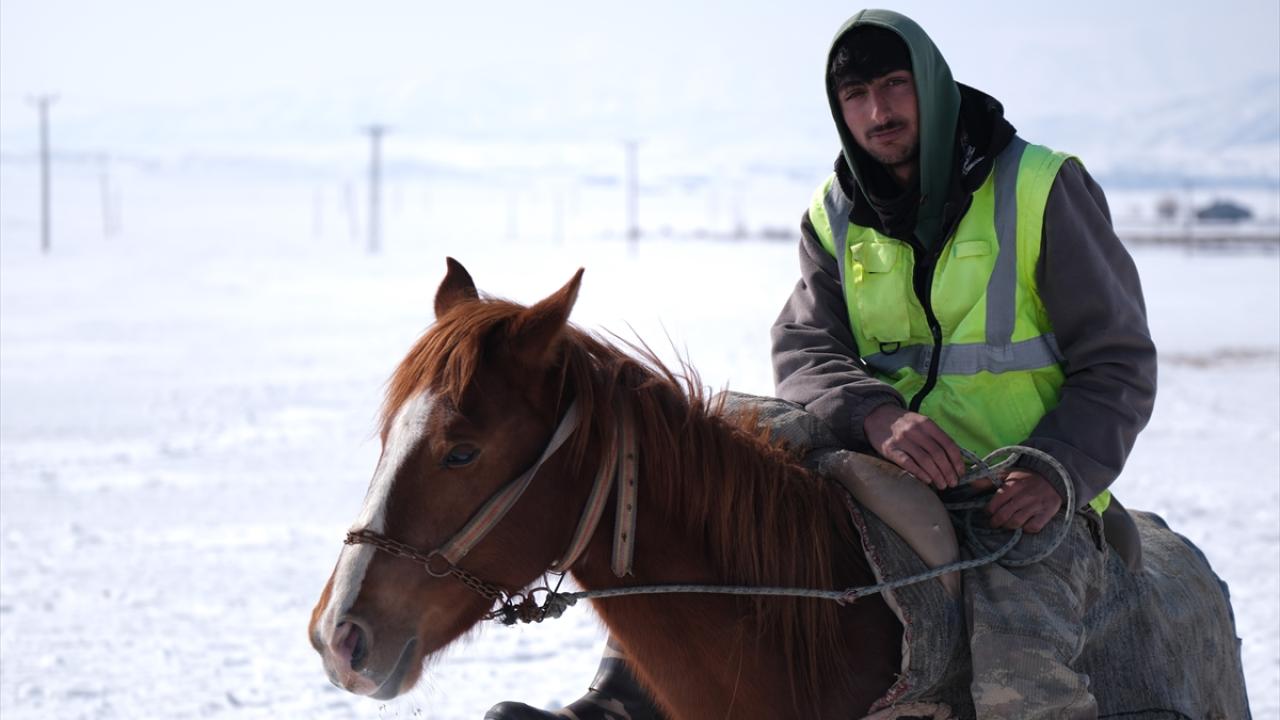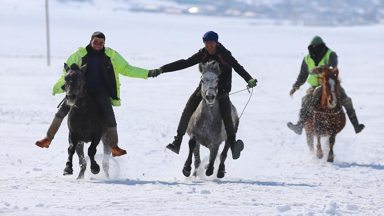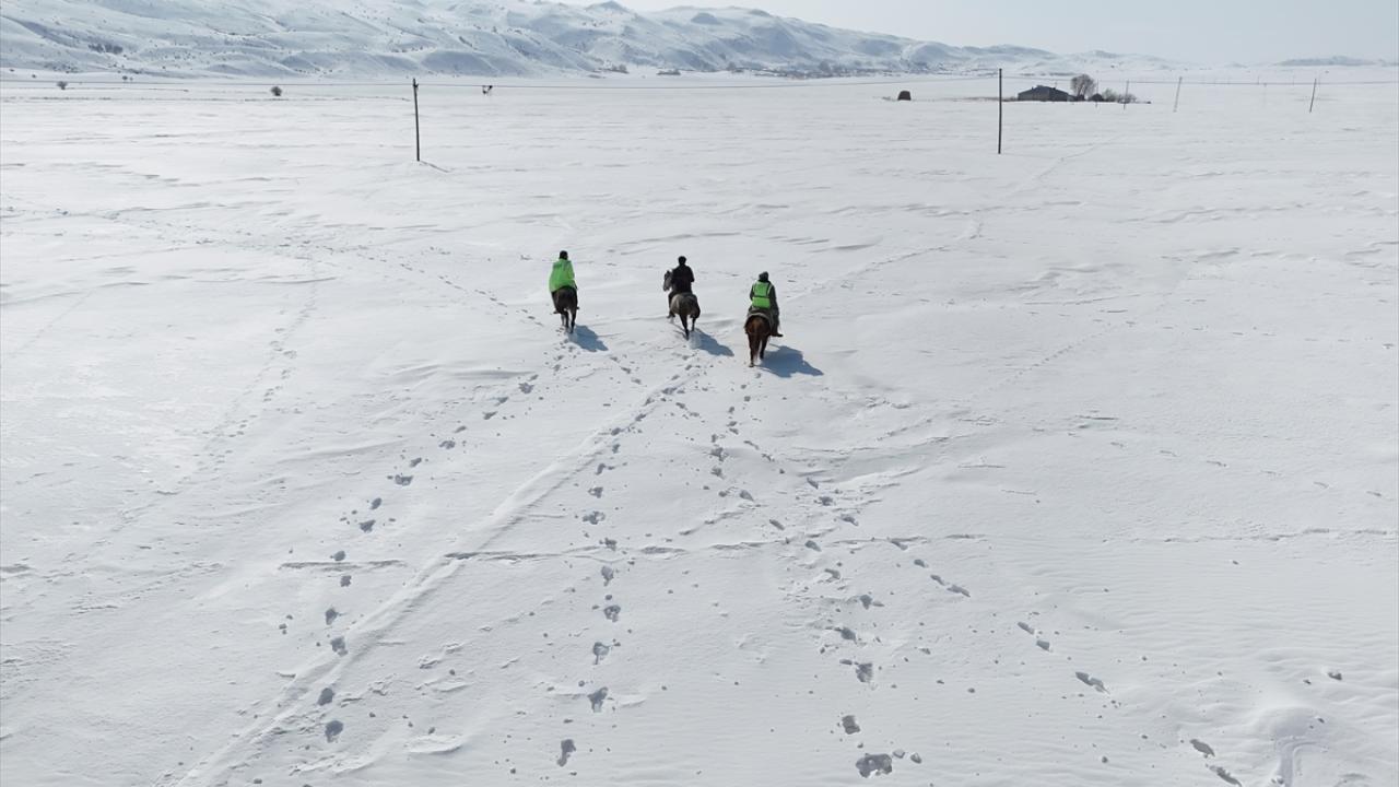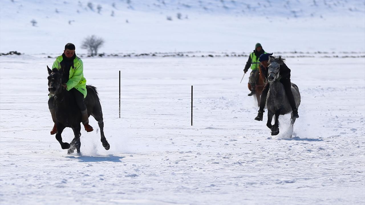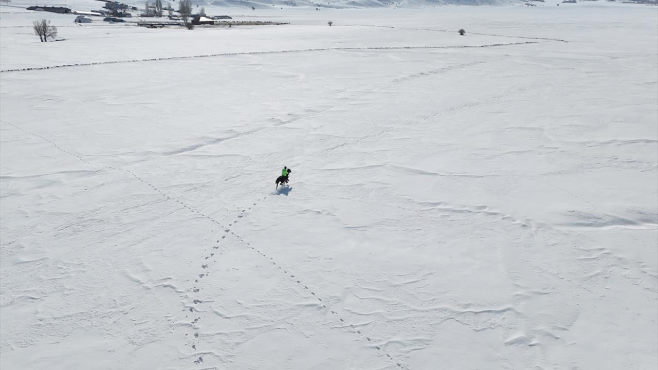 Beyaz örtüyle kaplı arazide at binen ve dört nala ilerleyen gençler, sert ve karlı zeminde hayvanlarının sakatlanmamasına da özen gösteriyor.