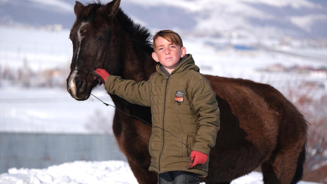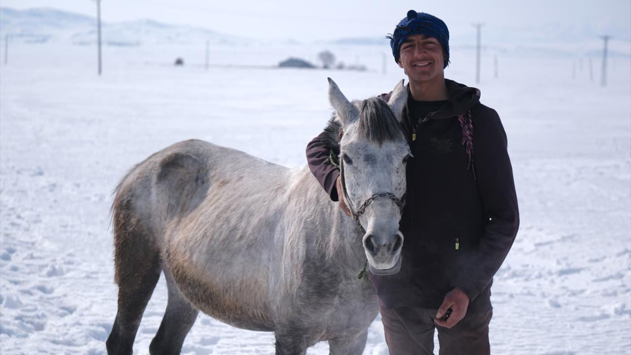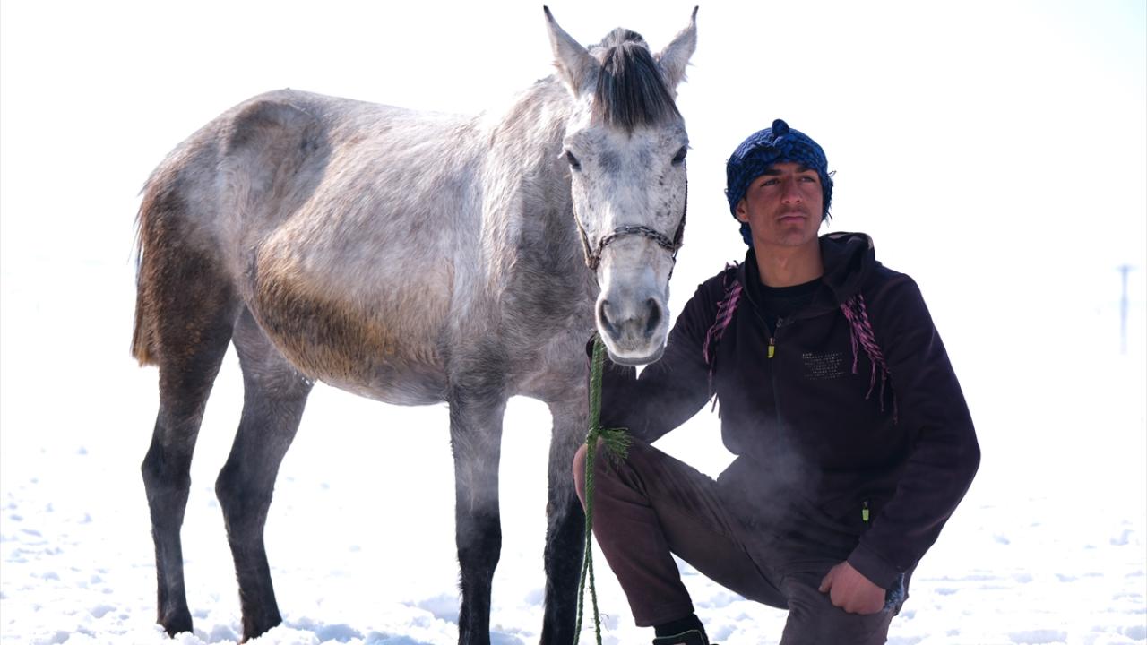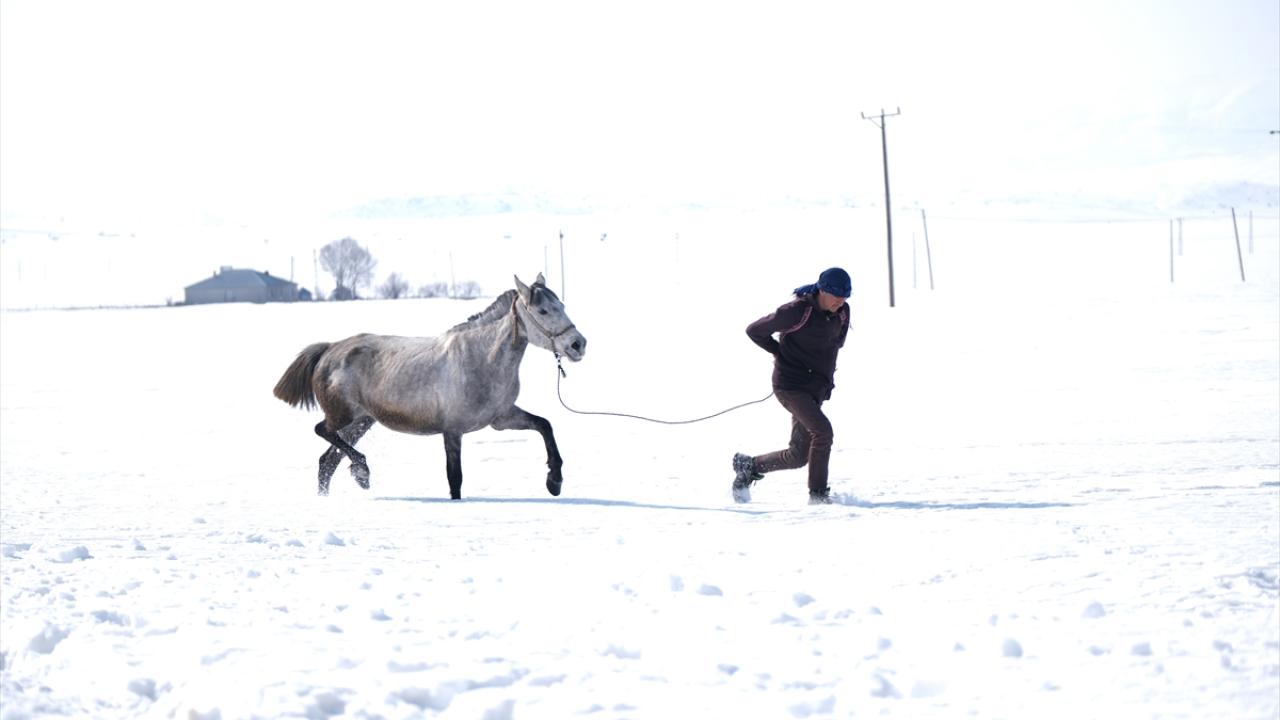 Atlarını besleyen, düzenli bakımını yapan gençler, atlarını güçlenmeleri için kar üstünde bata çıka yürütüyor.