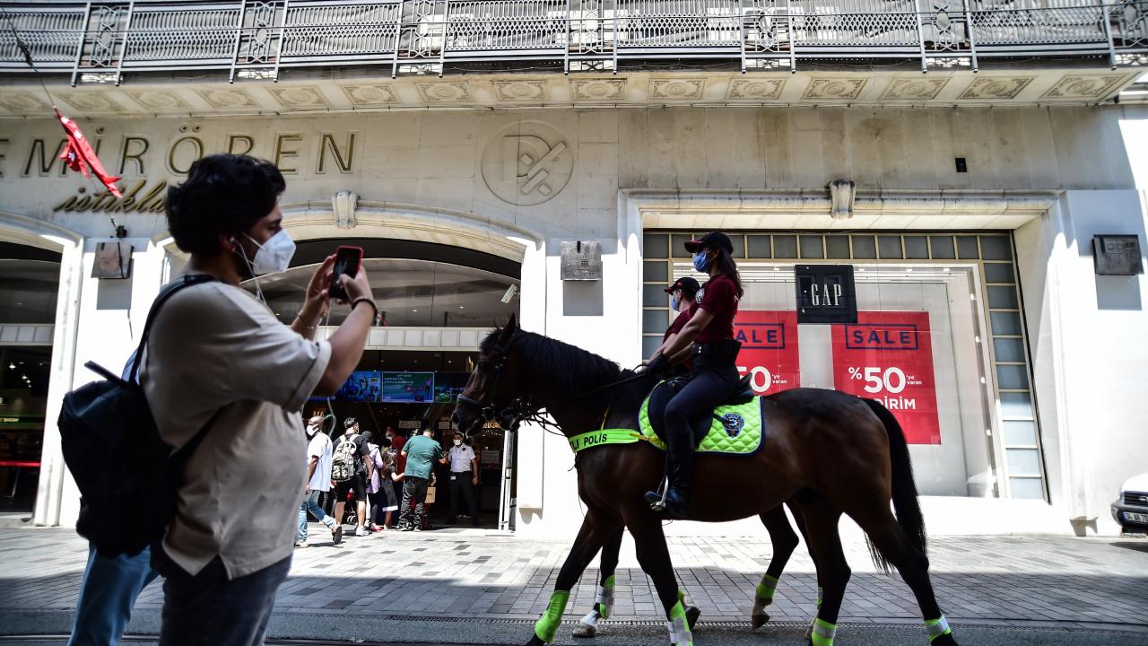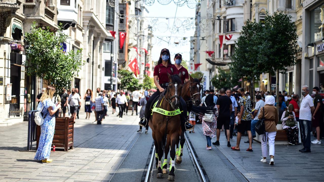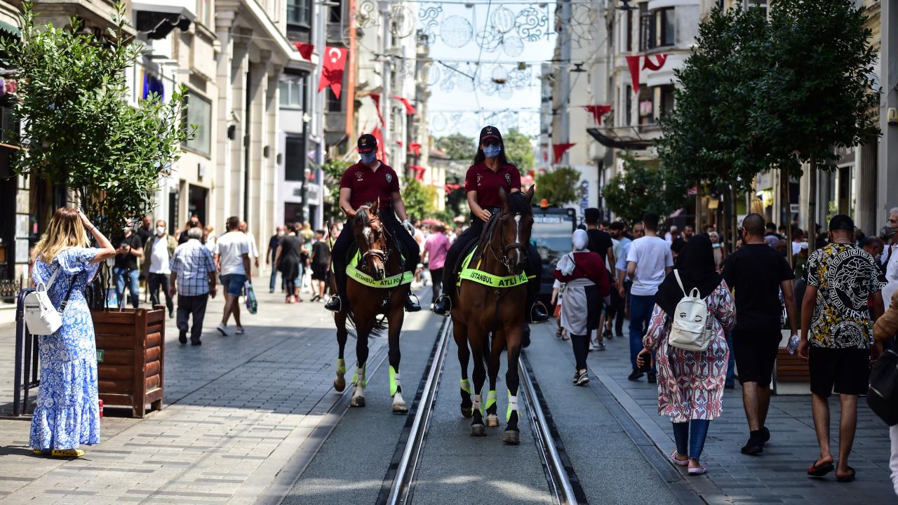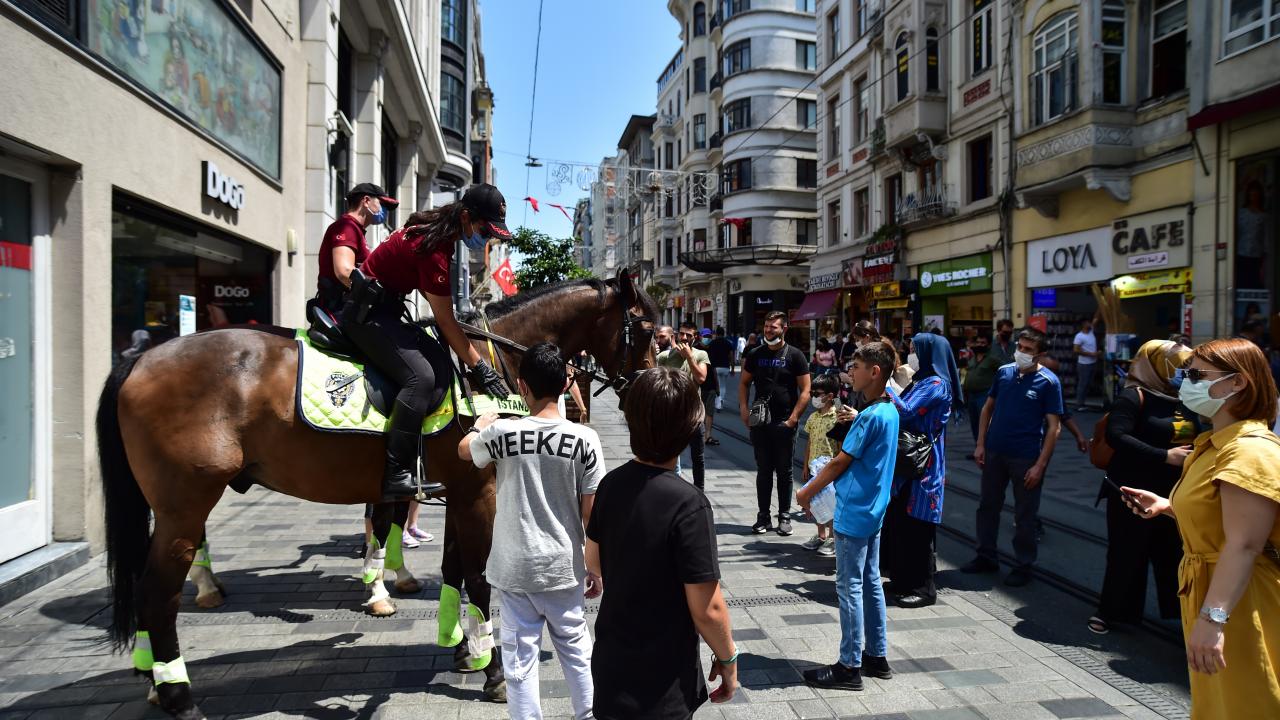 İstanbul Emniyet Müdürlüğüne bağlı atlı polisler İstiklal Caddesi’nde devriye gezdi. Cep telefonlarıyla görüntü çeken vatandaşlar ve turistler atlı polislere yoğun ilgi gösterdi.