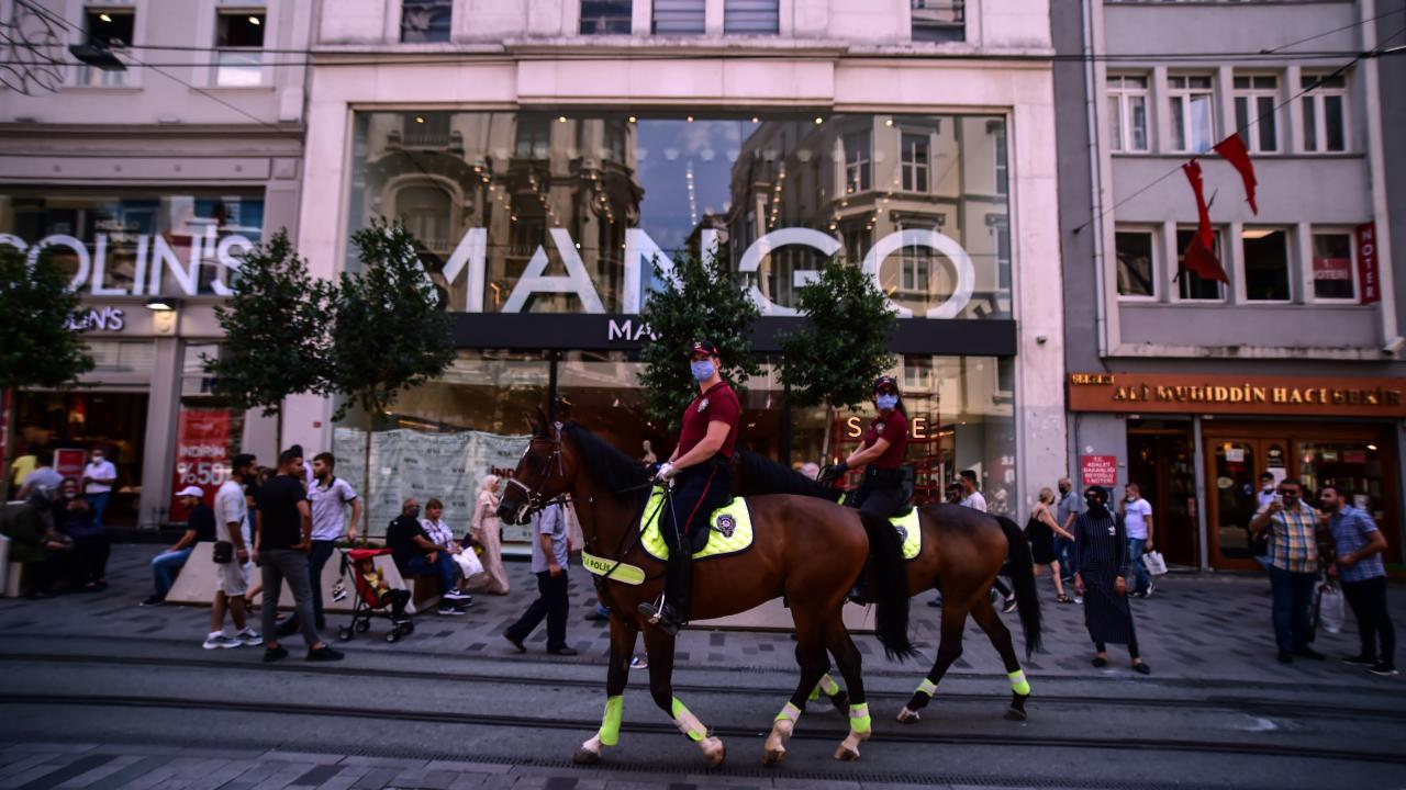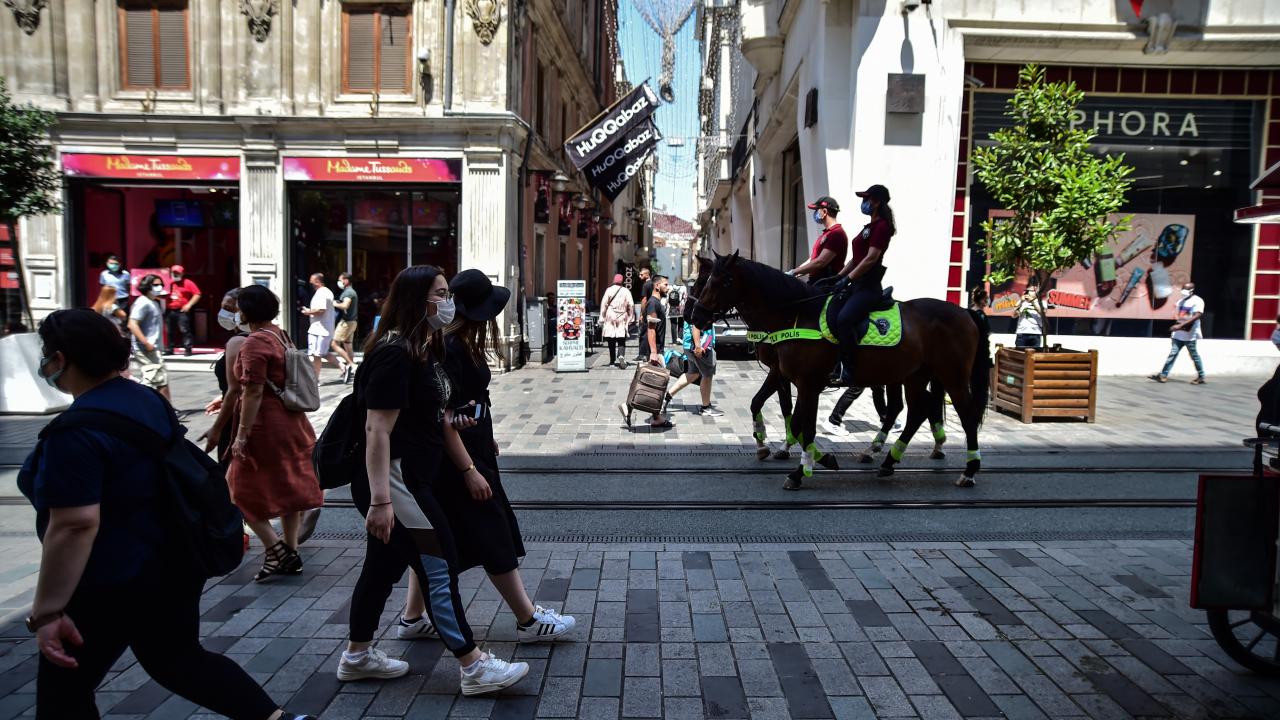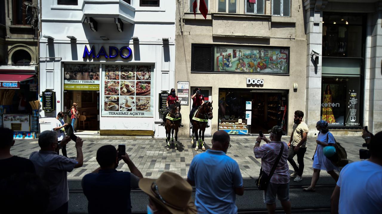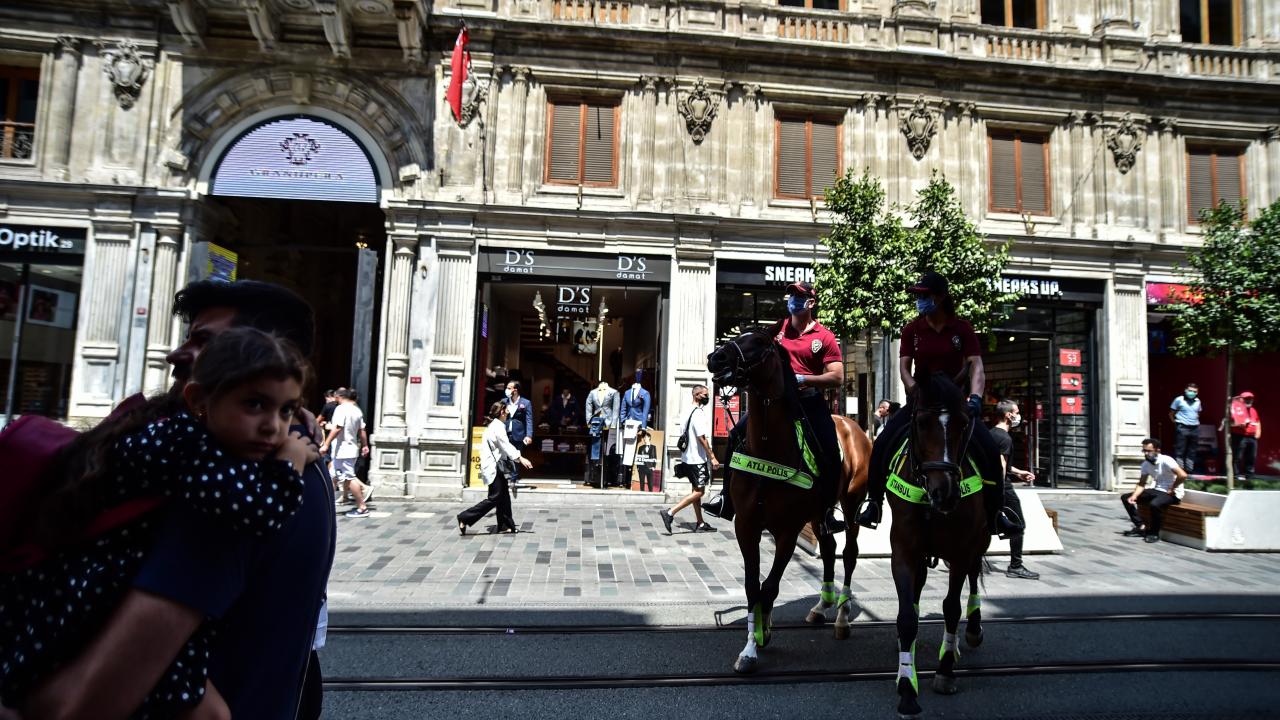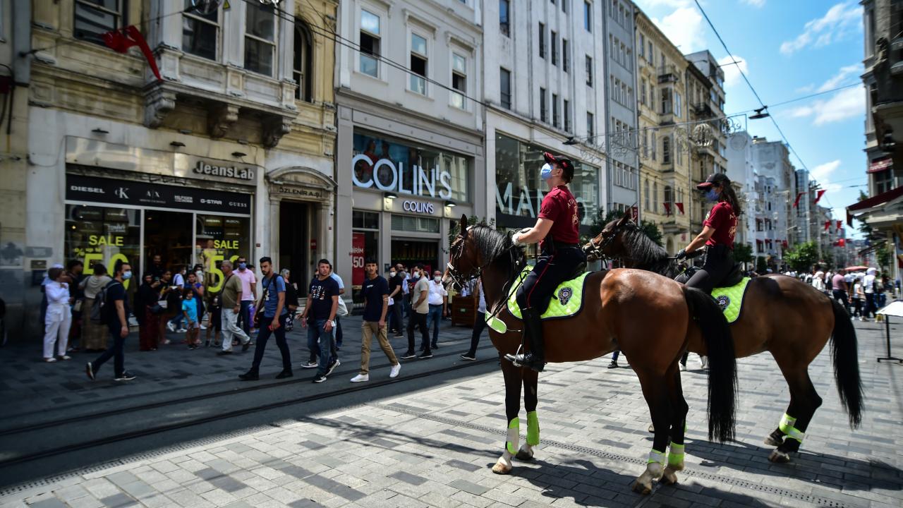 İstanbul Emniyet Müdürlüğüne bağlı atlı polisler İstiklal Caddesi’nde devriye gezdi. Cep telefonlarıyla görüntü çeken vatandaşlar ve turistler atlı polislere yoğun ilgi gösterdi.