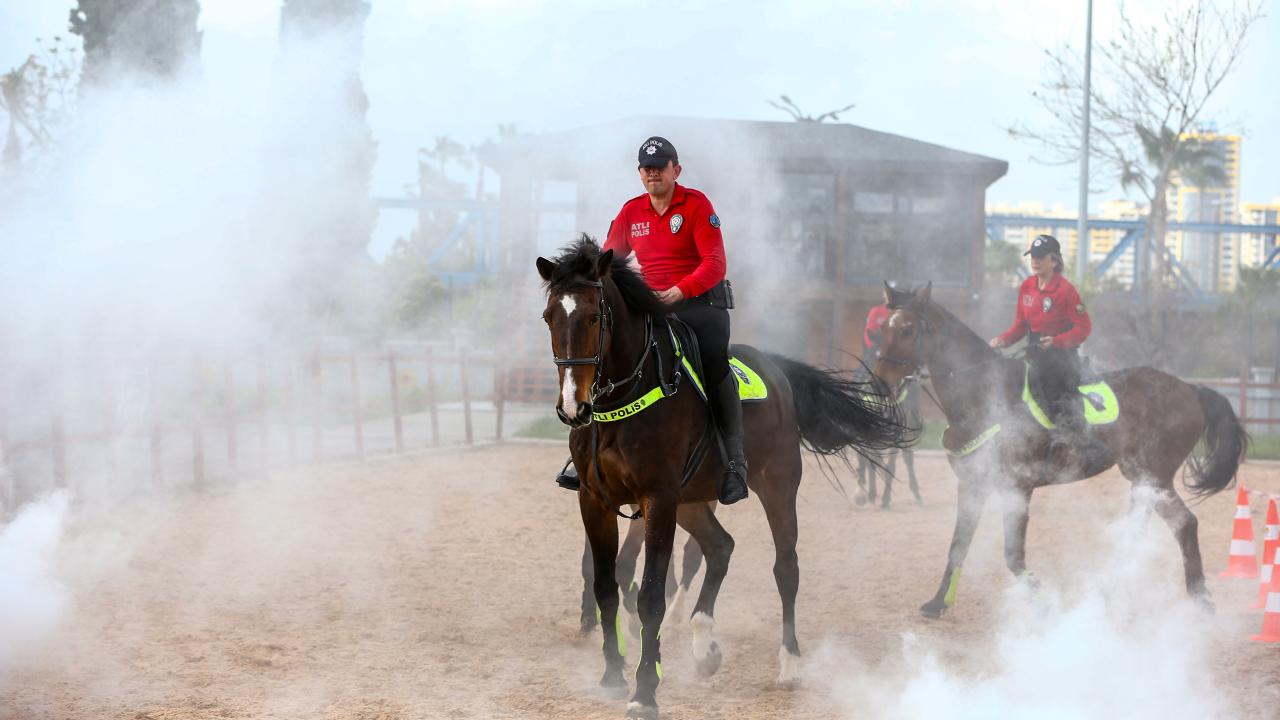 Sis ve ses bombalarının kullanıldığı tatbikatta, atların ani gelişen olaylarda ve yüksek sesli ortamlarda ürkmemeleri amacıyla çevresel faktörlere alıştırılması için çalışma yapıldı.