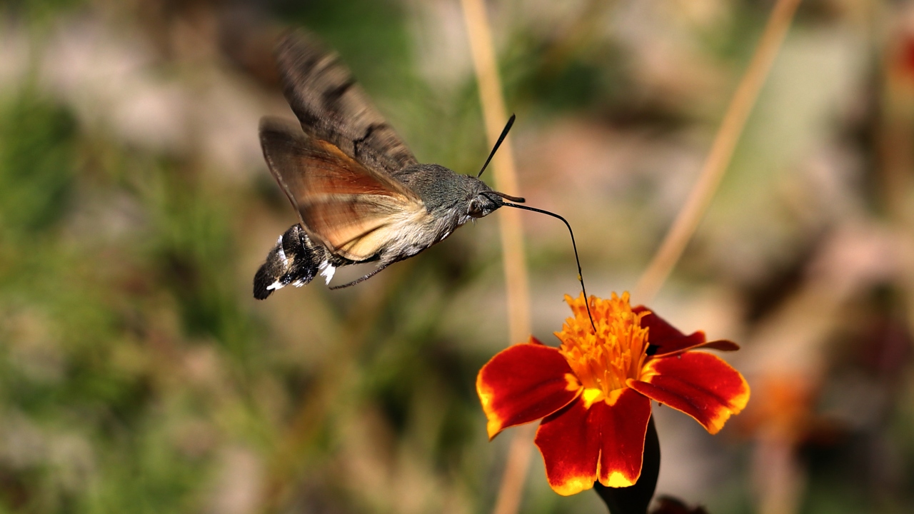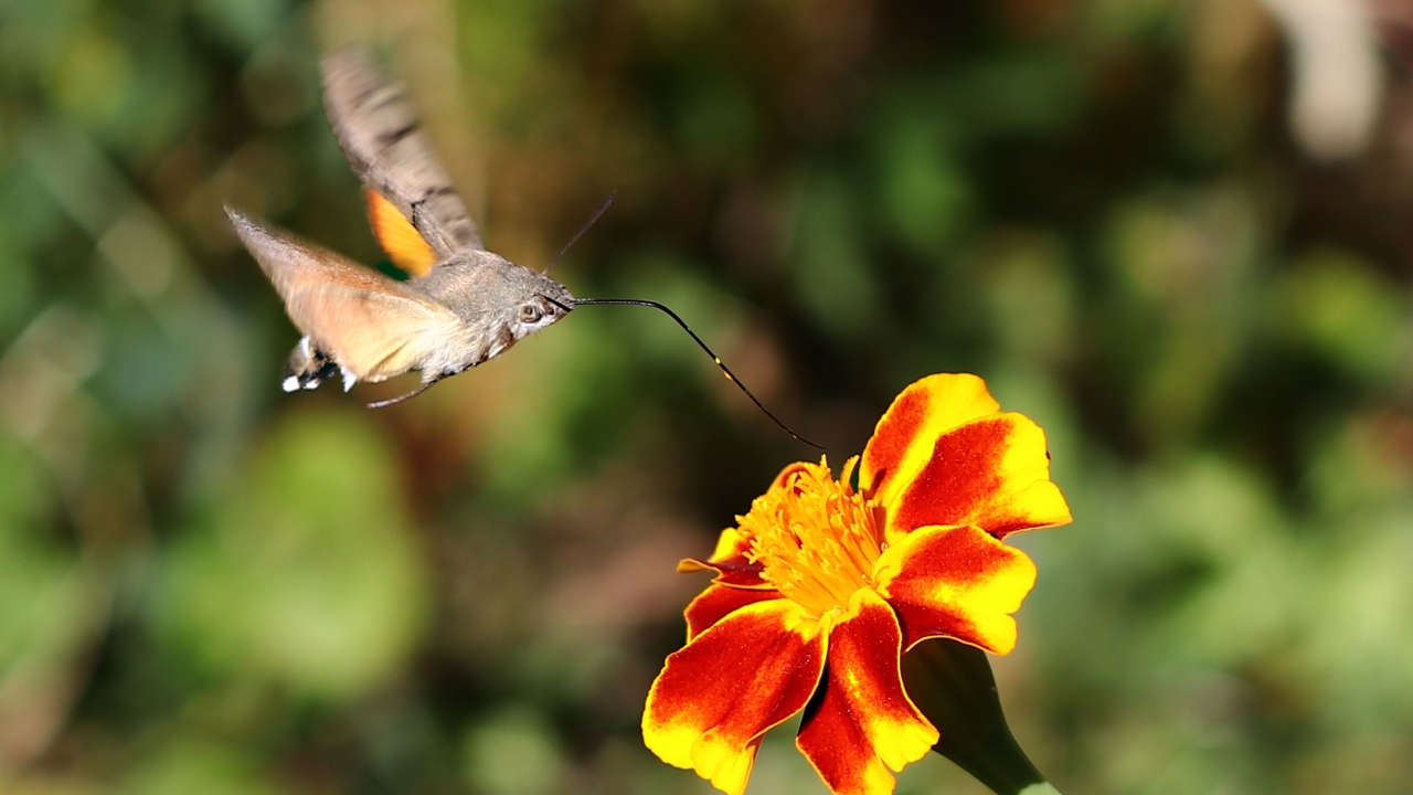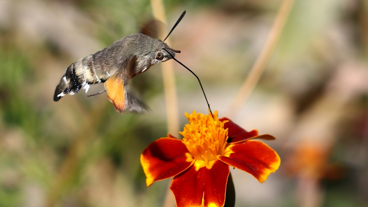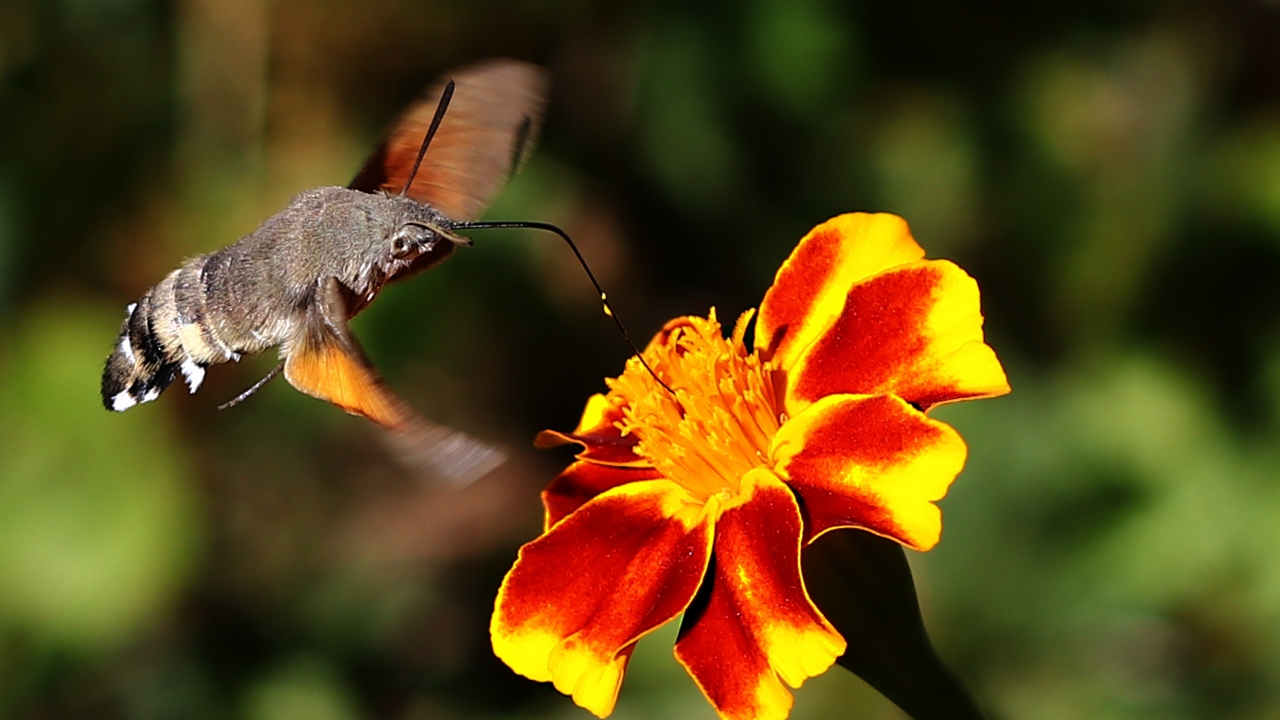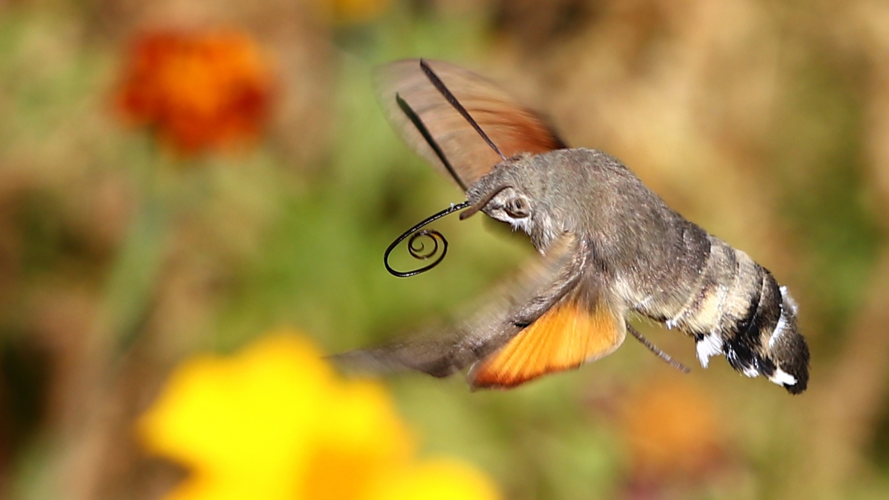 Atmaca güvesi hortumuyla çiçeklerdeki poleni çekiyor