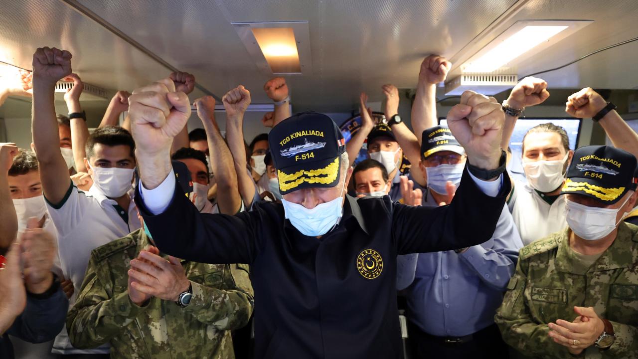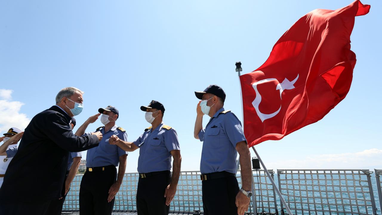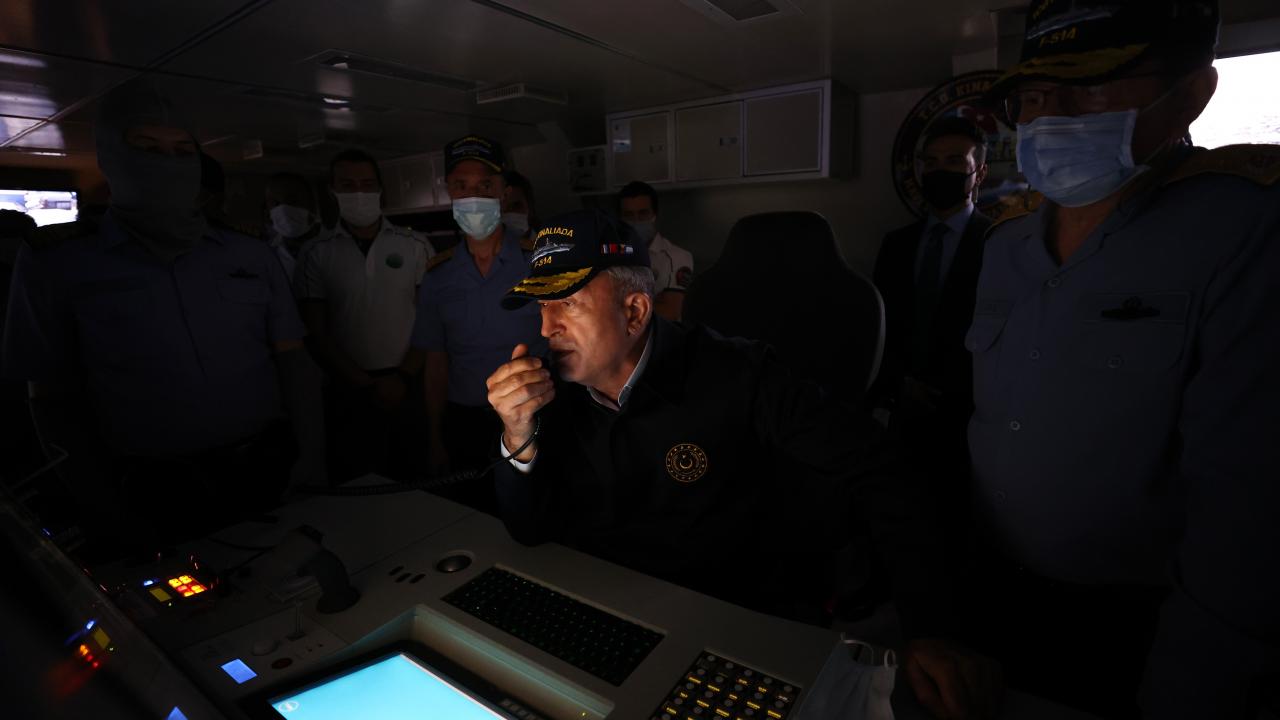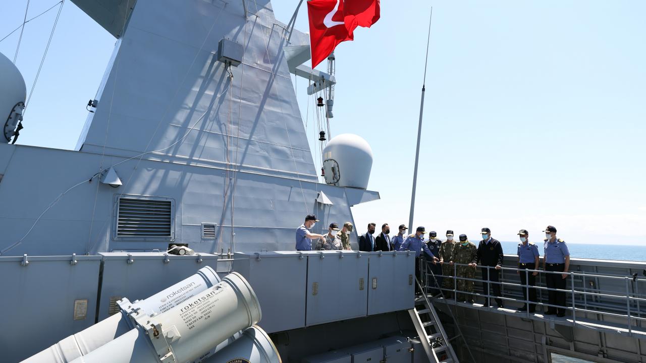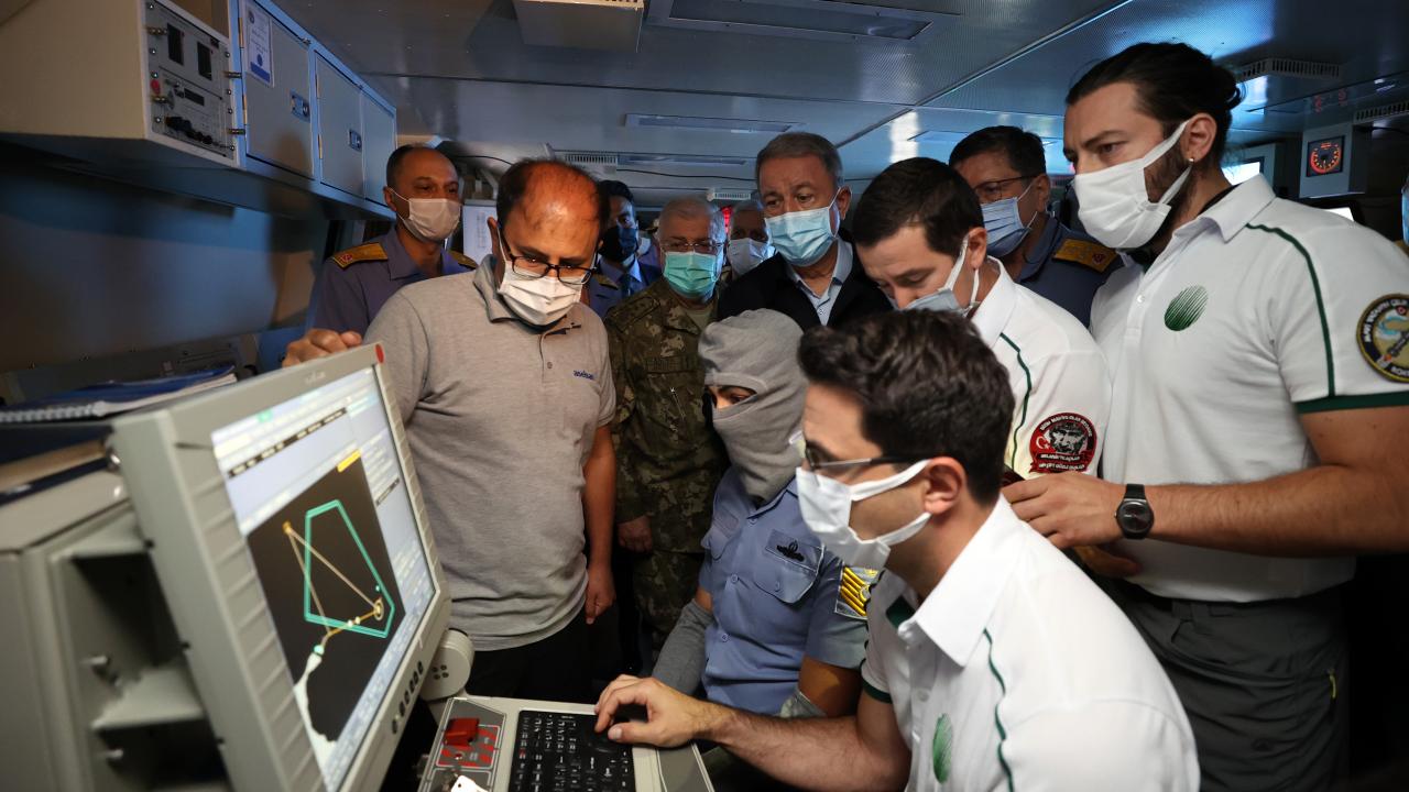 Atışın yapılacağı milli gemi TCG Kınalıada korvetinde Donanma Komutanı Oramiral Ercüment Tatlıoğlu tarafından karşılanan Akar ve komutanlara faaliyete ilişkin brifing verildi.