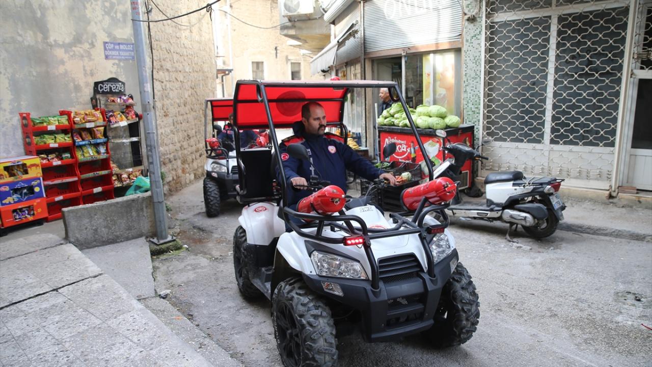 "ATV`lerin arka tarafında su pompalarımız var. Bunları hemen hemen her sokakta bulunan yangın musluklarına bağlıyoruz. Su motorunu çalıştırarak gerekli müdahaleyi yapıyoruz. Araçlarda 2 yangın tüpü ile yaklaşık 40 metreye müdahale edebilecek hortumlarımız mevcut. Şehrimizdeki dar sokaklarına normal itfaiye araçlarının sığmaması nedeniyle bu araçları tasarladık. Çok daha rahat hareket edebiliyoruz. Bu araçlarla, yangın komuta merkezinden Habib-i Neccar Dağı eteklerine ulaşmamız yaklaşık 6 dakika sürüyor."