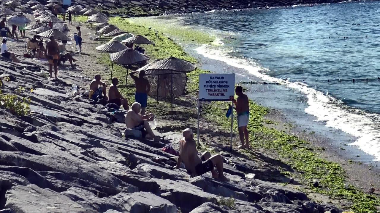 Yosunlar nedeniyle denize çok az sayıda kişi girerken, gelenler gölgelik alanda oturmayı veya güneşlenmeyi tercih etti.