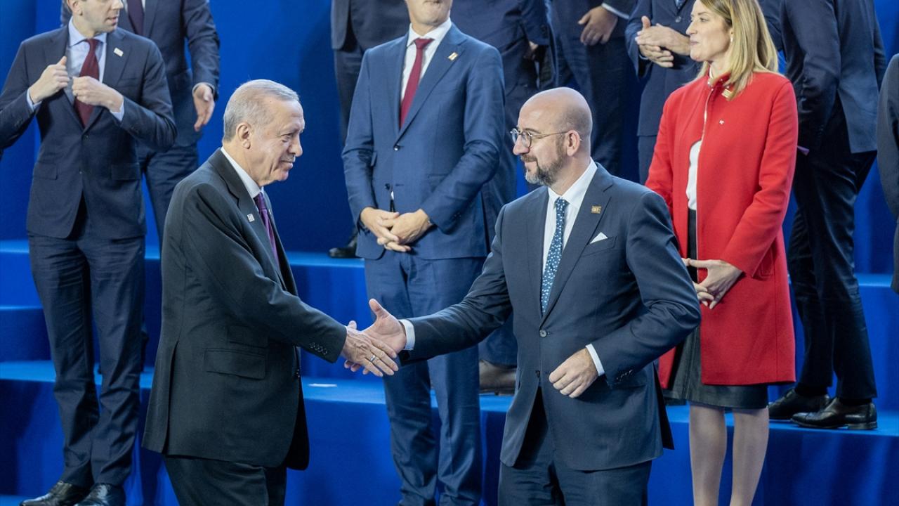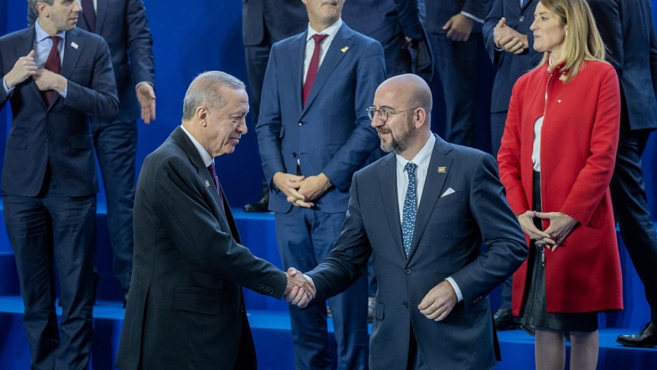 Cumhurbaşkanı Erdoğan, AB Konseyi Başkanı Charles Michel ile selamlaştı.