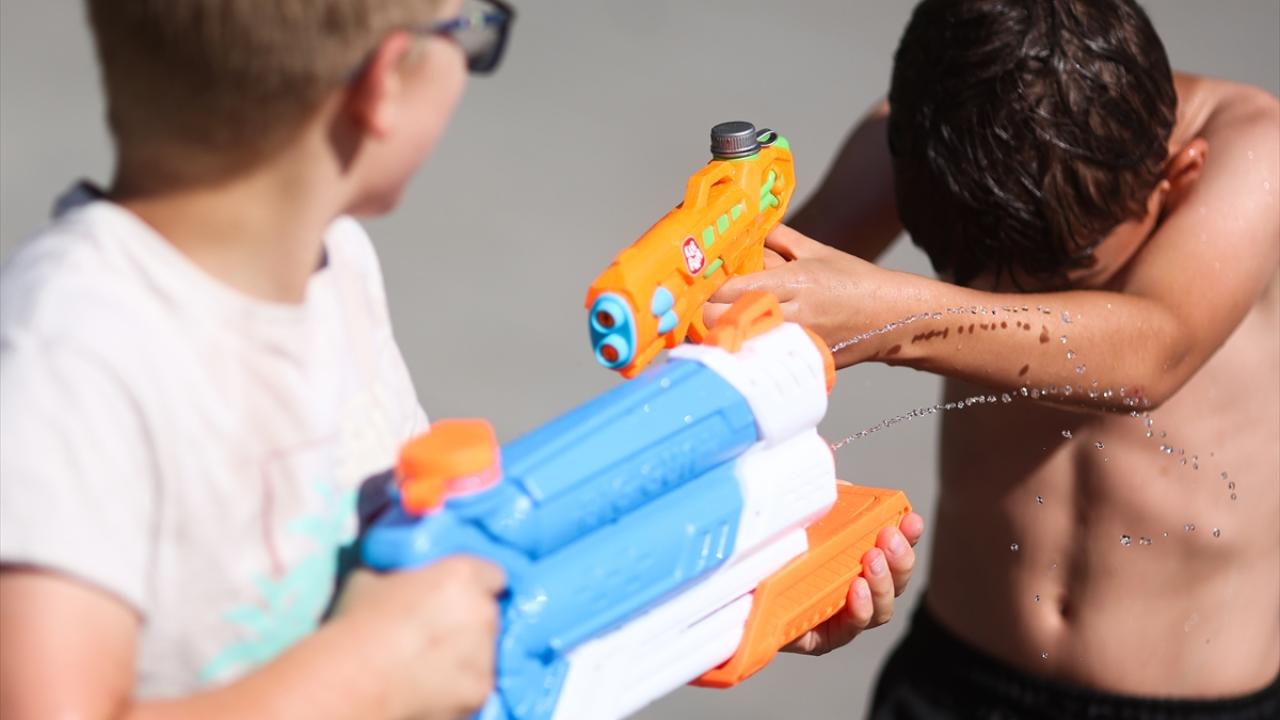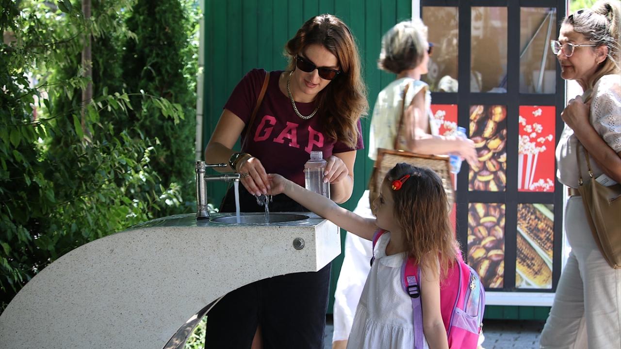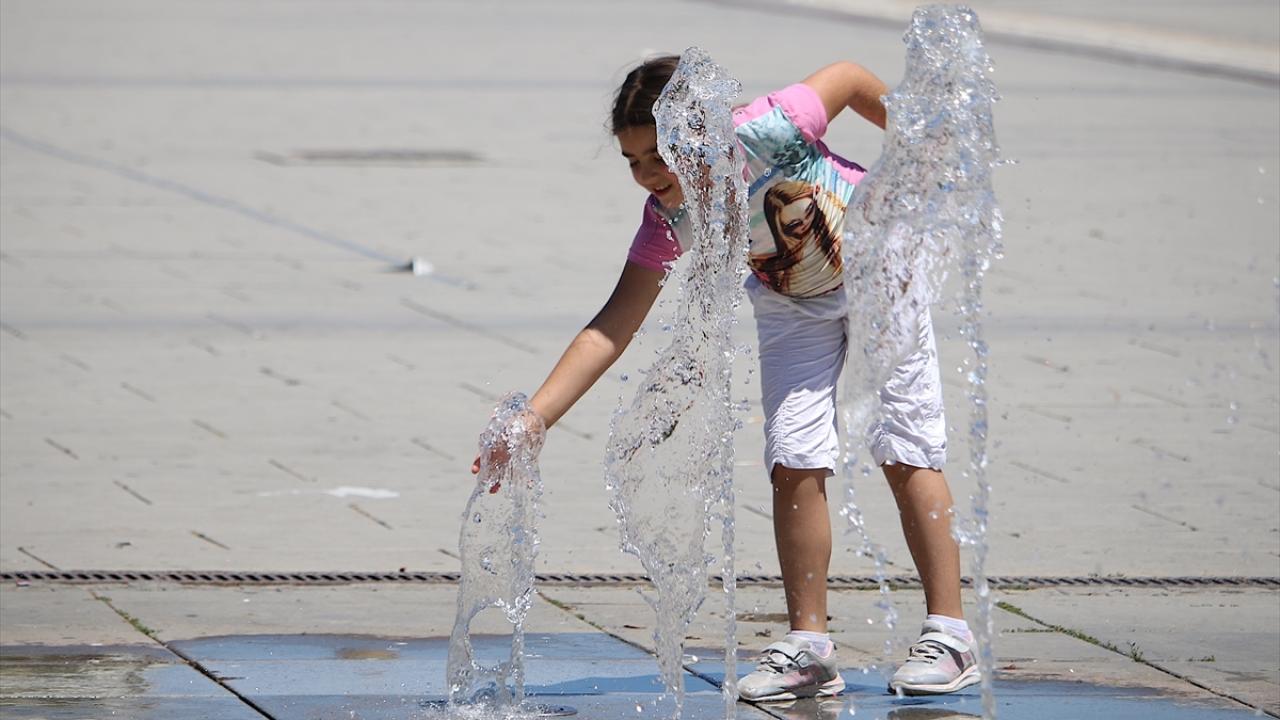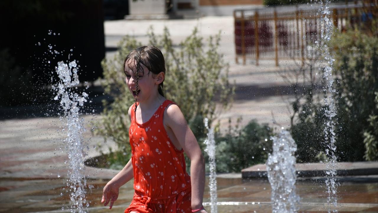 Şehirde halk, su püskürten çeşmelerle serinlemeye çalışıyor.
